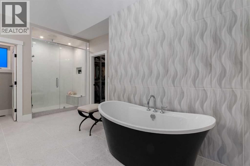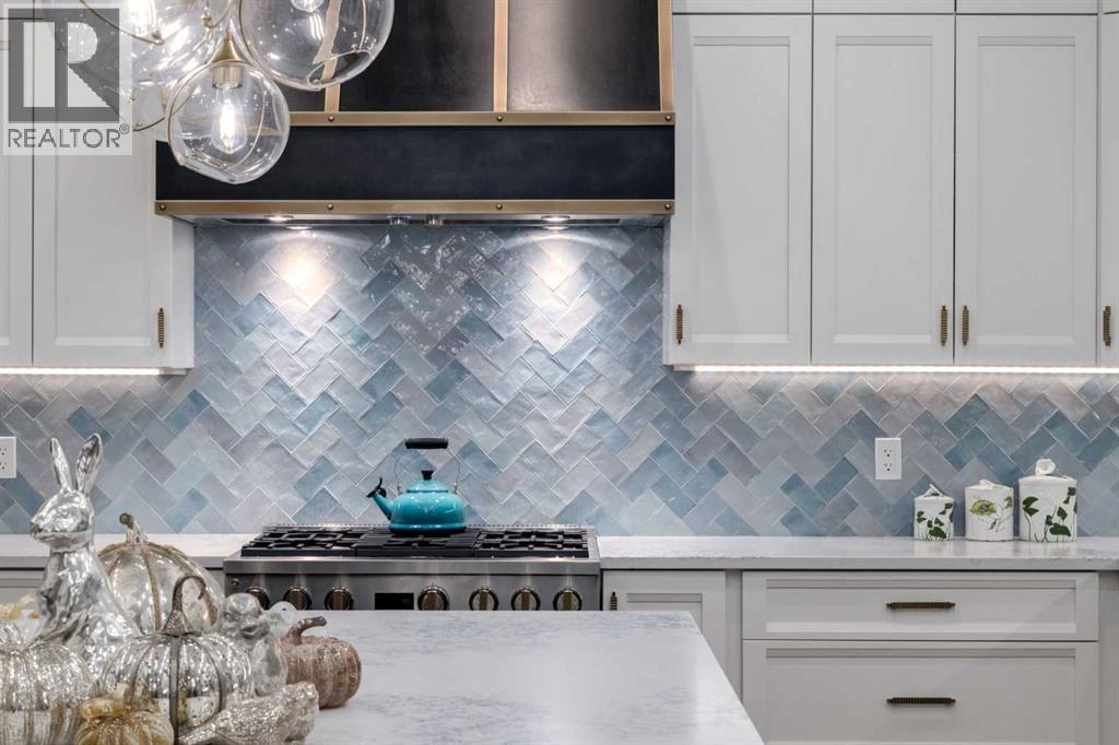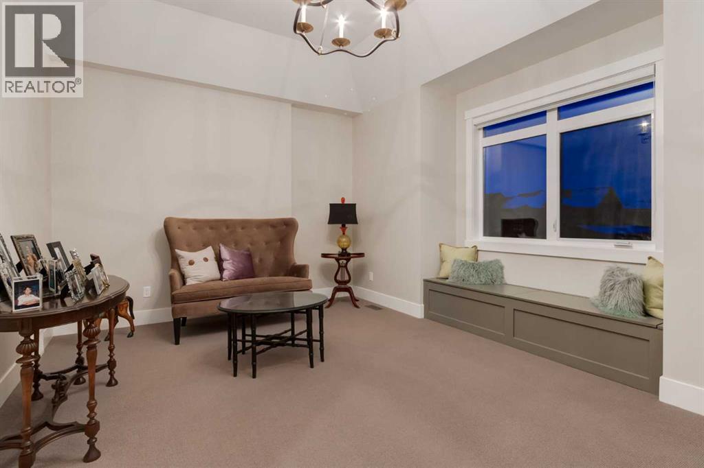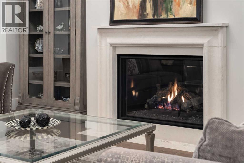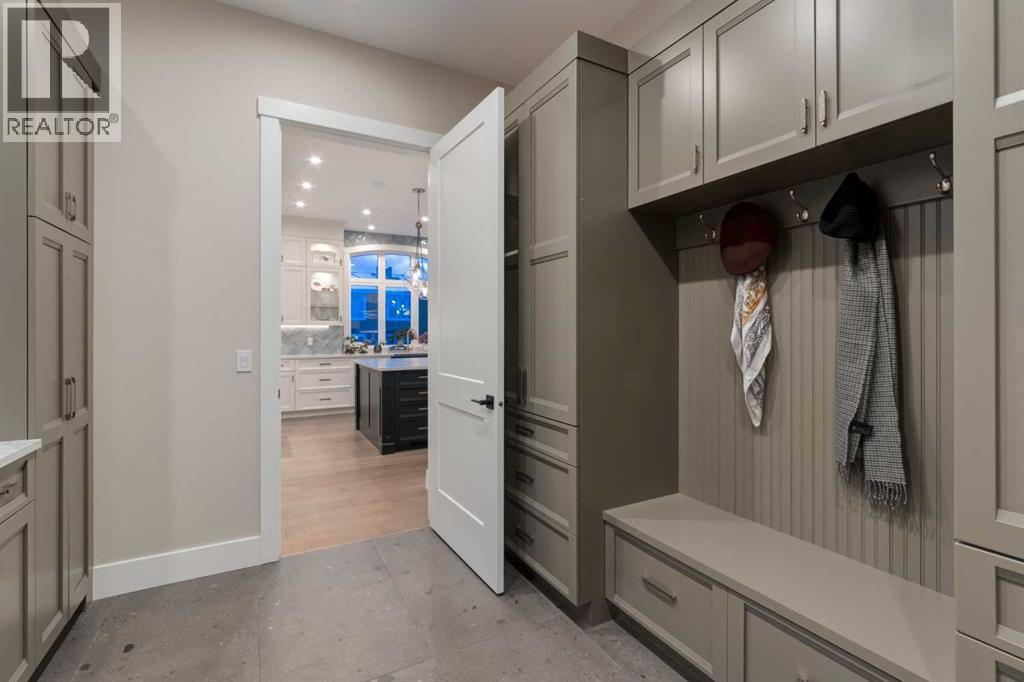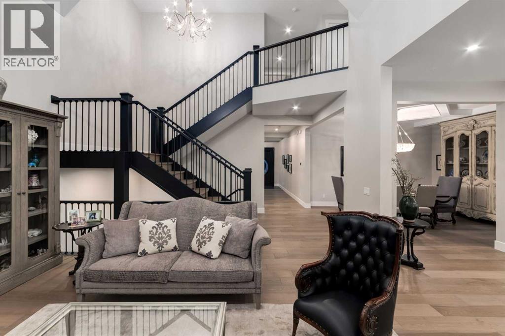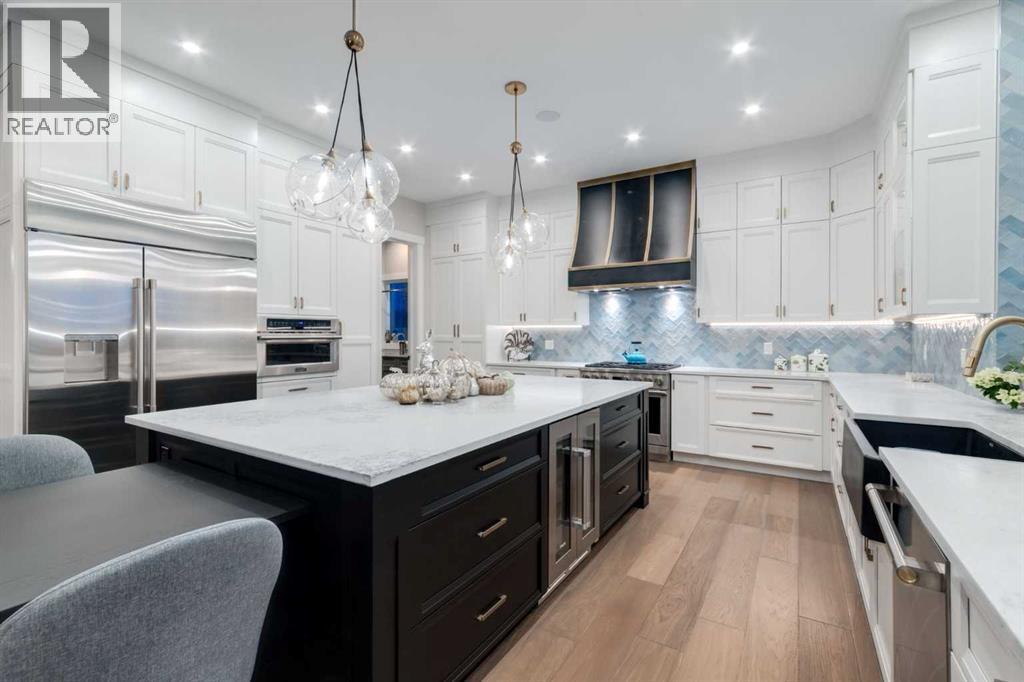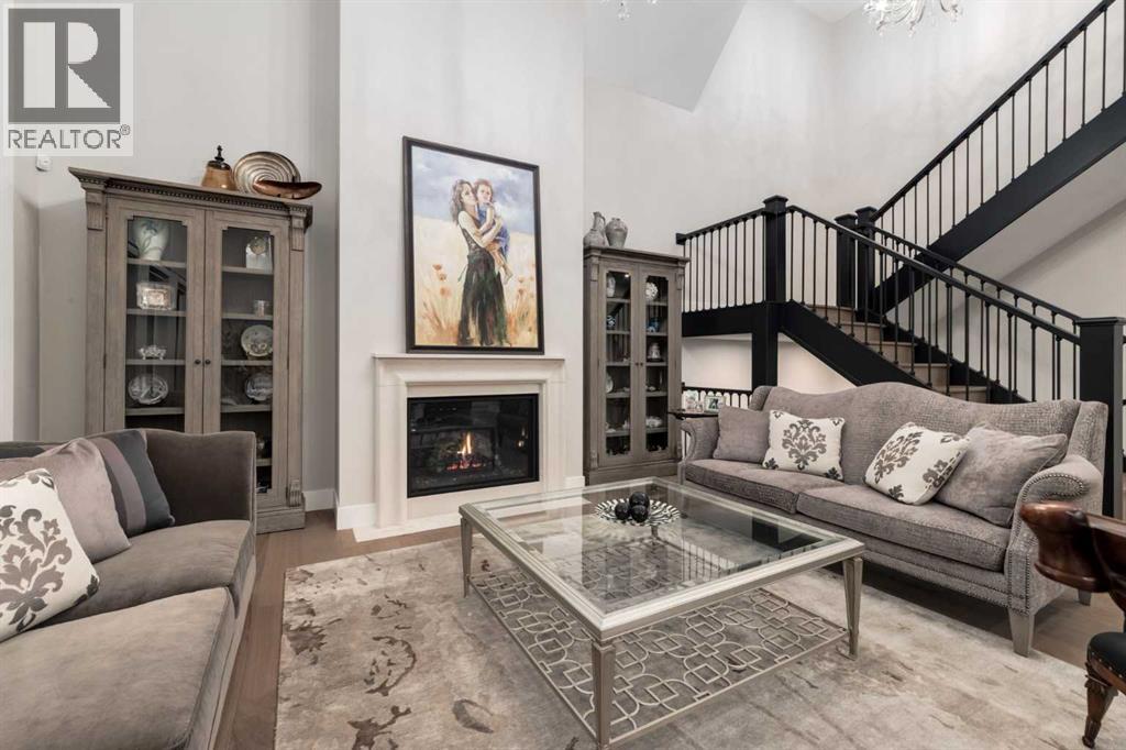 Masterfully executed in a transitional design style, this exquisite Family Home showcases nearly 5,500 sf of impeccable luxury defined by unparalleled craftsmanship and the highest quality of finishes throughout, including an ELEVATOR for easy accessibility to all three floors. The exterior architecture exudes a timeless appeal from the peaked rooflines to the "eyebrow" detailing to the rich stone accents, incredible window designs, a front veranda & upper balcony, and a striking "piece de resistance" front door. The beautifully landscaped front and back gardens impress with perfectly manicured flower beds, and a textural mélange of shrubs and trees. The home's layout is outstanding, while the interior design elements leave a lasting impression on the most discerning "eye for design". The main floor boasts soaring ceiling heights with coffered detailing, impressive, large windows flooding the interior with streams of natural light, custom millwork designs, beautiful, wide-plank hardwood floors, timeless floor and backsplash tile designs, and last but not least, exquisite "Schonbek" chandeliers. The grand, light-filled great room features a magnificent fireplace. It is open to the decadent kitchen and an elegant dining room perfectly suited to hosting dinner parties for family and friends. The front study offers complete privacy and leads to a unique "plant sunroom". The custom-designed kitchen is a chef's dream featuring high-end appliances, ample storage with pullout units, a gigantic center island, timeless quartz countertops, a coveted "Hammersmith" range hood, and last but not least, an impressive chevron pattern backsplash design executed with the utmost precision. Beautifully custom-designed stairs ascend to the upper level complete with three bedrooms and a bonus room, perfectly suited for the children's play area, a TV/games room, or a study room. The master suite is a luxurious retreat complete with wool carpeting, a showpiece chandelier, its own West-facin g balcony and a lavish spa-like ensuite and "dressing room" - a fashionista's dream. Each of the children's bedrooms offers its own chic ensuite bath. The lower level is a true "entertaining haven" featuring a family/TV room that opens onto a private patio area, a wet bar complete with custom furniture-piece units, a wine room, three additional bedrooms, one of which being designated as an exercise room, a full bathroom and a large storage/cold room area. The double and single garage spaces are heated. The single garage is complete with 220 V wiring to allow for an EV charging station. The monthly HOA fees include front yard maintenance, including weekly mowing/trimming; weekly curbside garbage/recycling pickup; snow removal on the streets, sidewalks, pathways & the central plaza; maintenance of the central plaza, cascading ponds, outdoor kitchen, and playgrounds. Please refer to the community website for a wealth of information. MUST BE SEEN! (id:63190)