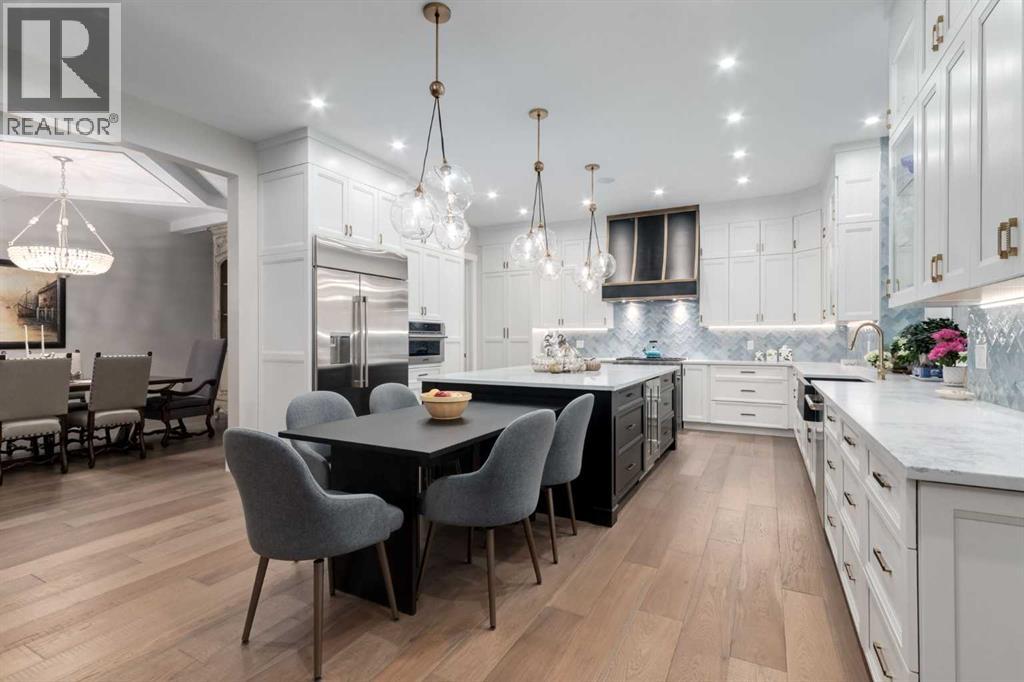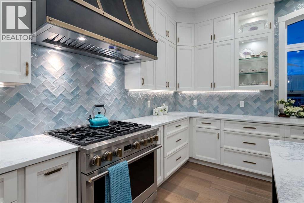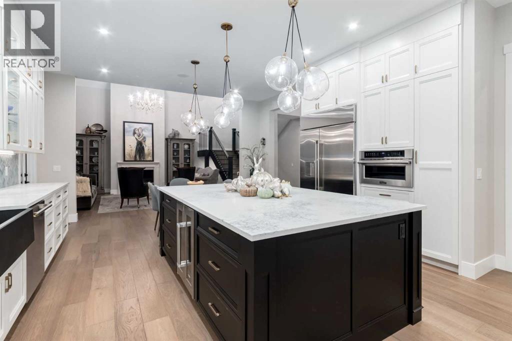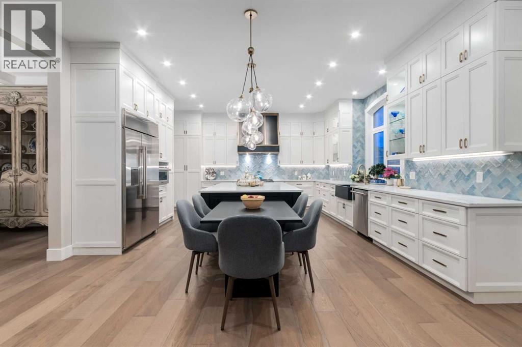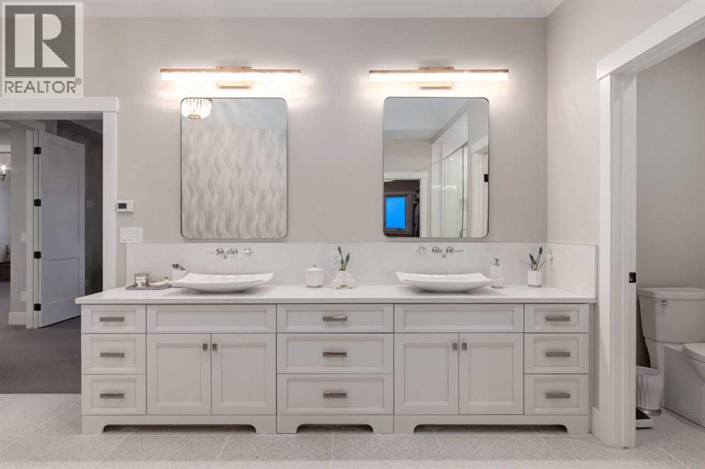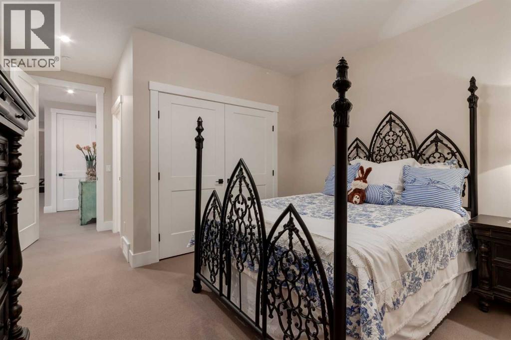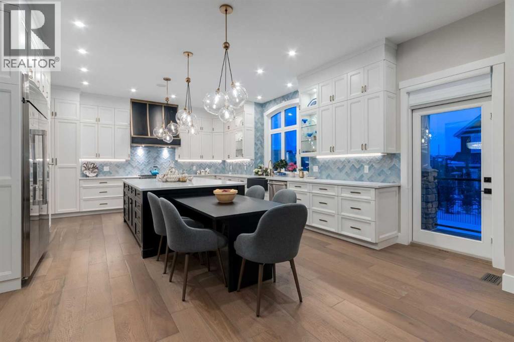Masterfully executed in a transitional design style, this exquisite Family Home showcases nearly 5,500 sf of impeccable luxury defined by unparalleled craftsmanship and the highest quality of finishes throughout, including an ELEVATOR for easy accessibility to all three floors. The exterior architecture exudes a timeless appeal from the peaked rooflines to the "eyebrow" detailing to the rich stone accents, incredible window designs, a front veranda & upper balcony, and a striking "piece de resistance" front door. The beautifully landscaped front and back gardens impress with perfectly manicured flower beds, and a textural mélange of shrubs and trees. The home's layout is outstanding, while the interior design elements leave a lasting impression on the most discerning "eye for design". The main floor boasts soaring ceiling heights with coffered detailing, impressive, large windows flooding the interior with streams of natural light, custom millwork designs, beautiful, wide-plank hardwood floors, timeless floor and backsplash tile designs, and last but not least, exquisite "Schonbek" chandeliers. The grand, light-filled great room features a magnificent fireplace. It is open to the decadent kitchen and an elegant dining room perfectly suited to hosting dinner parties for family and friends. The front study offers complete privacy and leads to a unique "plant sunroom". The custom-designed kitchen is a chef's dream featuring high-end appliances, ample storage with pullout units, a gigantic center island, timeless quartz countertops, a coveted "Hammersmith" range hood, and last but not least, an impressive chevron pattern backsplash design executed with the utmost precision. Beautifully custom-designed stairs ascend to the upper level complete with three bedrooms and a bonus room, perfectly suited for the children's play area, a TV/games room, or a study room. The master suite is a luxurious retreat complete with wool carpeting, a showpiece chandelier, its own West-facin g balcony and a lavish spa-like ensuite and "dressing room" - a fashionista's dream. Each of the children's bedrooms offers its own chic ensuite bath. The lower level is a true "entertaining haven" featuring a family/TV room that opens onto a private patio area, a wet bar complete with custom furniture-piece units, a wine room, three additional bedrooms, one of which being designated as an exercise room, a full bathroom and a large storage/cold room area. The double and single garage spaces are heated. The single garage is complete with 220 V wiring to allow for an EV charging station. The monthly HOA fees include front yard maintenance, including weekly mowing/trimming; weekly curbside garbage/recycling pickup; snow removal on the streets, sidewalks, pathways & the central plaza; maintenance of the central plaza, cascading ponds, outdoor kitchen, and playgrounds. Please refer to the community website for a wealth of information. MUST BE SEEN! (id:63190)