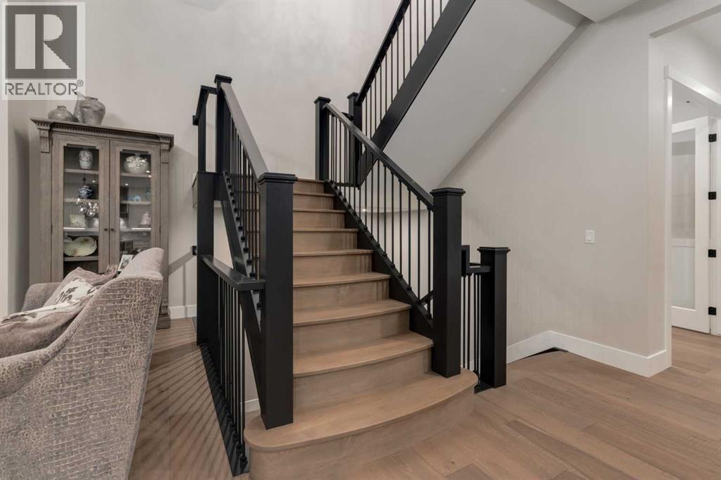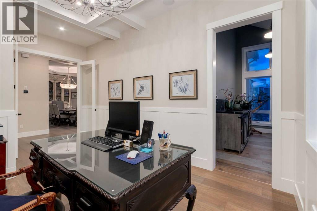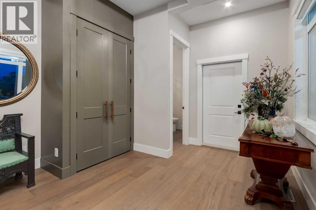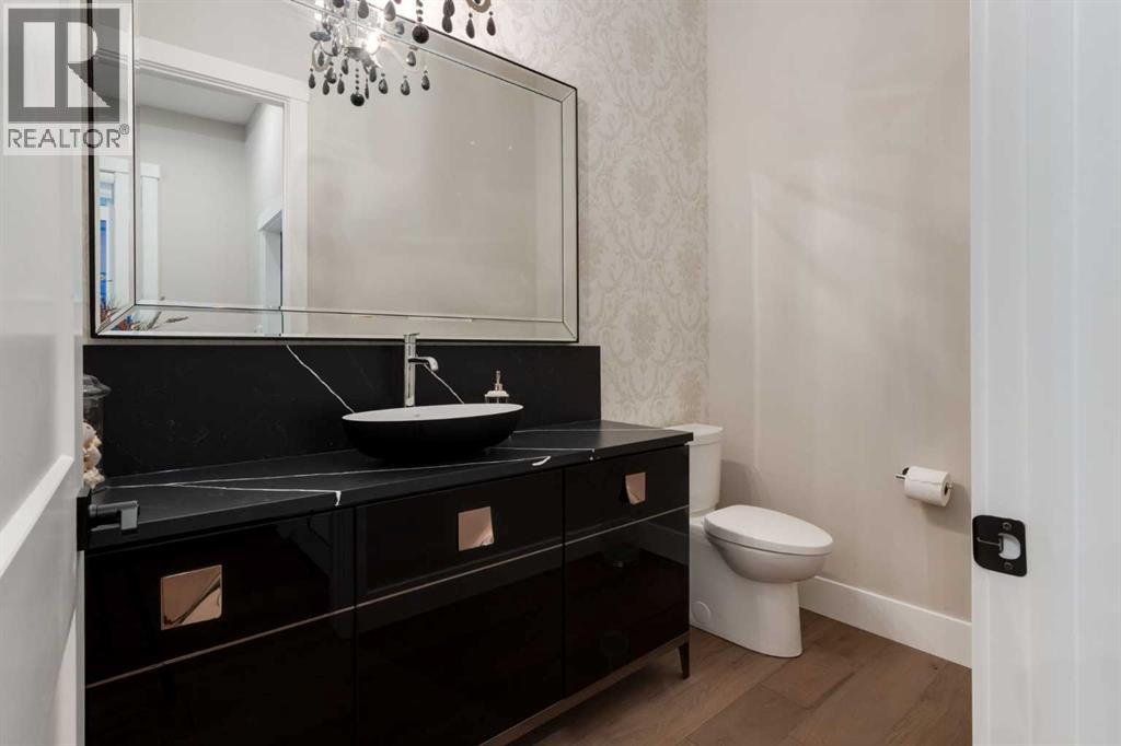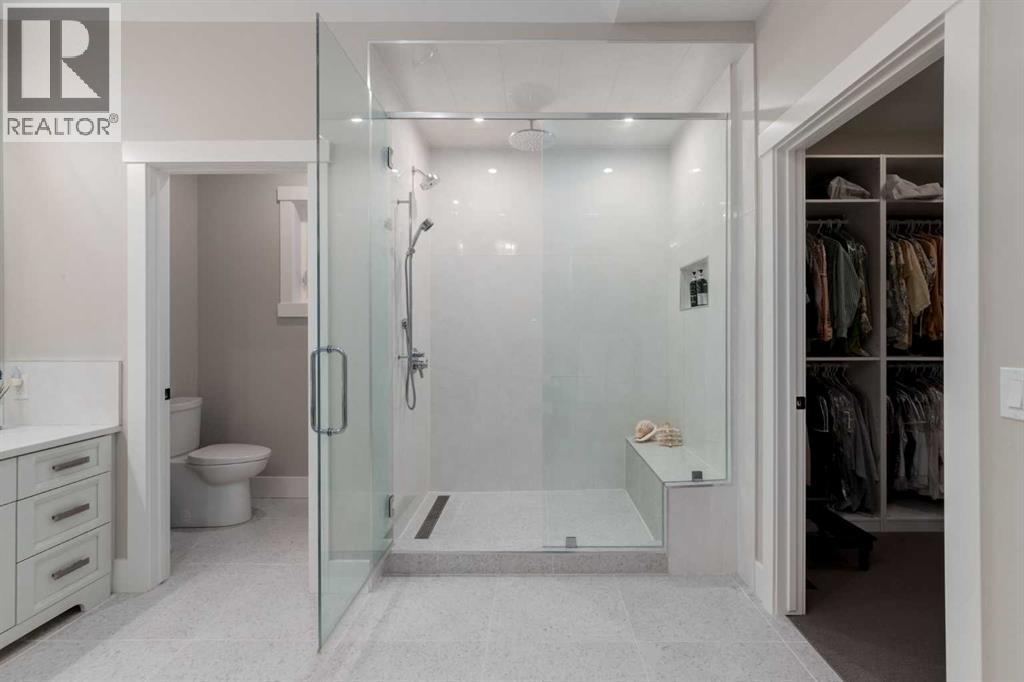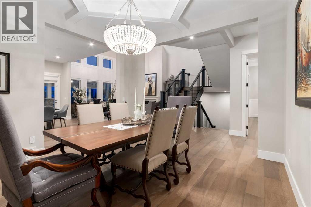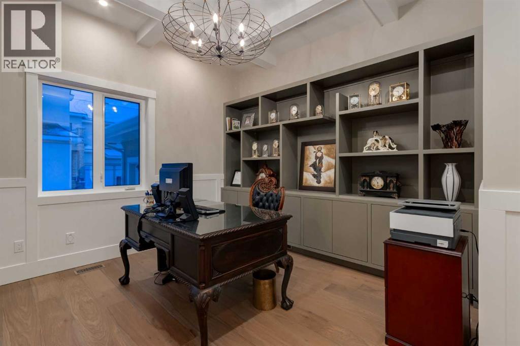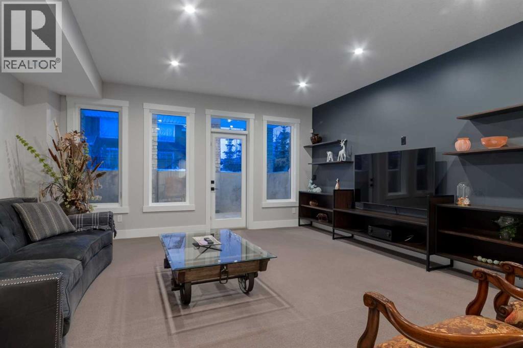 Masterfully executed in a transitional design style, this exquisite Family Home showcases nearly 5,500 sf of impeccable luxury defined by unparalleled craftsmanship and the highest quality of finishes throughout, including an ELEVATOR for easy accessibility to all three floors. The exterior architecture exudes a timeless appeal from the peaked rooflines to the "eyebrow" detailing to the rich stone accents, incredible window designs, a front veranda & upper balcony, and a striking "piece de resistance" front door. The beautifully landscaped front and back gardens impress with perfectly manicured flower beds, and a textural mélange of shrubs and trees. The home's layout is outstanding, while the interior design elements leave a lasting impression on the most discerning "eye for design". The main floor boasts soaring ceiling heights with coffered detailing, impressive, large windows flooding the interior with streams of natural light, custom millwork designs, beautiful, wide-plank hardwood floors, timeless floor and backsplash tile designs, and last but not least, exquisite "Schonbek" chandeliers. The grand, light-filled great room features a magnificent fireplace. It is open to the decadent kitchen and an elegant dining room perfectly suited to hosting dinner parties for family and friends. The front study offers complete privacy and leads to a unique "plant sunroom". The custom-designed kitchen is a chef's dream featuring high-end appliances, ample storage with pullout units, a gigantic center island, timeless quartz countertops, a coveted "Hammersmith" range hood, and last but not least, an impressive chevron pattern backsplash design executed with the utmost precision. Beautifully custom-designed stairs ascend to the upper level complete with three bedrooms and a bonus room, perfectly suited for the children's play area, a TV/games room, or a study room. The master suite is a luxurious retreat complete with wool carpeting, a showpiece chandelier, its own West-facin g balcony and a lavish spa-like ensuite and "dressing room" - a fashionista's dream. Each of the children's bedrooms offers its own chic ensuite bath. The lower level is a true "entertaining haven" featuring a family/TV room that opens onto a private patio area, a wet bar complete with custom furniture-piece units, a wine room, three additional bedrooms, one of which being designated as an exercise room, a full bathroom and a large storage/cold room area. The double and single garage spaces are heated. The single garage is complete with 220 V wiring to allow for an EV charging station. The monthly HOA fees include front yard maintenance, including weekly mowing/trimming; weekly curbside garbage/recycling pickup; snow removal on the streets, sidewalks, pathways & the central plaza; maintenance of the central plaza, cascading ponds, outdoor kitchen, and playgrounds. Please refer to the community website for a wealth of information. MUST BE SEEN! (id:63190)