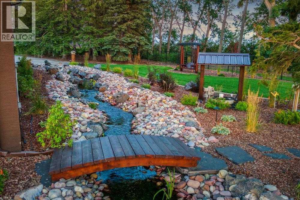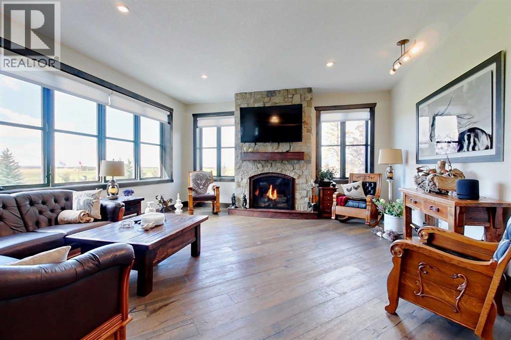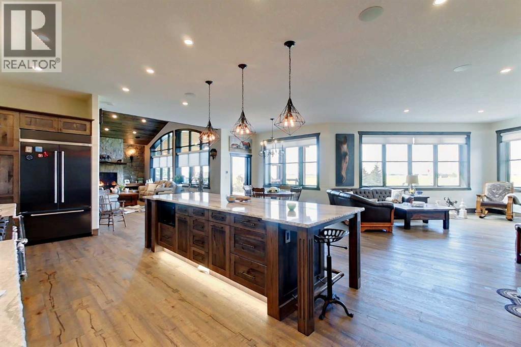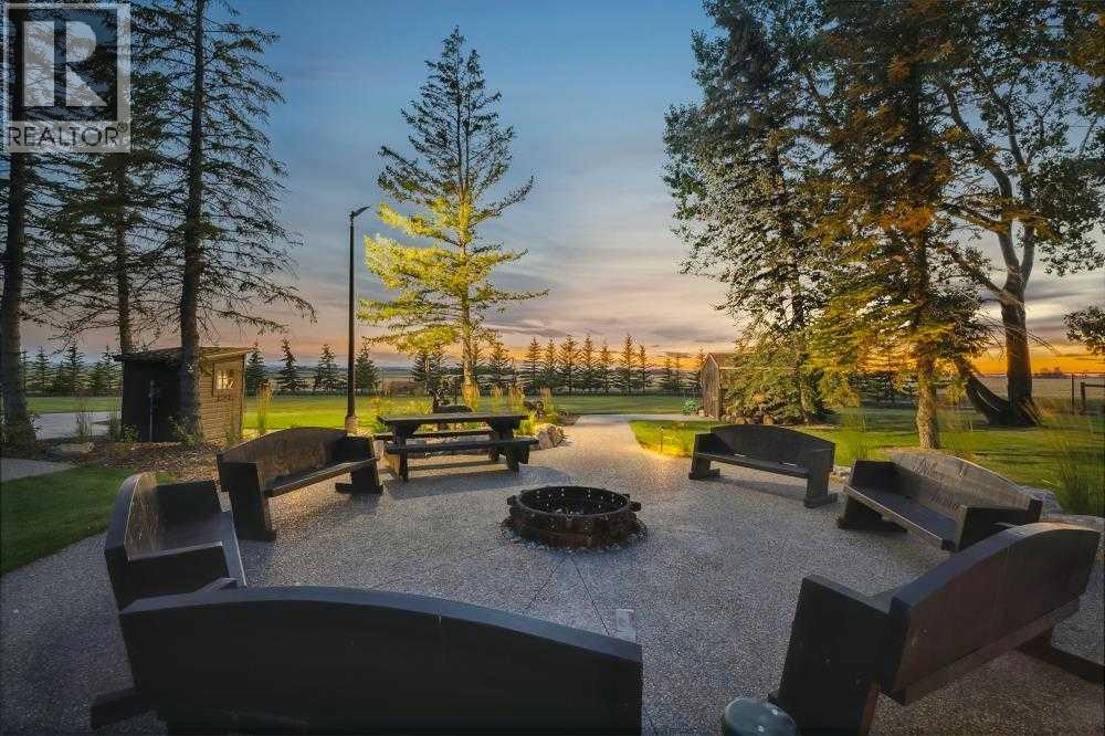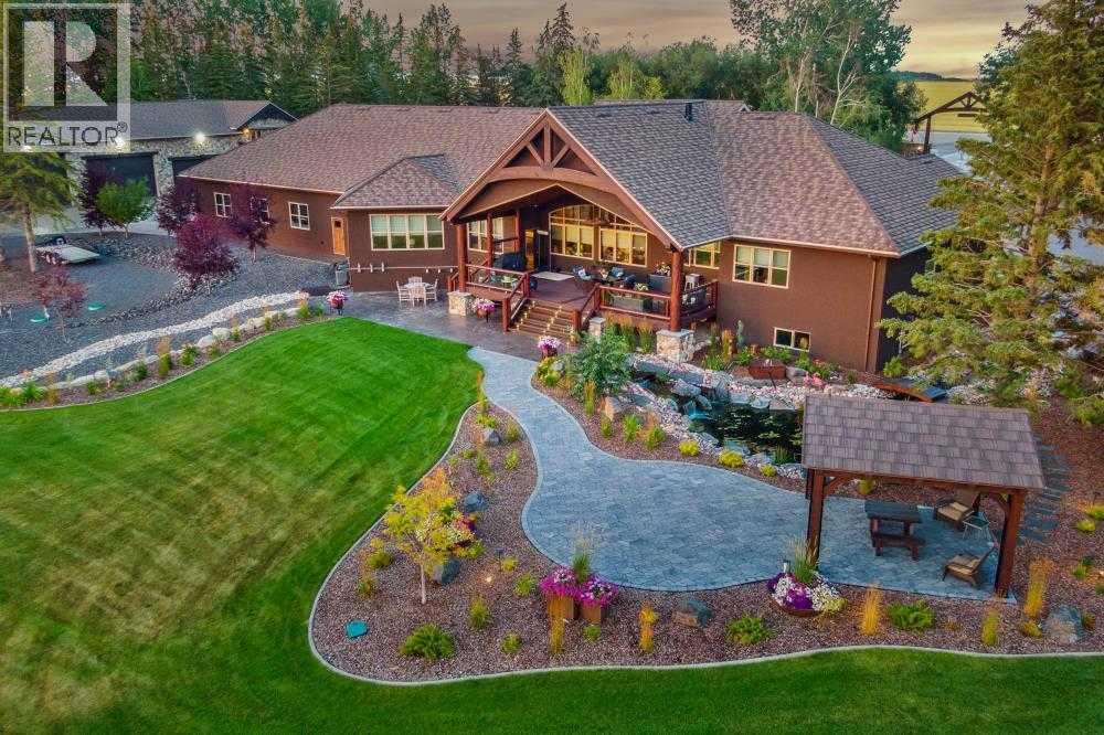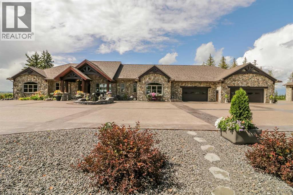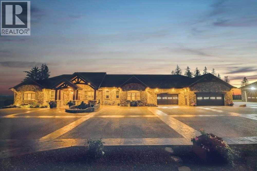 EXECUTIVE ACREAGE WITH STUNNING MOUNTAIN VIEWS AND A PARKLIKE SETTING! First time offered for sale and extremely rare opportunity to purchase this pristine 5.21 +/- Acres Located Just mins South of Olds on pavement. This is the perfect central Alberta location with Less than a 1hr drive to the Calgary airport and just 40 mins to Red Deer. The entire property sends a majestic mountain lodge feel where nature, towering trees, mature landscaping, gardens, family fire pit area, wide open spaces with waterfalls & streams soothe the soul. Executive touches greet you at the impressive main entrance with beautiful timbers, stonework, wrought iron fencing and over 46000 sqft (over 1 acre) of concrete driveway and stamped concrete edging inlays. The sprawling 3690sqft bungalow is loaded with features and class. Built with ICF Block foundation and a top of line list of mechanical features and sound system throughout. Rough edge quartz counter tops highlight a huge island kitchen with two dishwashers, a gas stove imported from overseas , under counter lighting, custom detailed wood artwork and more! The wide open concept and massive west facing windows allow for natural sunlight to stream throughout the entire main floor. Two Large fireplaces on the main floor & main floor laundry. The Primary bedroom is fit for a queen offering the most luxury built-in closet organizers and a massive ensuite with heated floors, two sinks and huge quartz shower. Two more large bedrooms, a 4pc and 2pc bath on the main floor. The basement features a large rec room, bar rough in and future room for even more development. The custom details don't stop in the 62' x 48' attached and heated garage with epoxy floors, 2pc bath, in-floor heart and a hot-water make up heater for quick recovery of heat. The concrete apron just outside the garage doors is also heated. Outbuildings include a fully finished 28' x 28 'detached garage and a massive fully finished 50' x 100' shop wi th bright LED lighting, in-floor heat, an RV sani-dump station and separate 1542 sqft legal suite. The legal suite includes two full 4pc baths, two bedrooms, large bonus room with custom fireplace mantel, custom kitchen and more! A true 10/10 showing is guranteed! Your best move starts here! (id:63190)