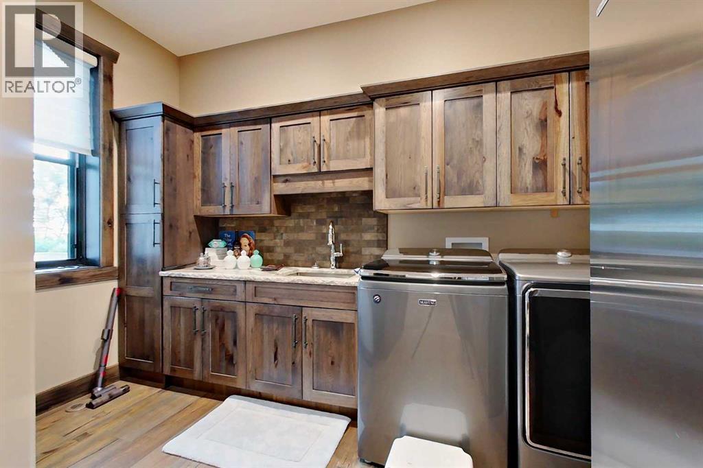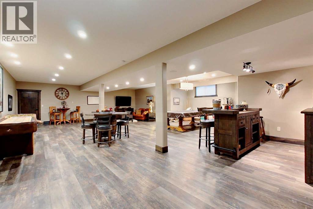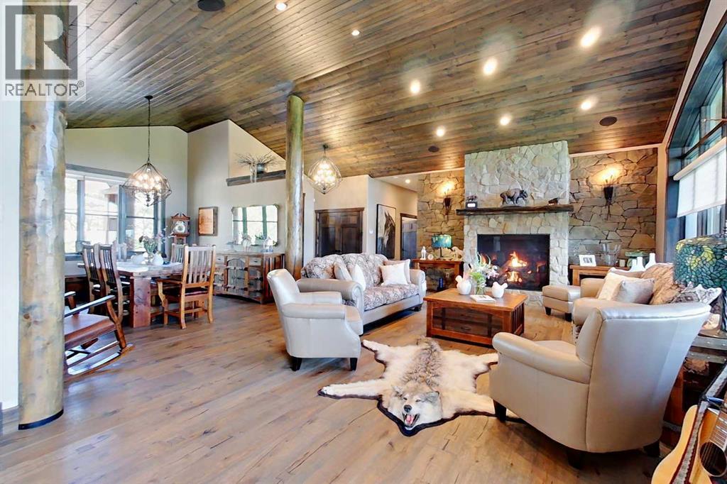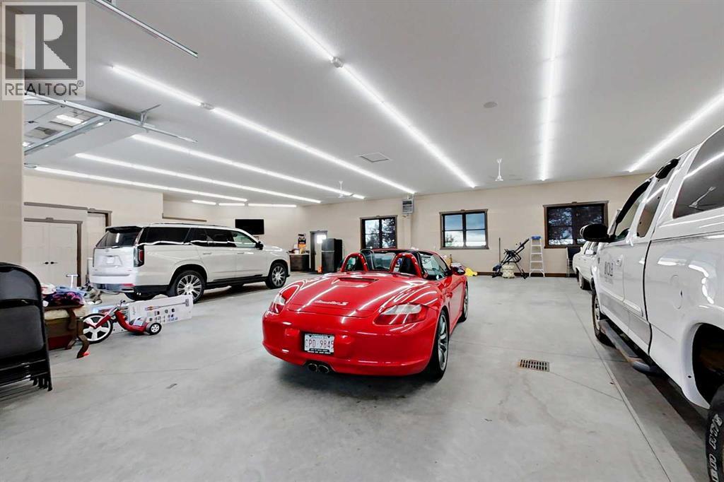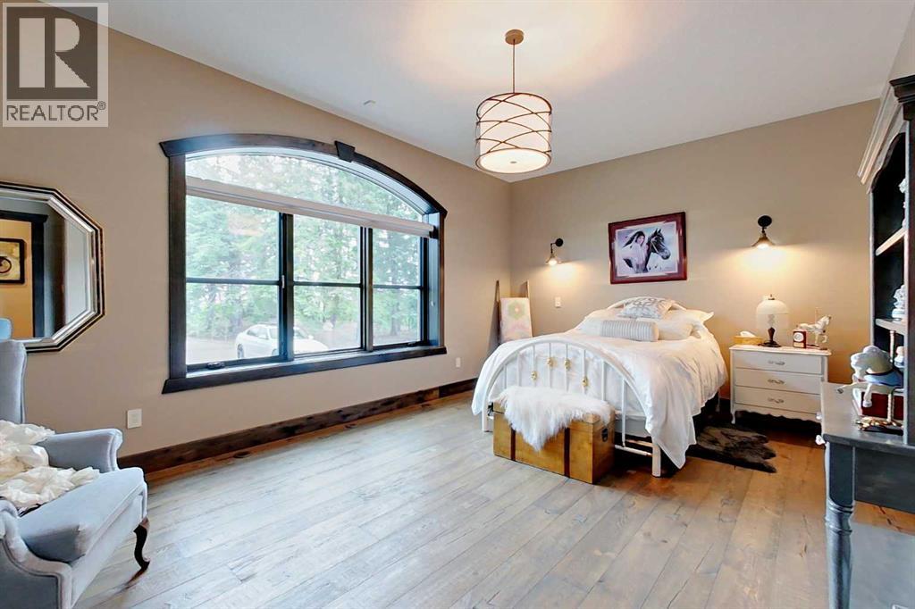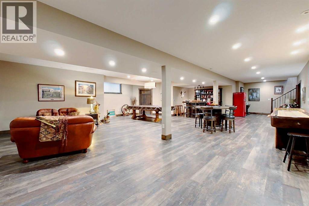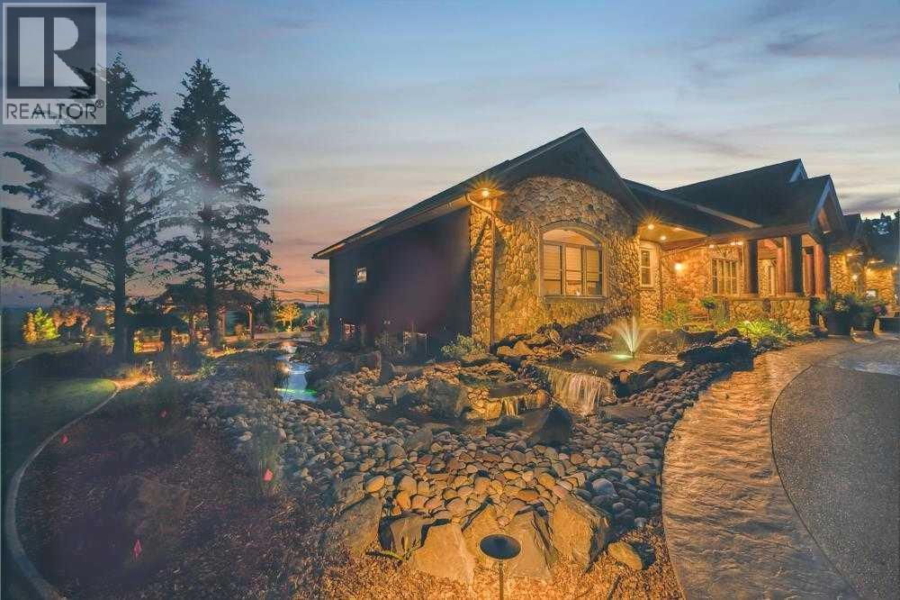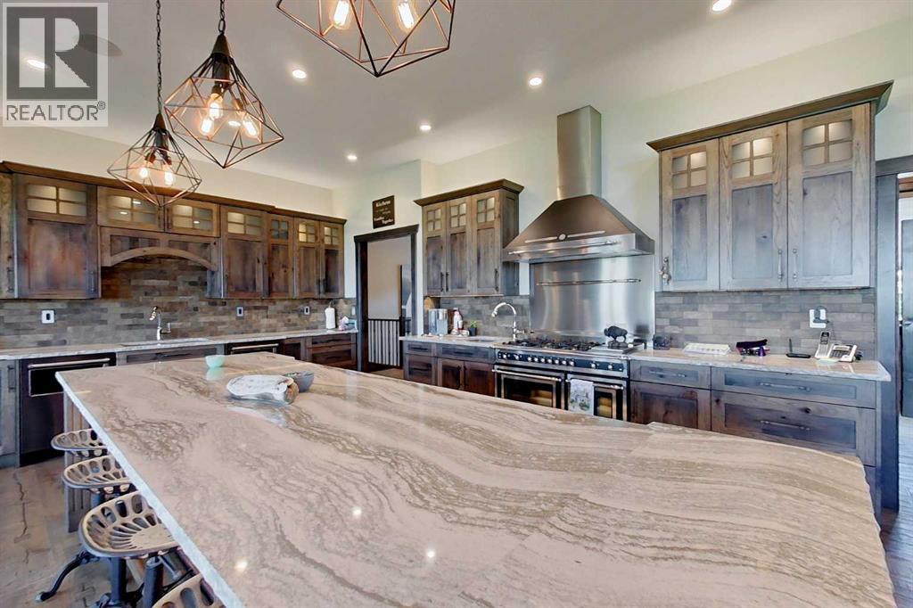 EXECUTIVE ACREAGE WITH STUNNING MOUNTAIN VIEWS AND A PARKLIKE SETTING! First time offered for sale and extremely rare opportunity to purchase this pristine 5.21 +/- Acres Located Just mins South of Olds on pavement. This is the perfect central Alberta location with Less than a 1hr drive to the Calgary airport and just 40 mins to Red Deer. The entire property sends a majestic mountain lodge feel where nature, towering trees, mature landscaping, gardens, family fire pit area, wide open spaces with waterfalls & streams soothe the soul. Executive touches greet you at the impressive main entrance with beautiful timbers, stonework, wrought iron fencing and over 46000 sqft (over 1 acre) of concrete driveway and stamped concrete edging inlays. The sprawling 3690sqft bungalow is loaded with features and class. Built with ICF Block foundation and a top of line list of mechanical features and sound system throughout. Rough edge quartz counter tops highlight a huge island kitchen with two dishwashers, a gas stove imported from overseas , under counter lighting, custom detailed wood artwork and more! The wide open concept and massive west facing windows allow for natural sunlight to stream throughout the entire main floor. Two Large fireplaces on the main floor & main floor laundry. The Primary bedroom is fit for a queen offering the most luxury built-in closet organizers and a massive ensuite with heated floors, two sinks and huge quartz shower. Two more large bedrooms, a 4pc and 2pc bath on the main floor. The basement features a large rec room, bar rough in and future room for even more development. The custom details don't stop in the 62' x 48' attached and heated garage with epoxy floors, 2pc bath, in-floor heart and a hot-water make up heater for quick recovery of heat. The concrete apron just outside the garage doors is also heated. Outbuildings include a fully finished 28' x 28 'detached garage and a massive fully finished 50' x 100' shop wi th bright LED lighting, in-floor heat, an RV sani-dump station and separate 1542 sqft legal suite. The legal suite includes two full 4pc baths, two bedrooms, large bonus room with custom fireplace mantel, custom kitchen and more! A true 10/10 showing is guranteed! Your best move starts here! (id:63190)