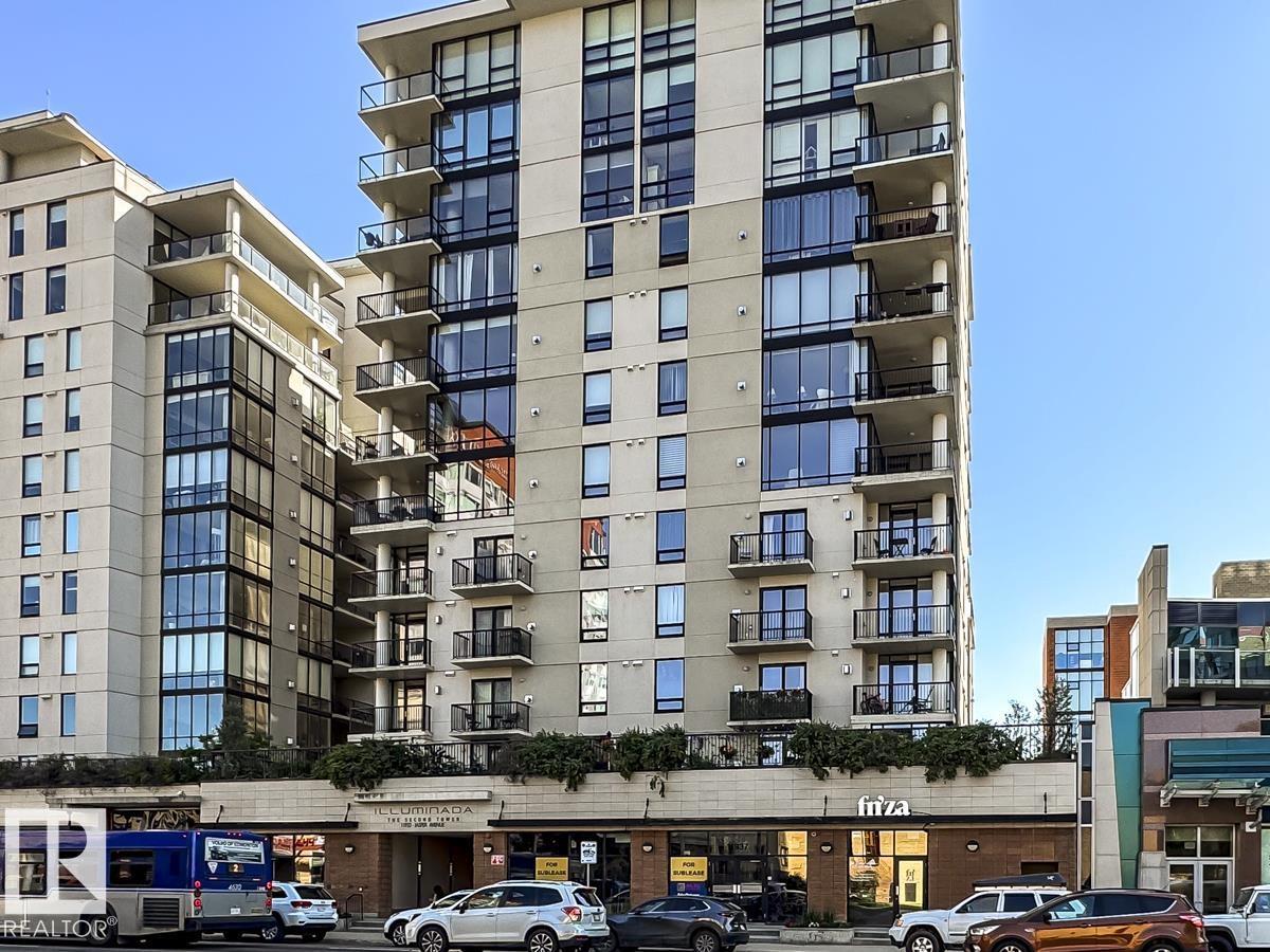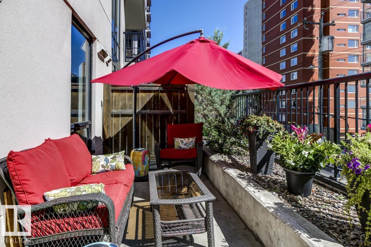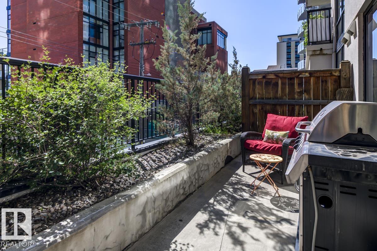 Live in style at the prestigious Illuminada II! This upscale 1 bed + den unit is packed w/ upgrades & offers a rare blend of luxury, function, & location. The sleek kitchen features granite counters, S/S appliances & an eating bar, all overlooking a sunlit living room w/ a cozy fireplace. Step out to your MASSIVE 343 sqft PRIVATE PATIO—a true outdoor oasis w/ gas BBQ hookup & water tap, ideal for entertaining or unwinding. The spacious primary boasts a spa-inspired 3pc ensuite, while the den adds flexibility as a home office or guest space. Extras include a 2pc bath, in-suite laundry w/ added storage, A/C, new heat pump (2024), newer laminate floors (2018), LED lighting, updated shower (2018), new carpet (2023) & fresh paint. Titled underground parking adds convenience in this sought-after, well-maintained building. Steps to fine dining, shops, transit, river valley trails & Victoria Golf Course—this is elevated downtown living at its best! (id:63190)