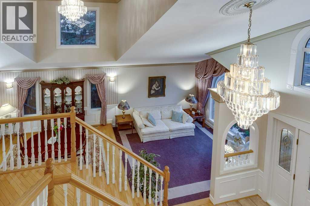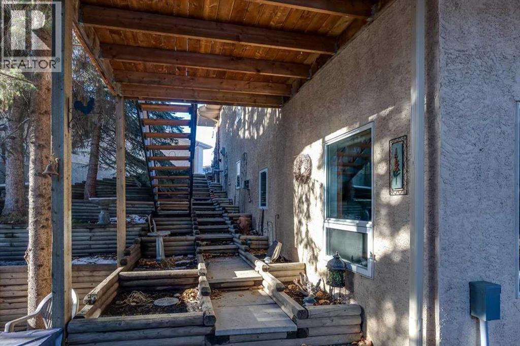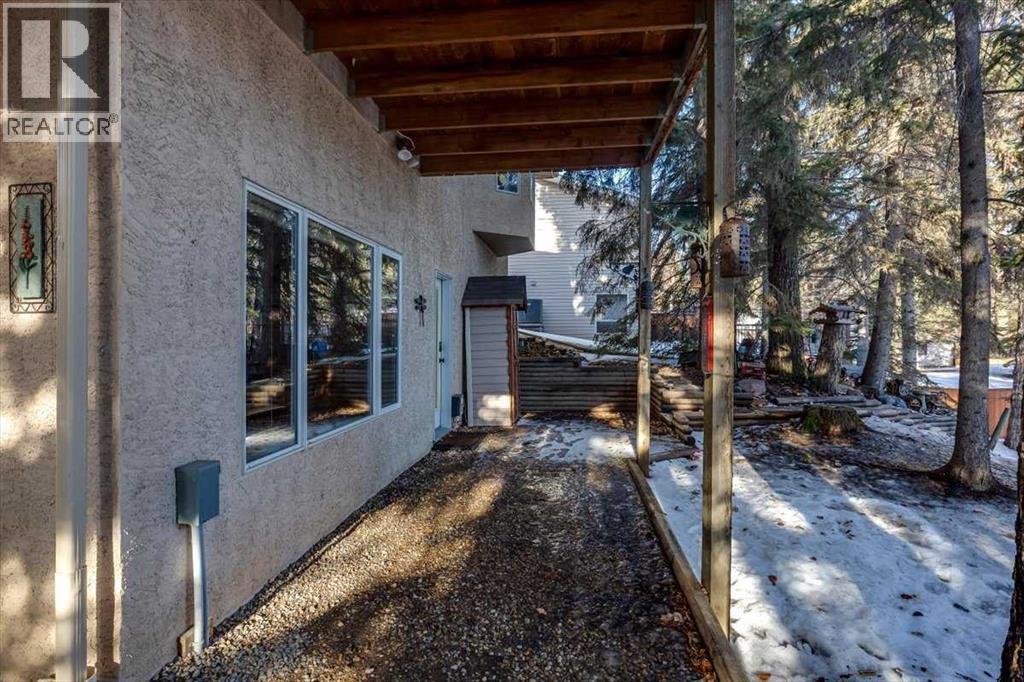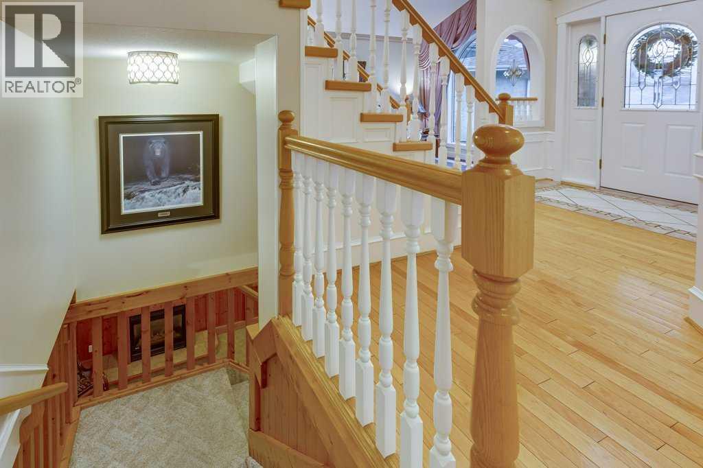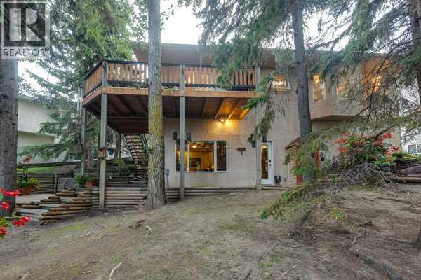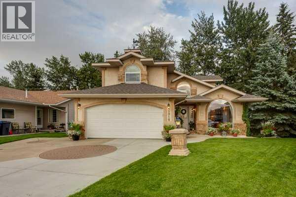 There is truly nothing else like this home on the market in Innisfail. Nestled in a private, forest-like setting right in town, this architectural masterpiece blends timeless elegance with natural serenity. From the moment you arrive, the extra-large front parking pad, accommodating three or more vehicles alongside the heated double garage, sets the tone for a property that balances luxury and practicality. Inside, the main level impresses with a cathedral ceiling foyer, chandelier, and refined details throughout. Ceiling medallions, crown mouldings, ledge lighting, and mosaic tile accents add sophistication, while hardwood flooring, custom wool carpeting, and Hunter Douglas window treatments elevate every room. The sunken living room exudes warmth, while the formal dining room glows with Murray Feiss lighting. The gourmet kitchen features abundant solid oak cabinetry, a gas stove, a Jenn-Air microwave/oven combo (gas hookup available/present), and a bay-window breakfast nook overlooking the treed backyard. Adjacent, the family room features a gas fireplace and a picturesque sitting area, creating an intimate gathering space. A captivating feature is the year-round sunroom, accessed through French doors, where walls of windows flood the space with natural light and frame uninterrupted views of the backyard oasis. A main-floor office or bedroom with custom-built-ins, a powder room, and a spacious laundry with sink and garage access complete this level. The primary suite occupies the upper floor, offering a private retreat at the top of its own grand staircase. A sitting area leads into the expansive bedroom with a walk-in closet, a hidden ironing board, a laundry chute, and a spa-inspired ensuite with a jetted soaker tub, Roman taps, and a shower. The walkout lower level evokes the feel of a luxury mountain retreat with beadboard, wainscoting, and cabin-like textures. The rec room, with 11-foot ceilings and a gas fireplace, is designed for entertaining, featuring a w et bar, built-in cue racks, and space for a pool table. Two additional bedrooms share a Jack-and-Jill four-piece bath, while above-grade windows and built-in organizers add both light and function. Outdoors, a wraparound deck with a natural gas BBQ hookup extends living into the treetops, perfect for entertaining or quiet mornings. Additional highlights include low-voltage outdoor lighting, retractable garden hoses, a wood retaining wall, two sheds, and wiring for a hot tub. The setting itself is unmatched—a private wooded escape that feels miles from town while only minutes from every amenity. Comfort and peace of mind come with in-floor heating in both the house and garage, many updated vinyl windows, a boiler-fired hot water tank (approx. 8 years old), and the roof was replaced in 2022. This home is a rare offering. Refined, timeless, and surrounded by nature, yet designed for modern living and entertaining. A sanctuary unlike any other, where classic elegance and a private forest retreat become one. (id:63190)