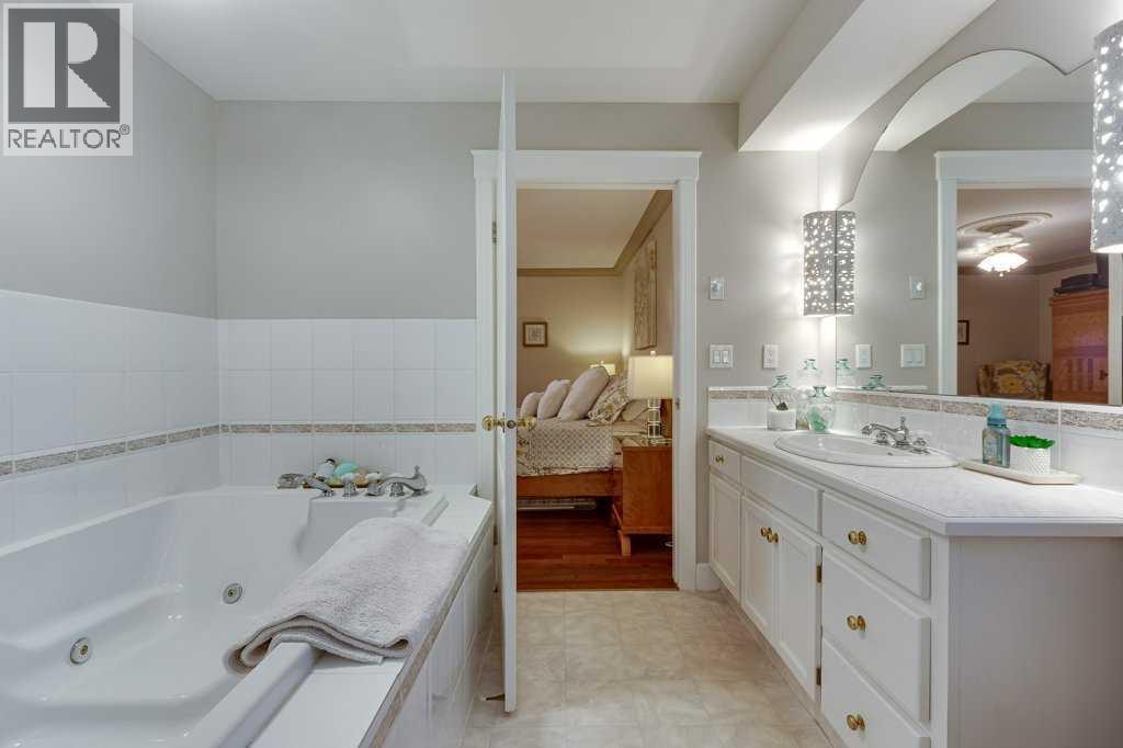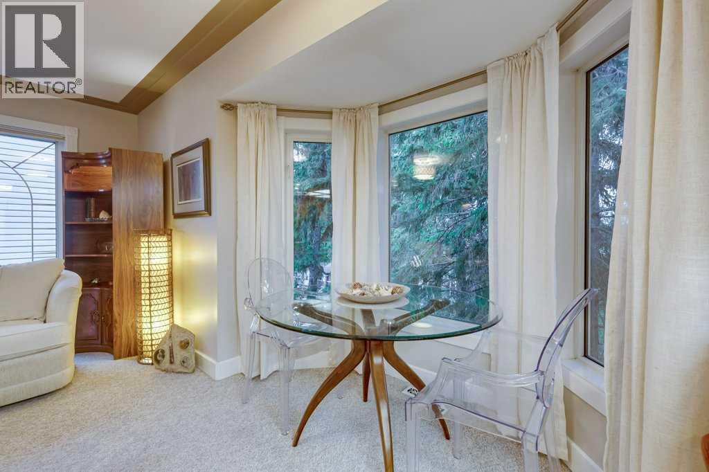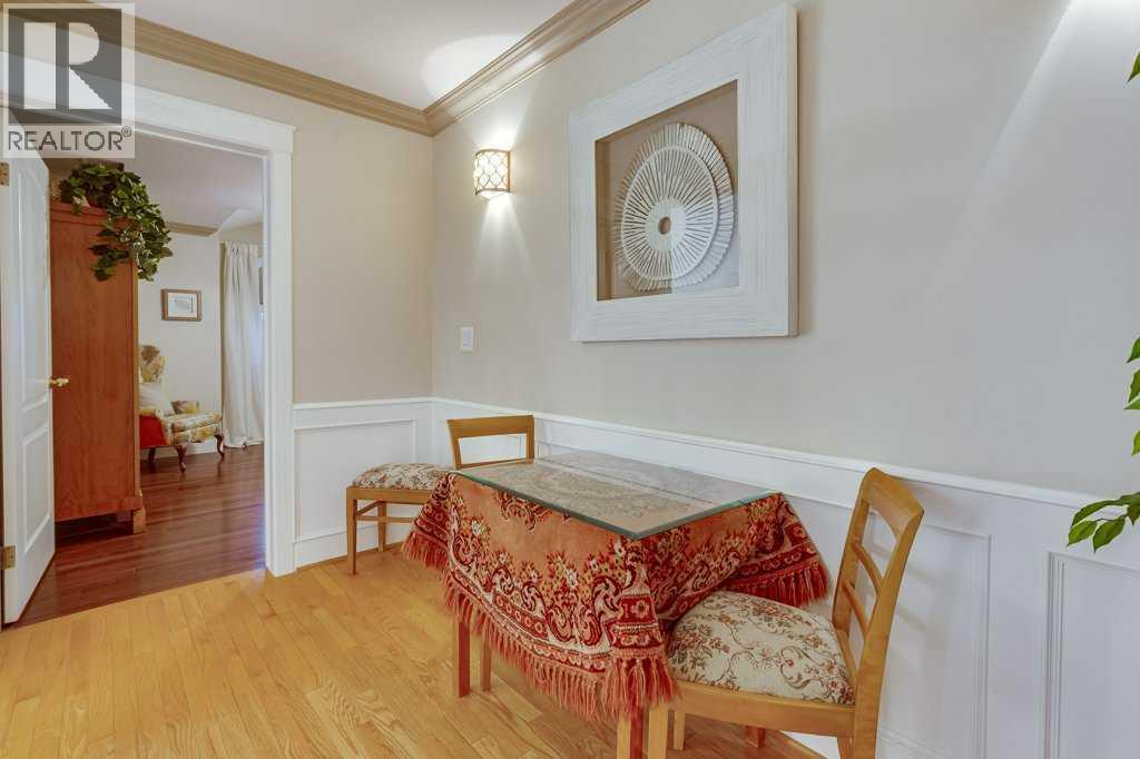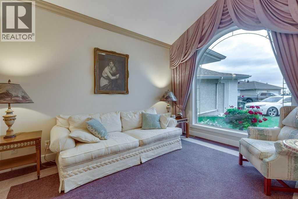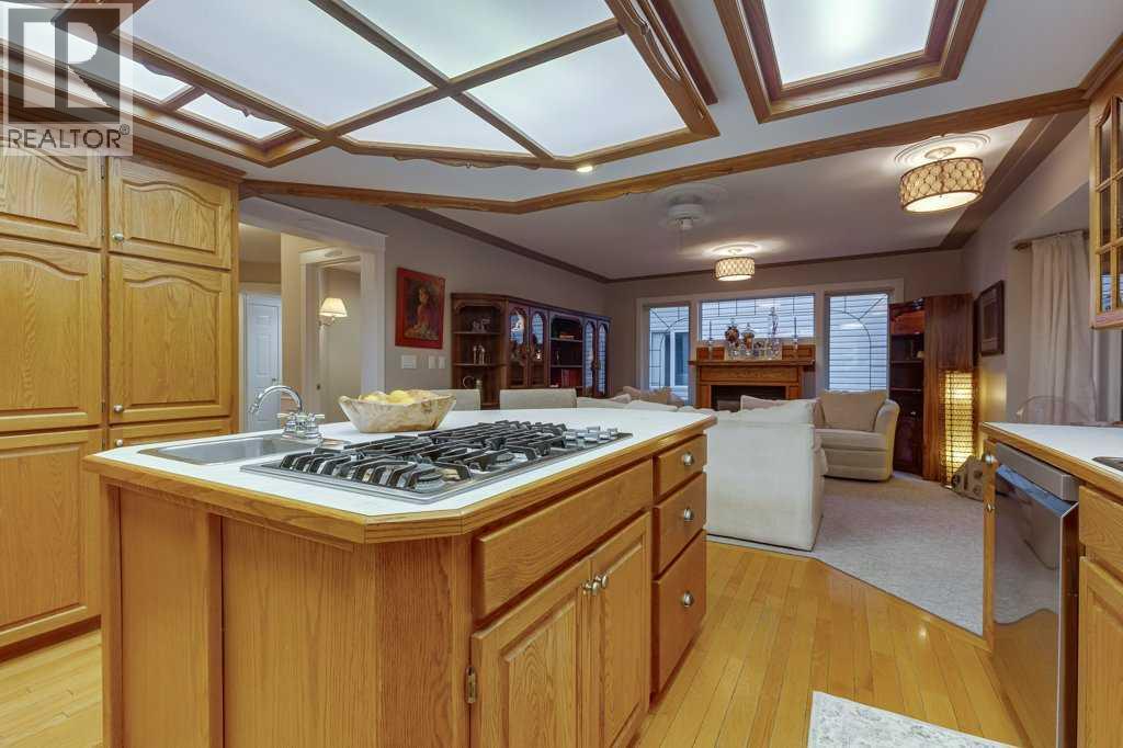 There is truly nothing else like this home on the market in Innisfail. Nestled in a private, forest-like setting right in town, this architectural masterpiece blends timeless elegance with natural serenity. From the moment you arrive, the extra-large front parking pad, accommodating three or more vehicles alongside the heated double garage, sets the tone for a property that balances luxury and practicality. Inside, the main level impresses with a cathedral ceiling foyer, chandelier, and refined details throughout. Ceiling medallions, crown mouldings, ledge lighting, and mosaic tile accents add sophistication, while hardwood flooring, custom wool carpeting, and Hunter Douglas window treatments elevate every room. The sunken living room exudes warmth, while the formal dining room glows with Murray Feiss lighting. The gourmet kitchen features abundant solid oak cabinetry, a gas stove, a Jenn-Air microwave/oven combo (gas hookup available/present), and a bay-window breakfast nook overlooking the treed backyard. Adjacent, the family room features a gas fireplace and a picturesque sitting area, creating an intimate gathering space. A captivating feature is the year-round sunroom, accessed through French doors, where walls of windows flood the space with natural light and frame uninterrupted views of the backyard oasis. A main-floor office or bedroom with custom-built-ins, a powder room, and a spacious laundry with sink and garage access complete this level. The primary suite occupies the upper floor, offering a private retreat at the top of its own grand staircase. A sitting area leads into the expansive bedroom with a walk-in closet, a hidden ironing board, a laundry chute, and a spa-inspired ensuite with a jetted soaker tub, Roman taps, and a shower. The walkout lower level evokes the feel of a luxury mountain retreat with beadboard, wainscoting, and cabin-like textures. The rec room, with 11-foot ceilings and a gas fireplace, is designed for entertaining, featuring a w et bar, built-in cue racks, and space for a pool table. Two additional bedrooms share a Jack-and-Jill four-piece bath, while above-grade windows and built-in organizers add both light and function. Outdoors, a wraparound deck with a natural gas BBQ hookup extends living into the treetops, perfect for entertaining or quiet mornings. Additional highlights include low-voltage outdoor lighting, retractable garden hoses, a wood retaining wall, two sheds, and wiring for a hot tub. The setting itself is unmatched—a private wooded escape that feels miles from town while only minutes from every amenity. Comfort and peace of mind come with in-floor heating in both the house and garage, many updated vinyl windows, a boiler-fired hot water tank (approx. 8 years old), and the roof was replaced in 2022. This home is a rare offering. Refined, timeless, and surrounded by nature, yet designed for modern living and entertaining. A sanctuary unlike any other, where classic elegance and a private forest retreat become one. (id:63190)