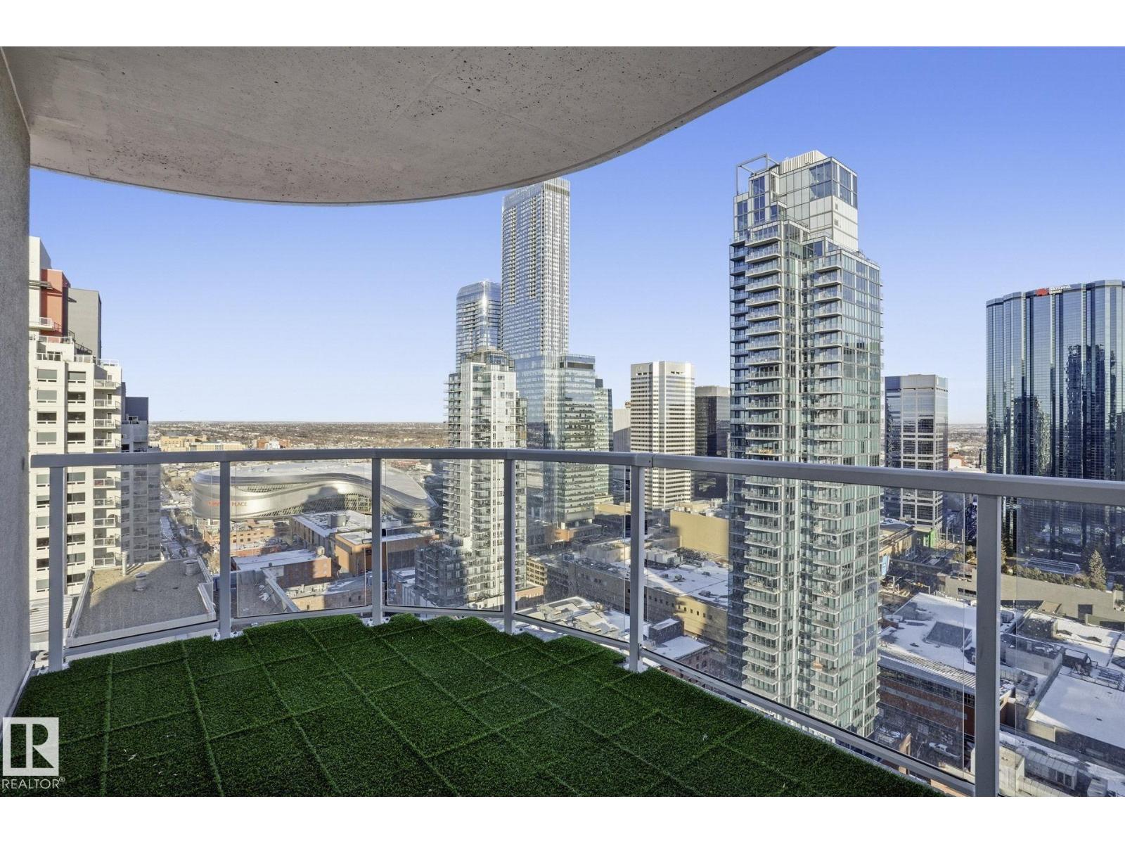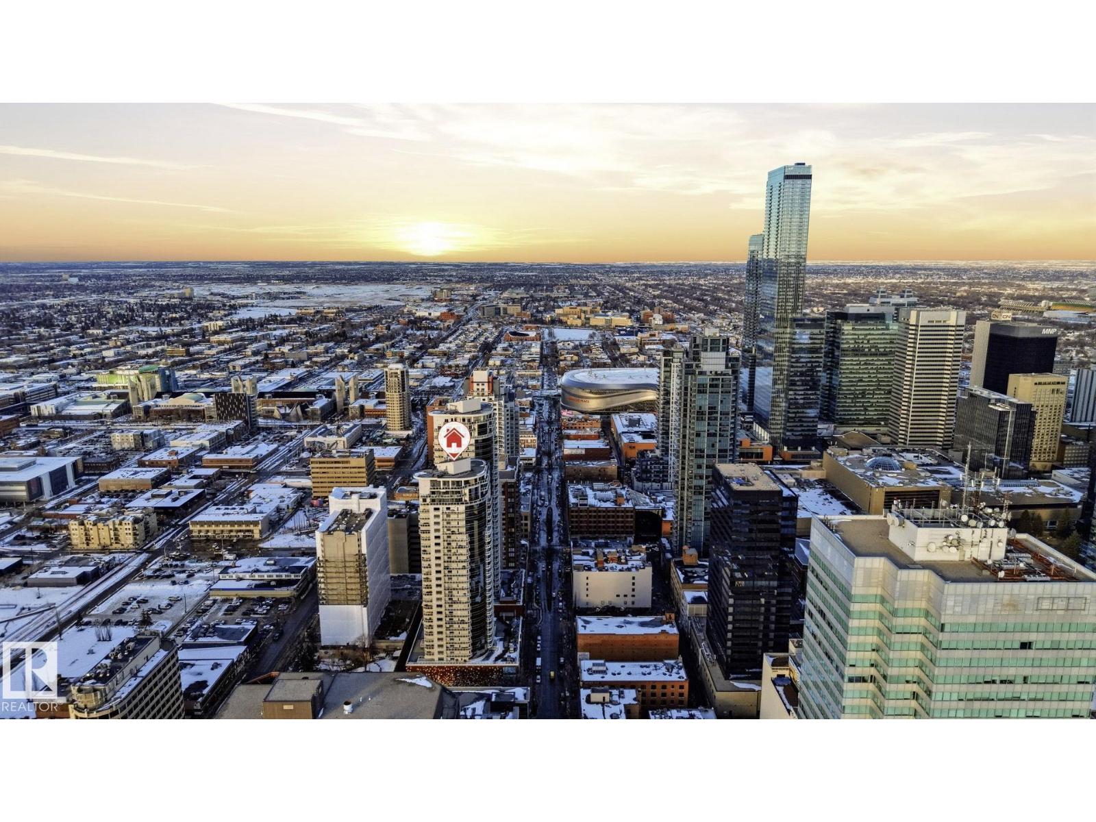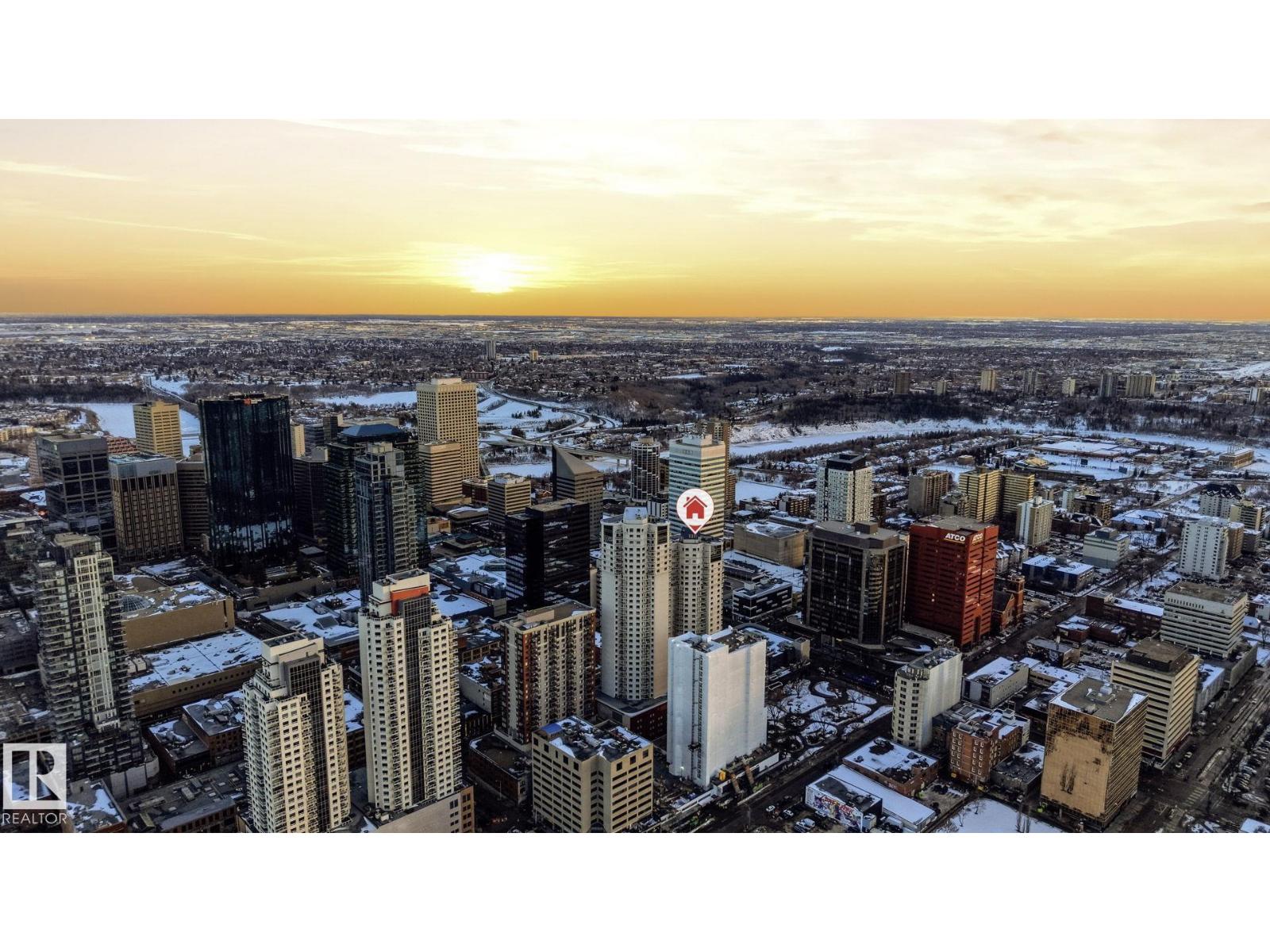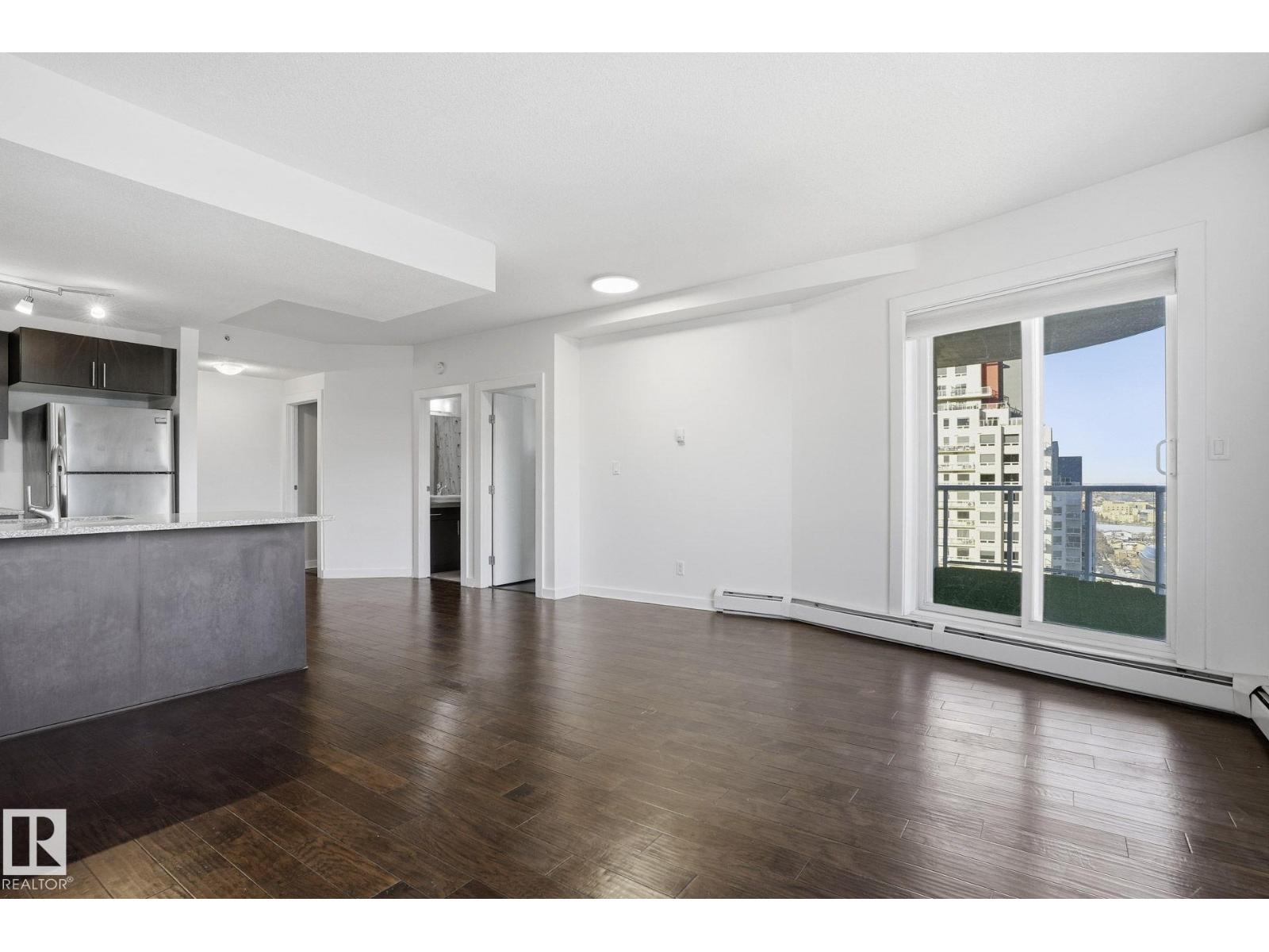 Live in the heart of downtown in this stunning 27th-floor condo in Icon II, offering incredible Downtown, NE, and SE River Valley views. This highly functional 2 bedroom, 2 bath features 098SqFt of spacious living with contemporary finishes throughout, including engineered hardwood, tile flooring, granite countertops, sleek cabinetry, upgraded fixtures & fresh paint. The open-concept kitchen is equipped with stainless steel appliances & a breakfast bar overlooking the spacious great room with dining nook & access to the balcony showcasing breathtaking views. The primary bedroom features a walk-in closet & 4 piece ensuite, while the large 2nd bedroom offers ample closet space. Enjoy in-suite laundry, plenty of storage, and secure heated underground parking, plus heated visitor parking. Unbeatable downtown location on one of Edmonton’s best streets—steps to markets, dining, Ice District/Rogers Place, MacEwan, River Valley trails LRT, & minutes to the U of A and NAIT. Urban living at its finest! (id:63190)