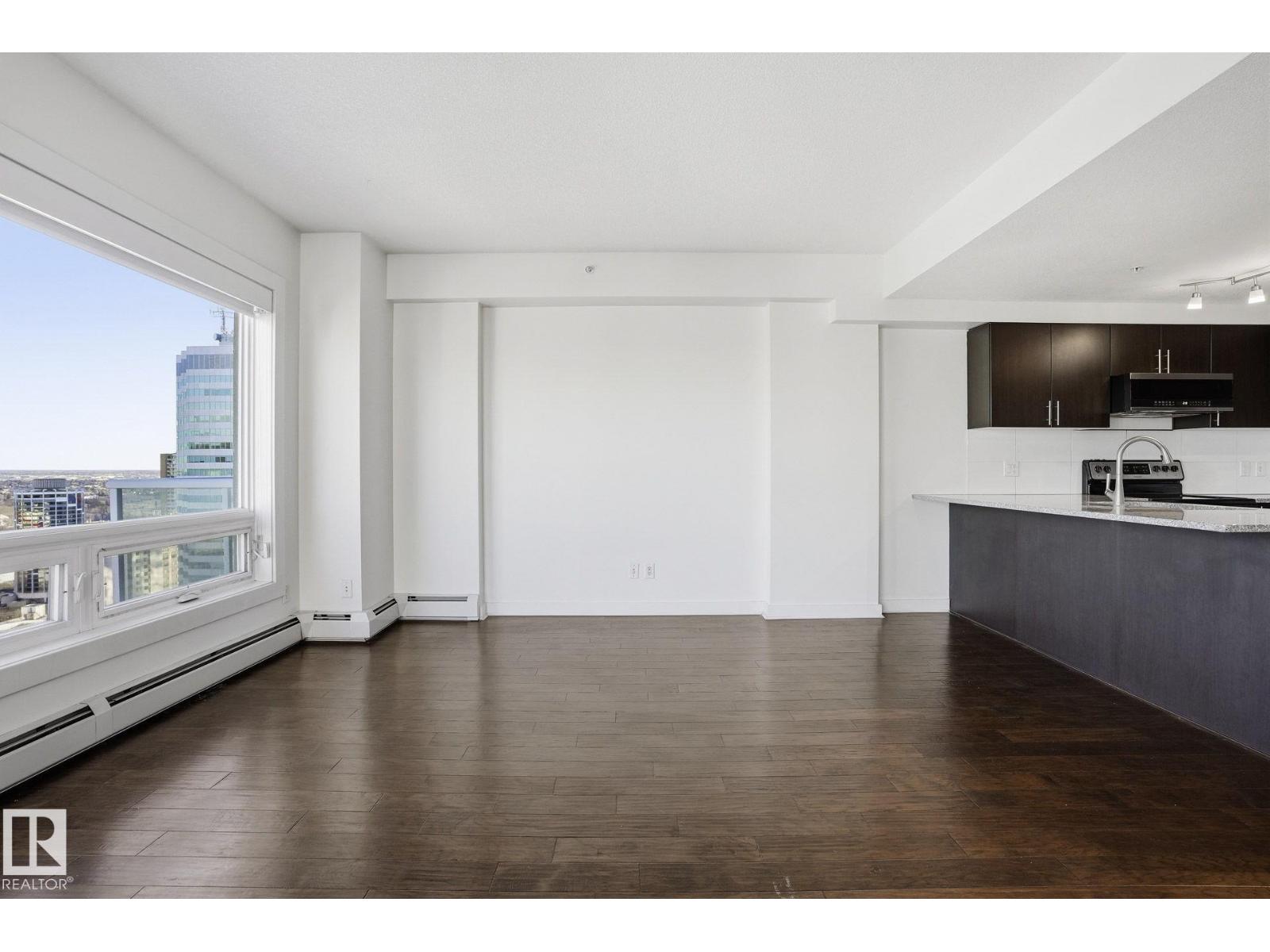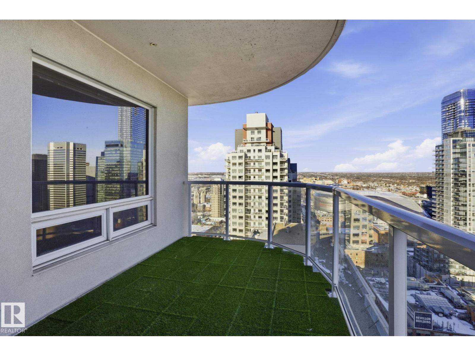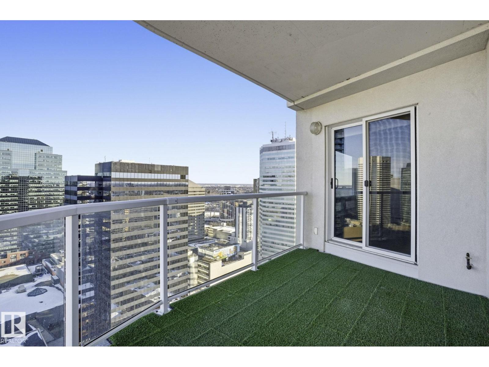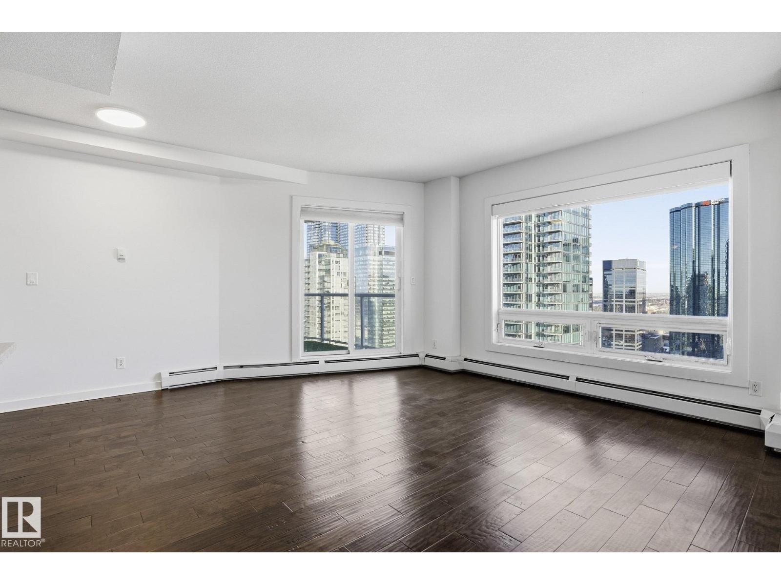 Live in the heart of downtown in this stunning 27th-floor condo in Icon II, offering incredible Downtown, NE, and SE River Valley views. This highly functional 2 bedroom, 2 bath features 098SqFt of spacious living with contemporary finishes throughout, including engineered hardwood, tile flooring, granite countertops, sleek cabinetry, upgraded fixtures & fresh paint. The open-concept kitchen is equipped with stainless steel appliances & a breakfast bar overlooking the spacious great room with dining nook & access to the balcony showcasing breathtaking views. The primary bedroom features a walk-in closet & 4 piece ensuite, while the large 2nd bedroom offers ample closet space. Enjoy in-suite laundry, plenty of storage, and secure heated underground parking, plus heated visitor parking. Unbeatable downtown location on one of Edmonton’s best streets—steps to markets, dining, Ice District/Rogers Place, MacEwan, River Valley trails LRT, & minutes to the U of A and NAIT. Urban living at its finest! (id:63190)