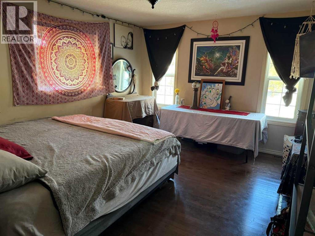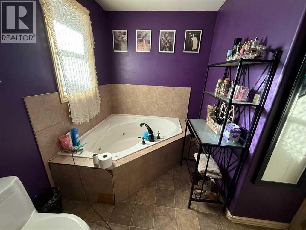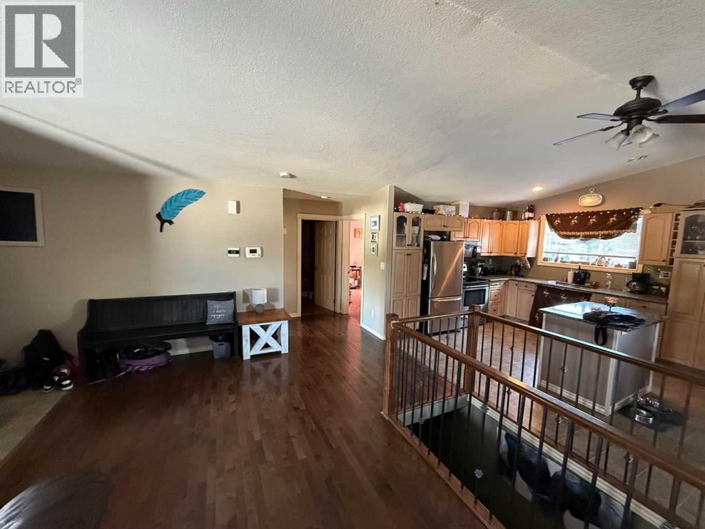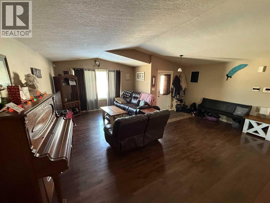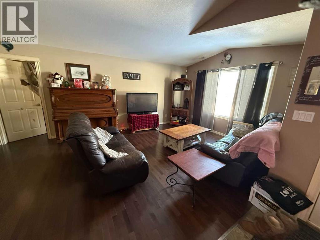 Perched up on a hill, this 2009-built home in Swan Hills offers space, light, and solid bones—making it one of the newer builds in town and a great option for buyers looking for room to grow.The main floor is bright and open, with tall ceilings and large windows that flood the space with natural light. Hardwood floors run through the living area and primary bedroom, while the layout flows seamlessly from the kitchen with island and granite countertops, to the dining area, and out onto the covered 12’ x 7’ back deck—ideal for entertaining or quiet evenings outdoors. A front verandah adds another welcoming outdoor space and takes advantage of the elevated setting.There are three generous bedrooms on the main floor, including a primary suite with a 4-piece ensuite featuring a stand-up shower and corner soaker tub. The remaining two bedrooms are comfortably sized and carpeted, with a full 4-piece main bathroom nearby.Downstairs, the basement features 9’ ceilings, two large bedrooms with laminate flooring, and plenty of undeveloped space ready for your vision. Laundry is also conveniently located on the lower level. All interior walls are insulated for sound, adding comfort and privacy throughout the home.The property offers room to build a 24’ x 24’ garage, adding even more value and flexibility. The home does need some touch-ups—some trim, some interior doors, and replacement of the ensuite shower—which is reflected in the price and presents an excellent opportunity to add equity.A solid home with great layout, natural light, and entertaining space—just waiting for the right touch to make it shine. (id:63190)
