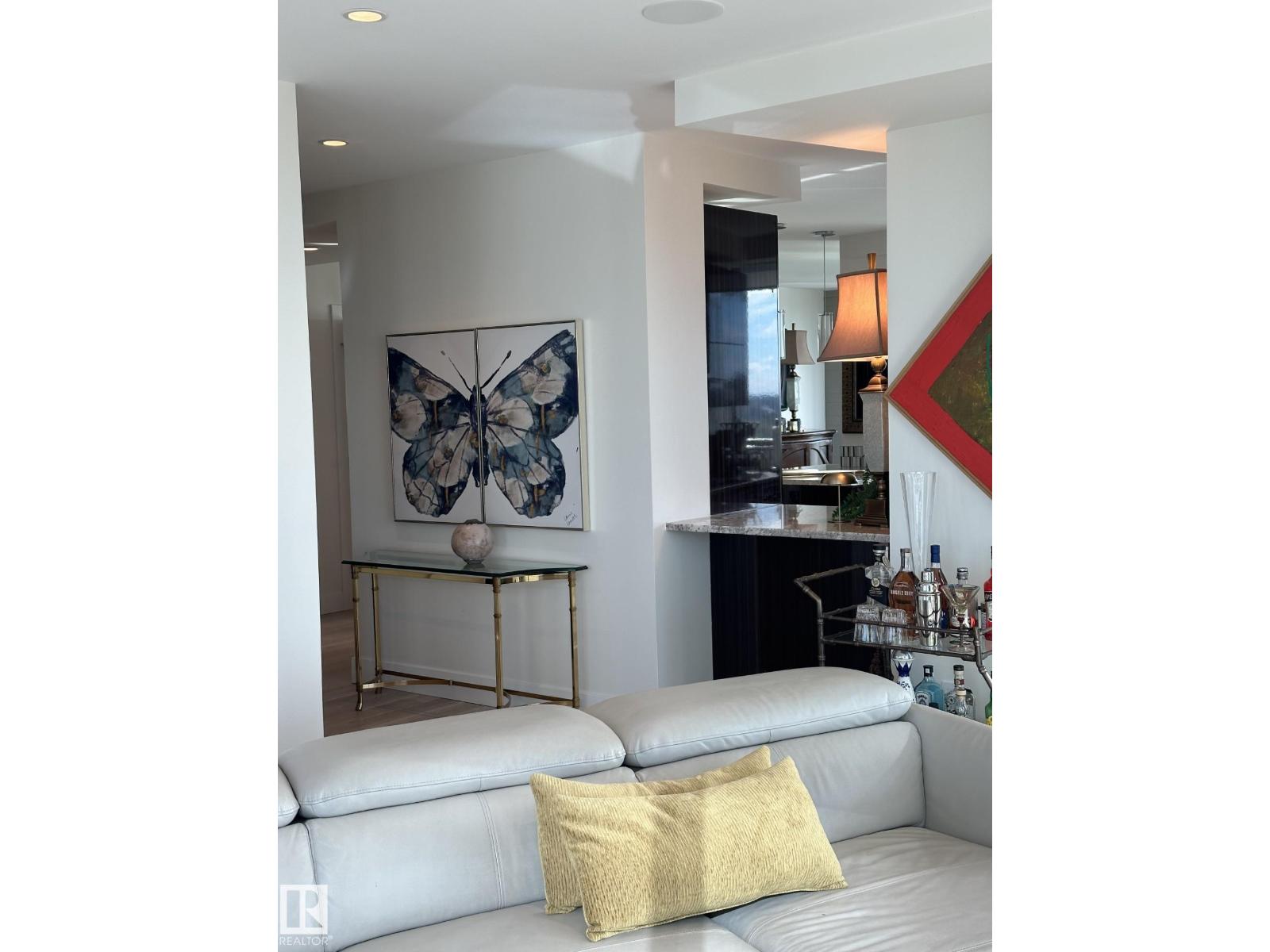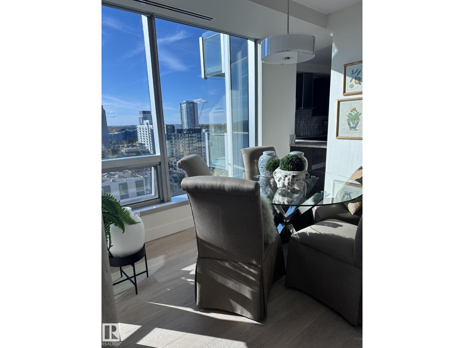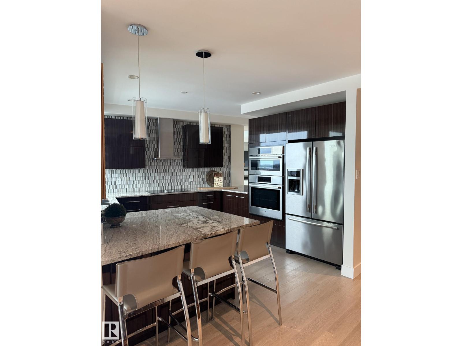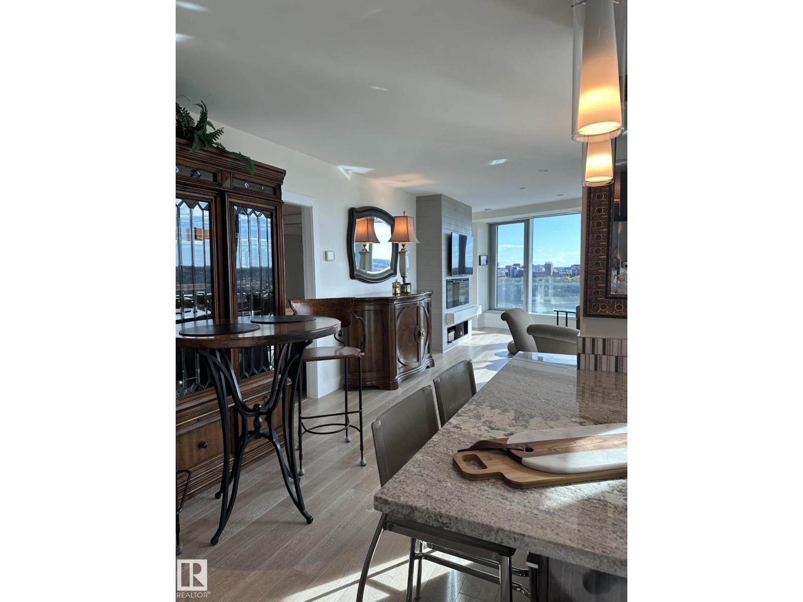 VIEW! VIEW! VIEW! Beautiful 1,546 sqft open-concept home, showcasing breathtaking views of the river valley and UPTOWN Edmonton through expansive curtain wall windows with hidden roller blinds, complemented by two covered balconies. The modern kitchen is equipped with a sleek Granite peninsula, high-end appliances, with a south facing view from the kitchen sink, making it a chef’s dream. The two primary bedrooms comfortably fit a king-sized bed, boasts custom closets, and opens to a three & 4-piece ensuite featuring a five-foot walk-in shower with a steam and three-jet and two-head spa shower. An additional bedroom with a four-piece ensuite bath makes a perfect office, additional bedroom, or guest suite. The property comes with 3 titled parking stalls, one with a secure lockable storage cage. Residents enjoy top-notch amenities, including concierge services, weight and cardio fitness rooms, a well-appointed social room, and a car wash facility. The views are always amazing! (id:63190)