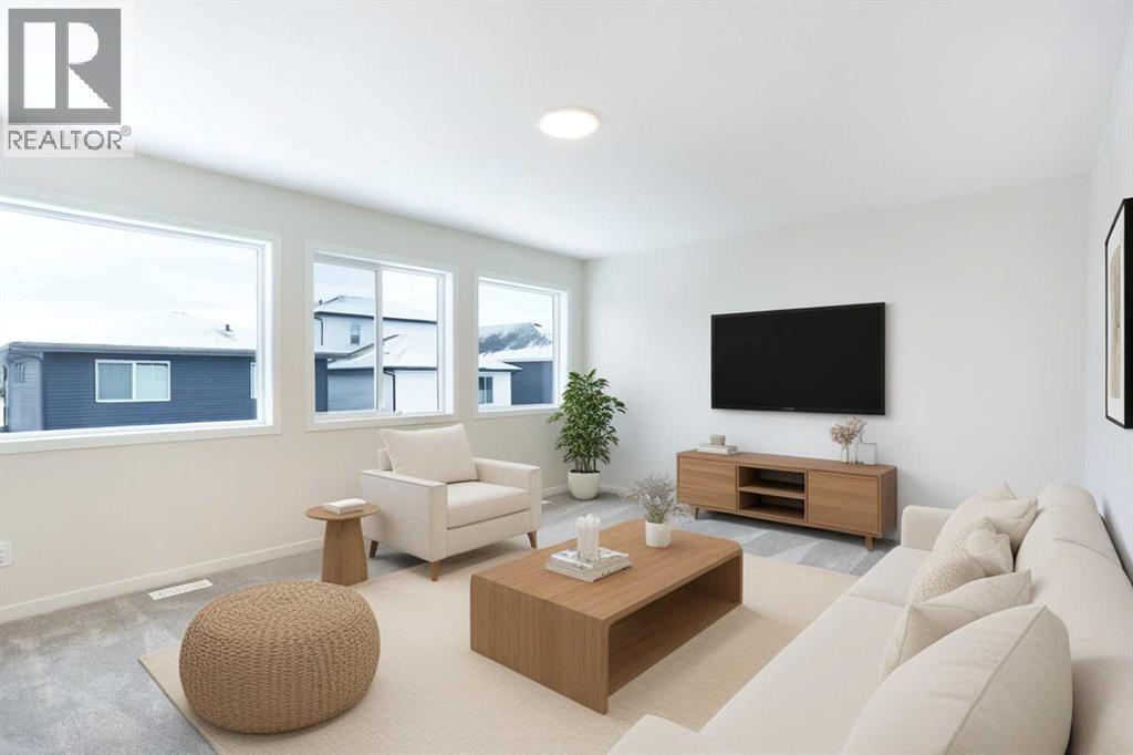 Welcome to this exceptional Morrison Homes Franklin I model, a beautifully designed two-storey semi-attached home is ideally situated in the sought-after and rapidly growing community of Sirocco at Pine Creek. Boasting 1,976 sq. ft. of thoughtfully developed living space above grade, this home offers an intelligent layout that balances modern elegance with functional design, complemented by a front-attached double garage and a side entry, providing both convenience and everyday practicality for families of all sizes.The main floor showcases a bright, open-concept layout that flows seamlessly, with durable and stylish finishes designed to impress. The kitchen is a standout feature, with a contemporary two-tone design featuring grey lower cabinetry and white upper cabinets, accented with black hardware, full-length cabinetry, and quartz countertops throughout, offering an ideal space for meal preparation, entertaining, or casual family gatherings. A spacious island adds prep space and seating, while stainless steel appliances and a gas range rough-in make this kitchen fully equipped for modern culinary needs. The adjacent dining and living areas are anchored by a grey tile feature wall, creating a sophisticated focal point that enhances the home’s welcoming atmosphere.A thoughtfully designed mudroom with built-in cabinetry connects seamlessly to the garage and side entry, providing excellent storage for outerwear, footwear, and everyday essentials. A conveniently located powder room completes the main level, combining style with practicality.Upstairs, the home offers three generously sized bedrooms and a large rear-facing bonus room, perfect for a family media area, playroom, or additional living space. The private primary suite features a walk-in closet and a spa-inspired ensuite with tiled flooring and a glass shower enclosure, providing a tranquil retreat. Two additional bedrooms share a full bath, also finished with high-quality tiled flooring, while top-flo or laundry adds convenience to daily routines, and soft carpeting throughout enhances comfort and warmth.The unfinished basement presents a versatile space ready for future development, allowing homeowners to create additional bedrooms, recreational areas, or a custom home office, tailored to meet their family’s needs and lifestyle.Situated in a vibrant community with easy access to parks, walking and cycling pathways, schools, and future amenities, this home combines functional living, high-end finishes, and long-term flexibility. The Franklin I model at 53 Creekside Passage is an exceptional opportunity for buyers seeking a stylish, thoughtfully designed home that offers both immediate comfort and the potential to expand in the years to come. (id:63190)