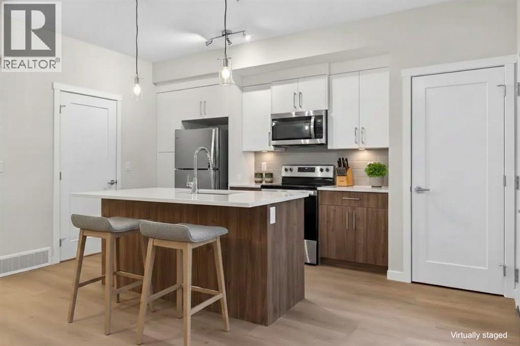WELCOME TO SONOMA IN BELMONT! This BRAND NEW/ NEVER OCCUPIED 2-bedroom, 2-bathroom townhome showcases a California-inspired design that perfectly balances modern style with timeless elegance. Bathed in natural light, this bright and spacious south-facing home offers approximately 1,150 sq. ft. of thoughtfully designed living space. The main level features a generous living room with large windows overlooking your sunny private patio—ideal for relaxing or entertaining. The adjacent dining area seamlessly connects to the chef-inspired kitchen, complete with quartz countertops, modern cabinetry, ample storage with dual pantries, energy-efficient stainless steel appliances, and wide-plank LVP flooring throughout. Upstairs, you’ll find two well-sized bedrooms, including a primary retreat with a walk-through walk-in closet and a stylish cheater ensuite. Convenient upper-level laundry adds to everyday ease. Enjoy year-round covered parking with direct access to the unit for ultimate convenience. Across your front door, your guests will find many visitor stalls. Located in the vibrant community of Belmont and built by 16-time Builder of the Year, Morrison Homes, this neighbourhood offers connected pathways, parks, playgrounds, and nearby shopping. With quick access to Stoney Trail and Macleod Trail, commuting is effortless. Spend weekends enjoying local attractions such as Spruce Meadows, or cheering on Cavalry FC at ATCO Field, just minutes away. (id:63190)