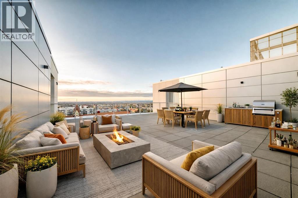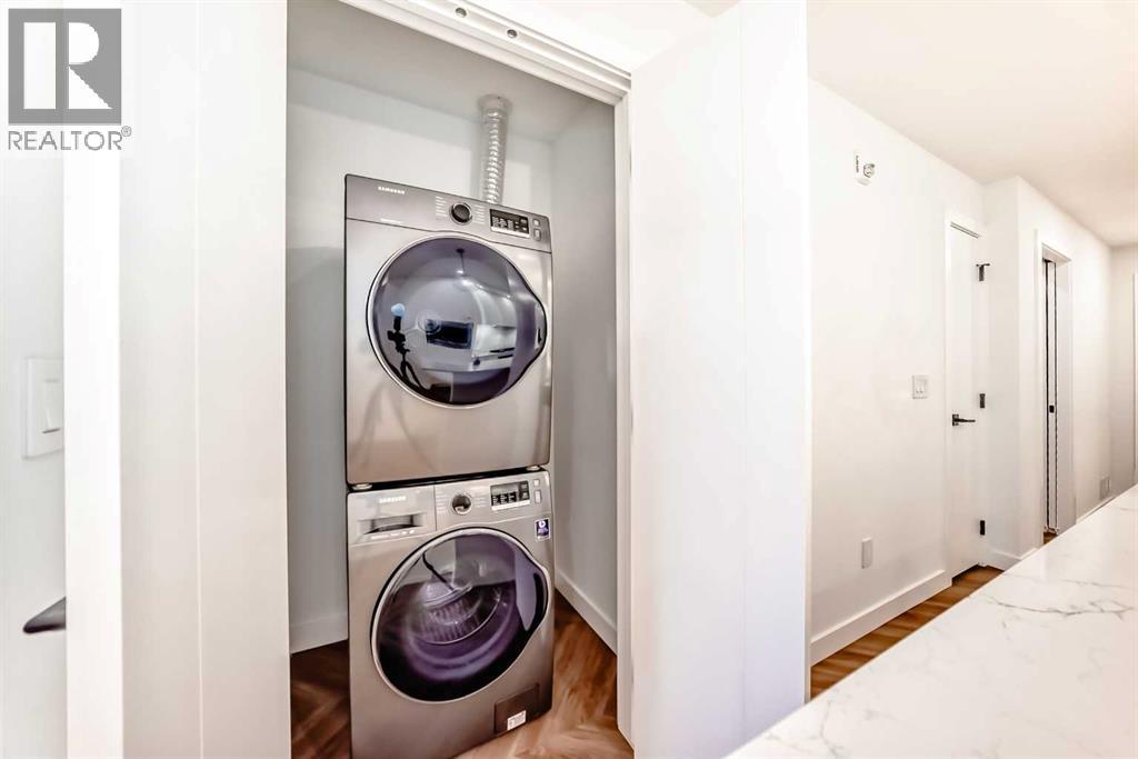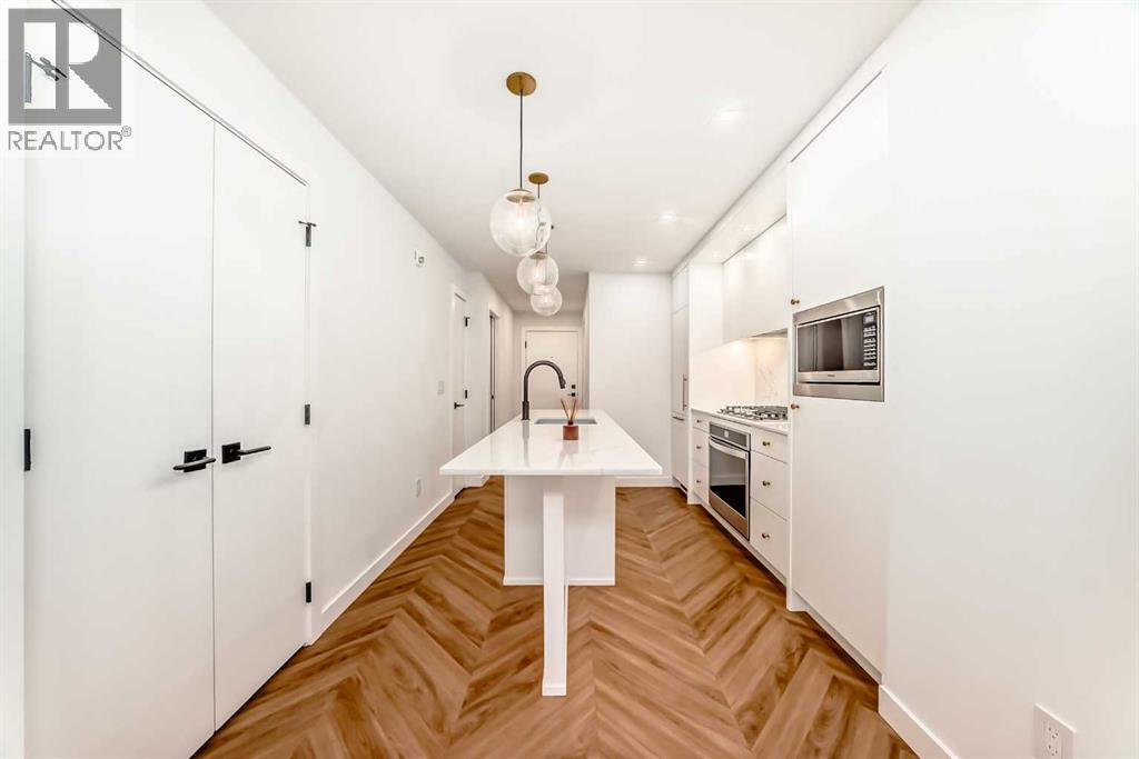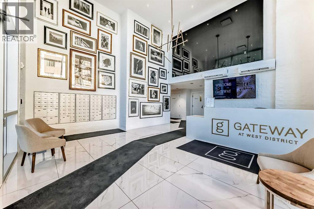 Welcome to Gateway by TRUMAN, ideally located in the vibrant, master-planned West District. This concrete-constructed residence offers modern luxury, thoughtful design, and exceptional urban convenience. This two-bedroom, two-bathroom home with titled underground parking features chevron wide-plank flooring, designer lighting, and flat-painted ceilings for a timeless, upscale feel. Floor-to-ceiling windows flood the space with natural light and capture mountain views, while central air conditioning ensures year-round comfort. The chef-inspired kitchen blends style and function with matte custom cabinetry, brushed-gold accents, quartz countertops and backsplash, under-cabinet lighting, and a generous eating bar. Premium appliances include a gas cooktop, wall oven, 36” Fisher & Paykel integrated refrigerator, paneled dishwasher, and statement hood fan. The open living and dining areas extend to a private terrace, ideal for outdoor lounging and entertaining. The primary suite features a walk-in closet and spa-inspired ensuite with quartz counters, mosaic tile, and a glass-enclosed shower. The second bedroom offers flexibility as a guest room or home office with access to a stylish four-piece bath. Additional highlights include in-suite laundry, ample storage, and secure underground parking. Residents enjoy premium amenities such as a rooftop patio, owner’s lounge, concierge, seperate bike & general storage lockers, EV charging, and visitor parking.Surrounded by parks, walking paths, boutique shopping, cafés, and dining, this home offers elevated living in one of Calgary’s most sought-after communities. (id:63190)
