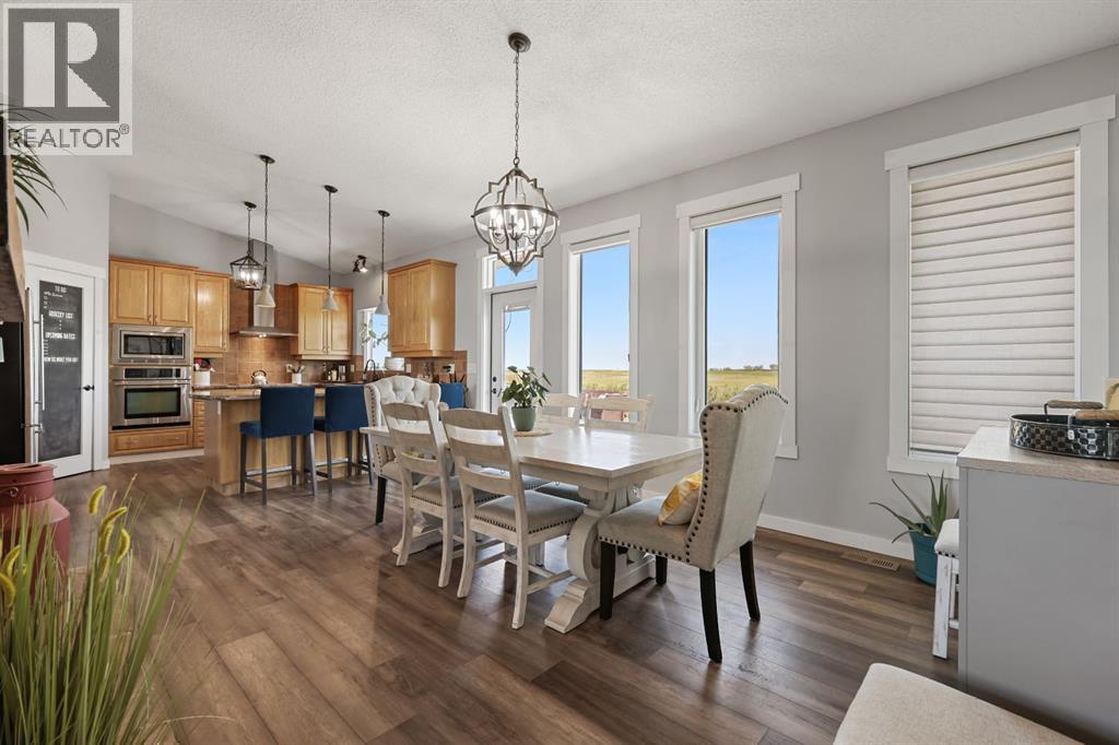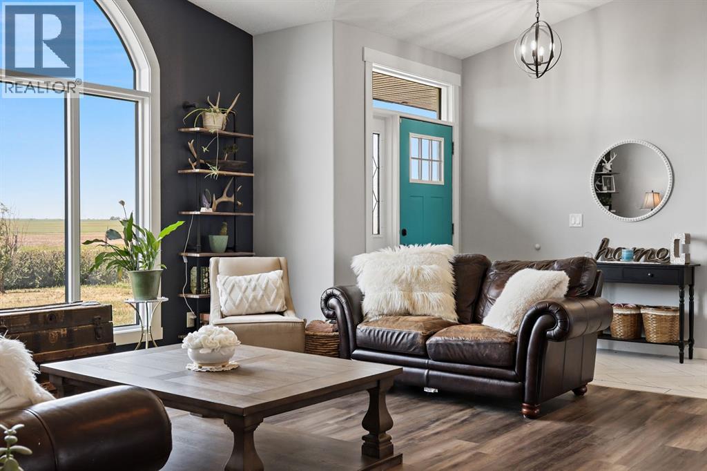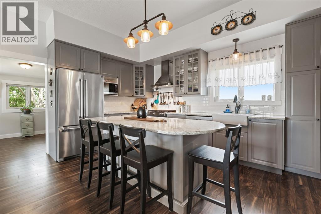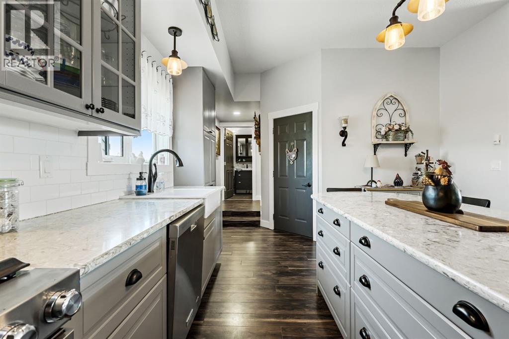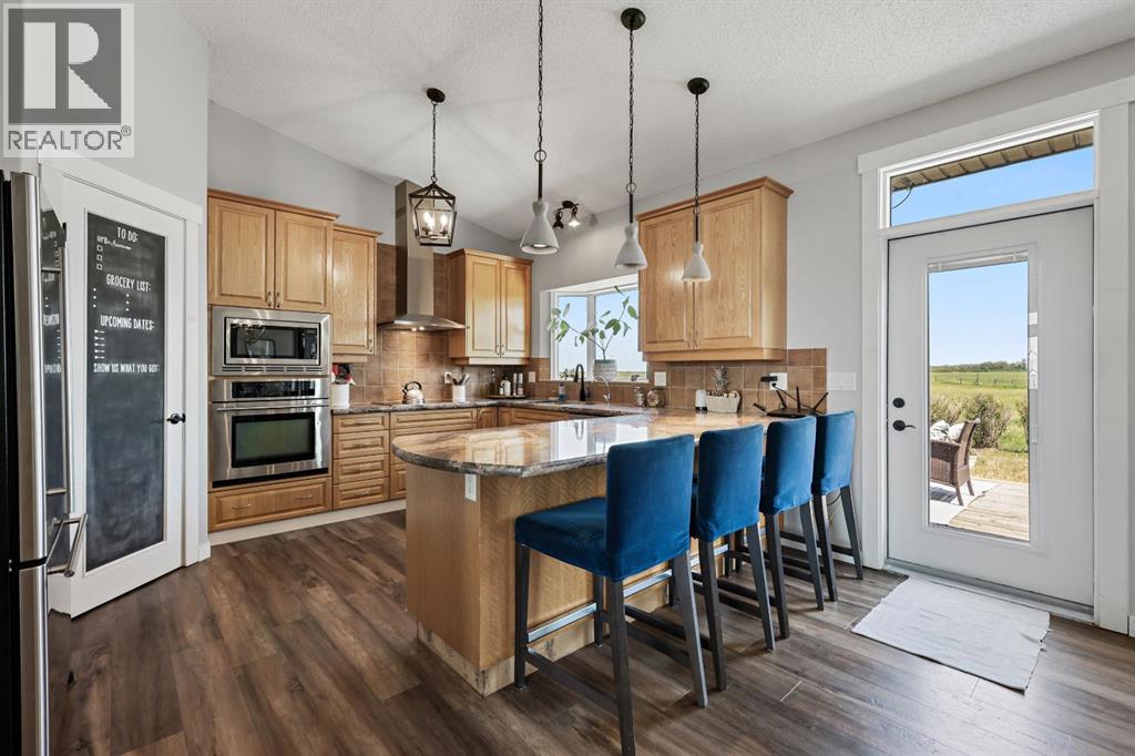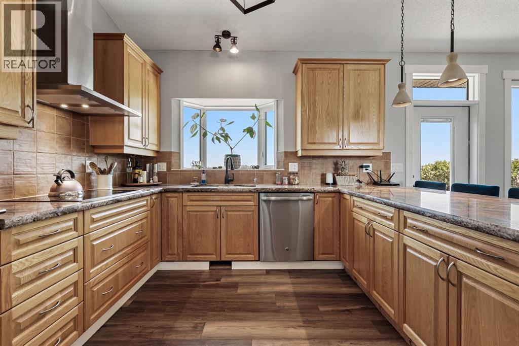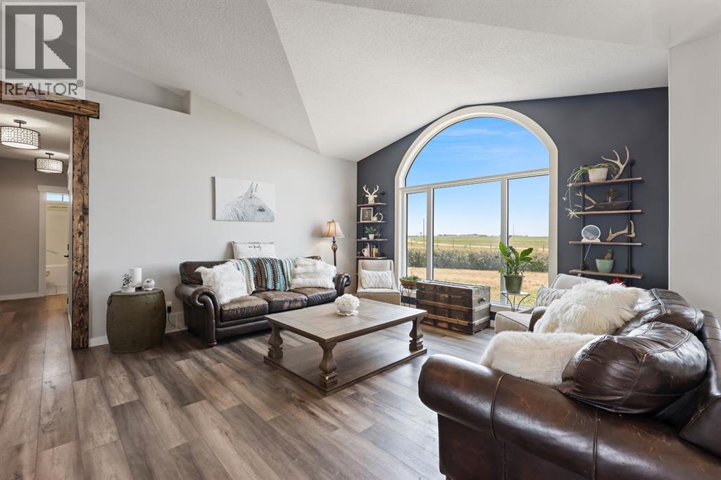 Welcome to your dream retreat—set on 4.05 fully fenced acres with stunning views and only 15 minutes from Calgary and Chestermere. This beautifully maintained bungalow offers just over 3,000 sq.ft. of developed living space, including a thoughtfully designed illegal in-law suite, making it ideal for multi-generational living or added rental potential.The main residence features a spacious primary bedroom filled with natural light from its south- and east-facing windows. The elegant ensuite includes a walk-in shower, soaker tub, and dual sinks, while the walk-in closet is equipped with built-in shelving and access to a massive 2,000 sq.ft. poured concrete crawl space—perfect for all your storage needs. Two additional bedrooms and a four-piece bathroom are located in the main wing. The open-concept living and dining room is centered around a stunning floor-to-ceiling, double-sided stone fireplace. With vaulted ceilings and a wood-burning insert with gas start, it adds warmth and charm to the space while creating a seamless flow between living and dining areas. The kitchen is bright and welcoming with plenty of cabinetry, a large walk-in pantry, Brazilian granite countertops, DuraCeramic tile flooring, and a breakfast bar. East-facing windows and patio doors lead to a cozy outdoor seating area—perfect for morning coffee, evening BBQs, or relaxed entertaining. Heading down the hallway to the in-law suite, you’ll pass a convenient three-piece bathroom and a den—perfect for a home office or quiet reading nook. The shared laundry room is both functional and stylish, offering a window for natural light, a utility sink, countertop for folding, and beautiful cabinetry for extra storage. The in-law suite was thoughtfully laid out with comfort in mind. The kitchen features a modern-country style with an apron sink overlooking a charming window, a gas stove for the home chef, and an island for additional prep space or casual dining. The open-concept living room is cozy and inv iting, and a west-facing window captures breathtaking sunsets. The large bedroom offers a peaceful place to unwind at the end of the day, while the three-piece bathroom includes a walk-in shower, built-in shelving, and a mirrored cabinet for extra storage. Recent upgrades include new shingles and updated front siding, giving the home great curb appeal and long-term value. Outside, a 31'4 x 26'0 barn—including a separate storage room—offers versatile options for a workshop or animal shelter. A tranquil pond is fed by the adjacent canal, and the property is accented with mature deciduous trees and shrubs for added beauty and privacy. For evening enjoyment, gather around the cozy firepit area under the stars—perfect for roasting marshmallows and making lasting memories. This sought-after acreage combines space, privacy, and quick access to city amenities. Whether you're looking to escape the hustle of urban life or find a perfect place for your family to grow, this property is truly one of a kind. (id:63190)