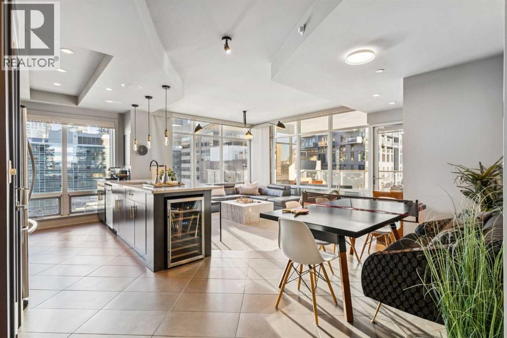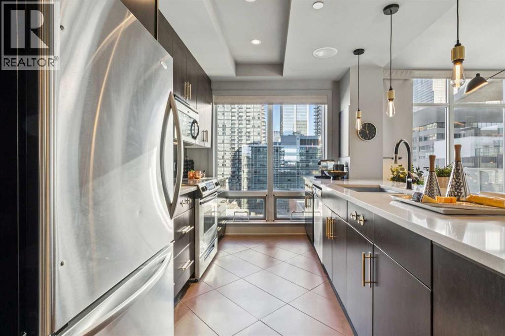This one-of-a-kind, designer-influenced home in Castello is ready for you to move in and start living your best downtown life. Freshly painted with new carpet, the space immediately sets itself apart the moment you enter. A welcoming entry area offers ample seating to unwind after your day, while built-in speakers throughout the dining & living rooms, and primary suite create the perfect soundtrack for your life.Floor-to-ceiling windows flood the home with natural light, highlighting the modern, linear feel of the layout. Step out onto the massive 300-square-foot terrace—ideal for outdoor dining, lounging, or entertaining. A natural gas sub provides endless fuel for the BBQ or fire table, making evenings on the terrace effortlessly memorable.The kitchen is a chef’s dream with quartz countertops, stainless steel backsplash, espresso cabinetry with striking bronze hardware, floor-to-ceiling windows, a large pantry, peninsula island with built-in beverage fridge, and an eating bar—perfect for entertaining or quick weekday meals. Custom HUPPE wall systems maximize storage without compromising style.The primary suite offers a lavish ensuite with dual sinks, glass-enclosed shower, and walk-in closet with custom built-ins. The second bedroom is ideal for guests or a home office. Designer lighting, new plumbing fixtures, in-suite laundry, and built-in speakers complete the thoughtful touches throughout.Castello’s exclusive amenities elevate city living: concierge service, fitness center, guest suite, heated/secure parking, and a car wash bay. With only five units per floor in this concrete-built building, privacy and quiet are guaranteed.Perfectly positioned in the heart of downtown Calgary, you’re steps from restaurants, cafés, pubs, bike lanes, grocery stores, parks, and wellness centers. Access nearby healthcare, including Sheldon Chumir, and even a pet-friendly hospital within the block.Luxury, convenience, and thoughtful design come together in this excepti onal downtown residence—perfect for the professional who wants it all. (id:63190)
