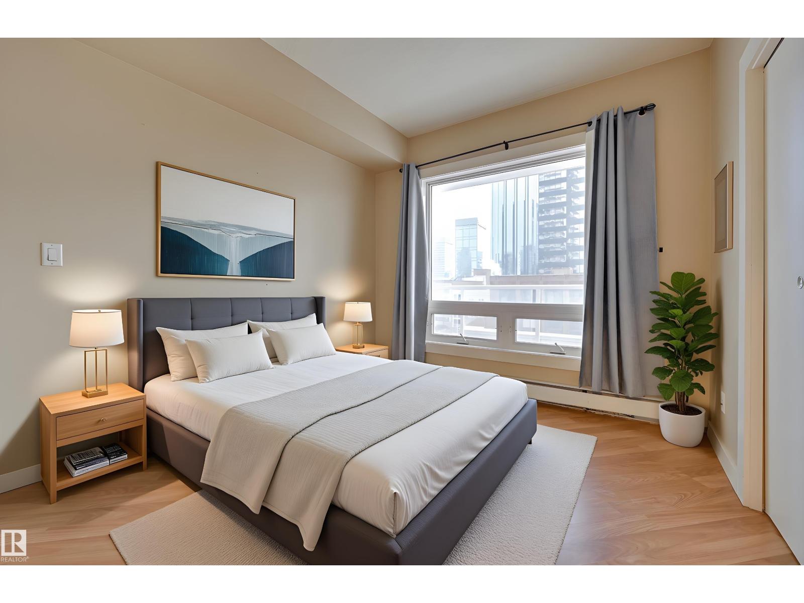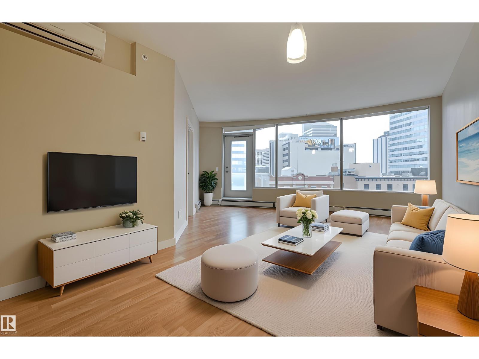 Located in the heart of downtown Edmonton, this south-facing 6th-floor condominium in the ICON South Tower offers an efficient, well-designed living space with city and downtown views. The layout features two bedrooms and two full bathrooms, ideal for professionals seeking flexibility and comfort.The open-concept kitchen includes four stainless steel appliances, complemented by hardwood and ceramic flooring throughout and 9-foot ceilings that enhance the sense of space. A built-in air conditioning system (upgrade), along with in-suite washer and dryer, adds everyday convenience.Enjoy an exceptionally large balcony with a natural gas BBQ hookup, providing valuable outdoor living space rarely found downtown. The unit also includes titled, heated underground parking.Centrally located with easy access to the LRT, office towers, shops, and restaurants via the pedway system, and within walking distance of the seasonal farmers’ market. Perfect for downtown buyers seeking location, convenience, and lifestyle. (id:63190)