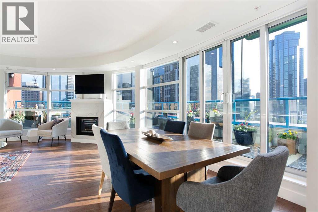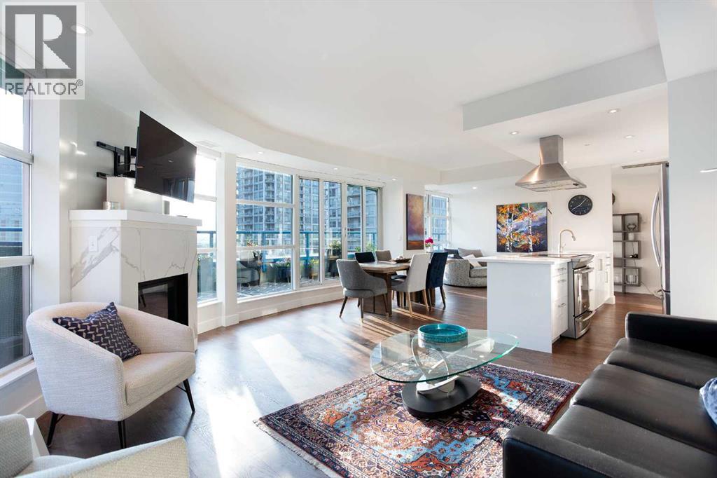 Welcome to your dream downtown retreat, just steps from the Bow River. This fully renovated sub-penthouse offers near 1,400 square feet of beautifully designed living space, featuring 2 bedrooms and 2 bathrooms, all tucked into one of Calgary’s most vibrant and walkable communities.As you enter, you're welcomed by luxury hardwood flooring that flows throughout the home, creating a seamless and contemporary feel. The open concept layout is bright, thanks to the floor-to-ceiling windows that flood the space with south facing light and offer stunning panoramic city views.The chef-inspired kitchen has been completely reimagined with sleek cabinetry, quartz countertops, an induction cooktop, and a modern hood fan. It’s perfect for everything from quick breakfasts to full dinner parties. The adjoining dining and living area is anchored by a beautiful fireplace, making it a cozy yet sophisticated space to entertain or relax.The first bedroom features floor-to-ceiling windows, a large walk-in closet, and a luxuriously renovated ensuite with dual vanities and a walk-in shower. A custom wall-mounted bed adds versatility, allowing the room to transform quickly. The second bedroom is equally flexible, offering floor-to-ceiling windows, a spacious walk-in closet, and easy access to the second fully renovated luxury bathroom, complete with high-end finishes and a stunning bathtub. You will also find a spacious laundry room with built-in, high-end cabinetry that provides extra storage and space.Step outside onto your expansive 300 square foot private terrace—whether you're sipping your morning coffee, hosting friends, this outdoor space is a true extension of your living area that comes with stunning downtown views.Additional features include in-suite laundry, central A/C, secure underground parking, remote controlled blinds, and a full-time concierge for added peace of mind.Situated just steps from the Bow River pathways, and some of Calgary’s top restaurants, cafés, this location offers the perfect blend of nature, and convenience. Whether you're walking your dog along the river or grabbing a latte with friends, everything you need is just outside your door. (id:63190)