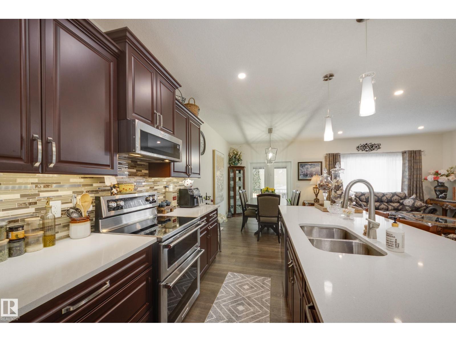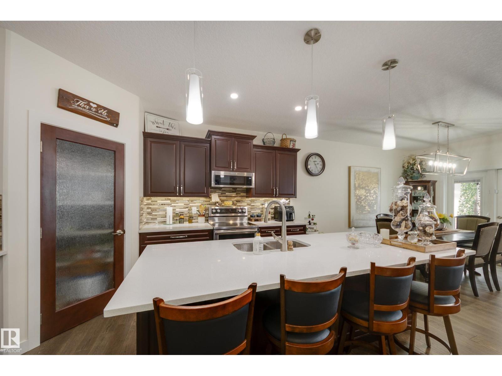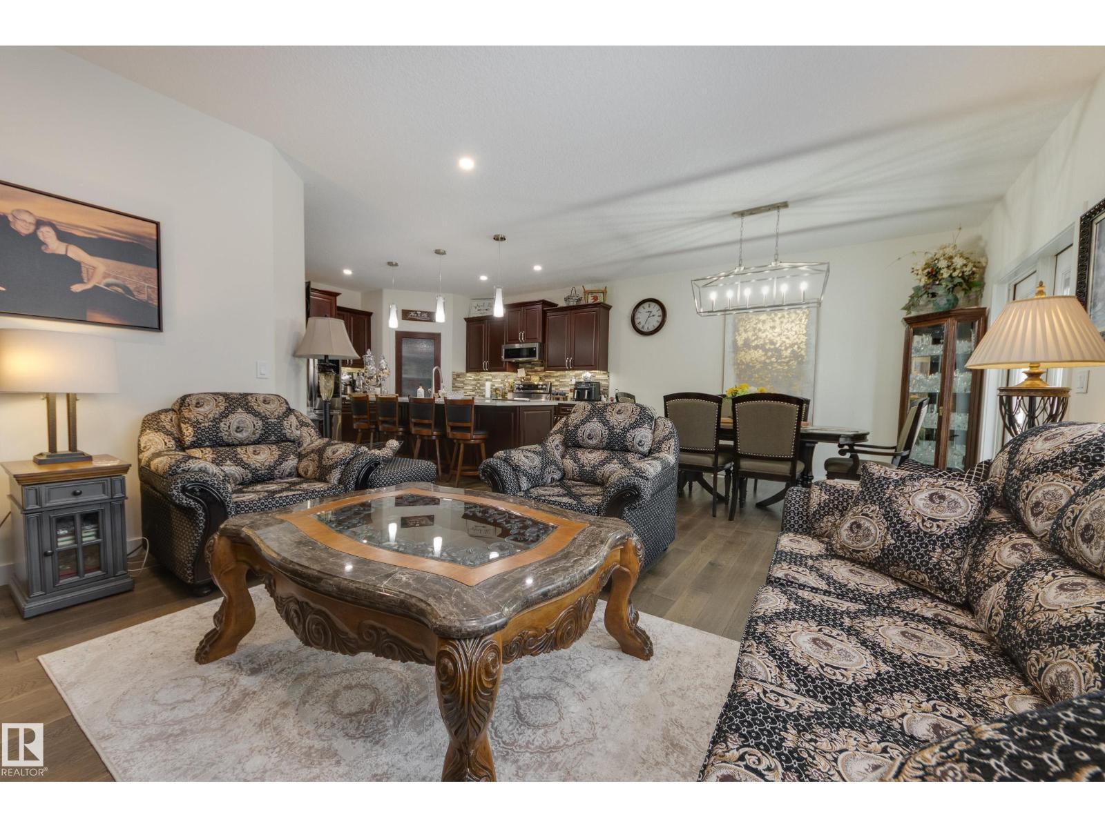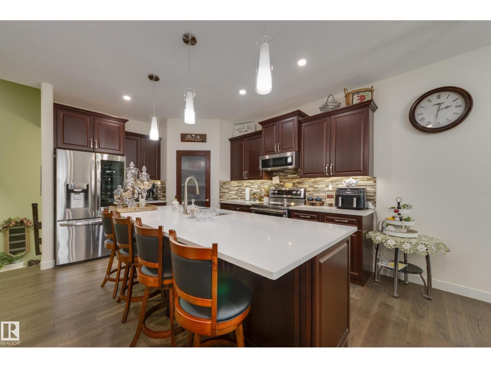 Welcome to this exceptional custom-built home in the quiet, family-friendly community of Gibbons! This thoughtfully upgraded bi-level was designed with comfort and function in mind. Enjoy an oversized heated attached garage, central A/C, 9’ ceilings, and a high-quality HVAC system that keeps the home comfortable year-round. The open-concept main floor features a bright living room and cozy gas fireplace. The designer kitchen stands out with upgraded maple cabinetry, soft-close doors and drawers, and custom finishings that elevate the entire space. Two well-sized main-floor bedrooms and a full 4-piece bath are perfect for kids, guests, or a home office. Upstairs, the private primary suite offers a quiet retreat with its own 4-piece bath. The finished basement adds a cozy family room and two large bedrooms, providing space and comfort for everyone. Outside, the fully landscaped yard includes multiple fruit trees, a gazebo for relaxing, an RV pad, and underground sprinklers. This home checks all the boxes! (id:63190)