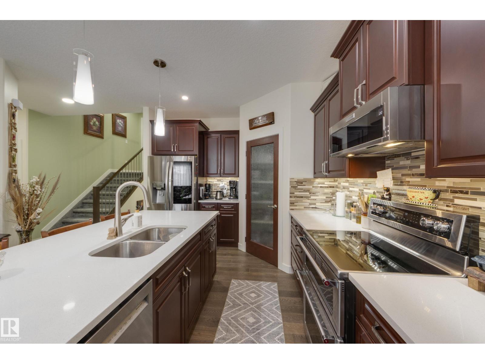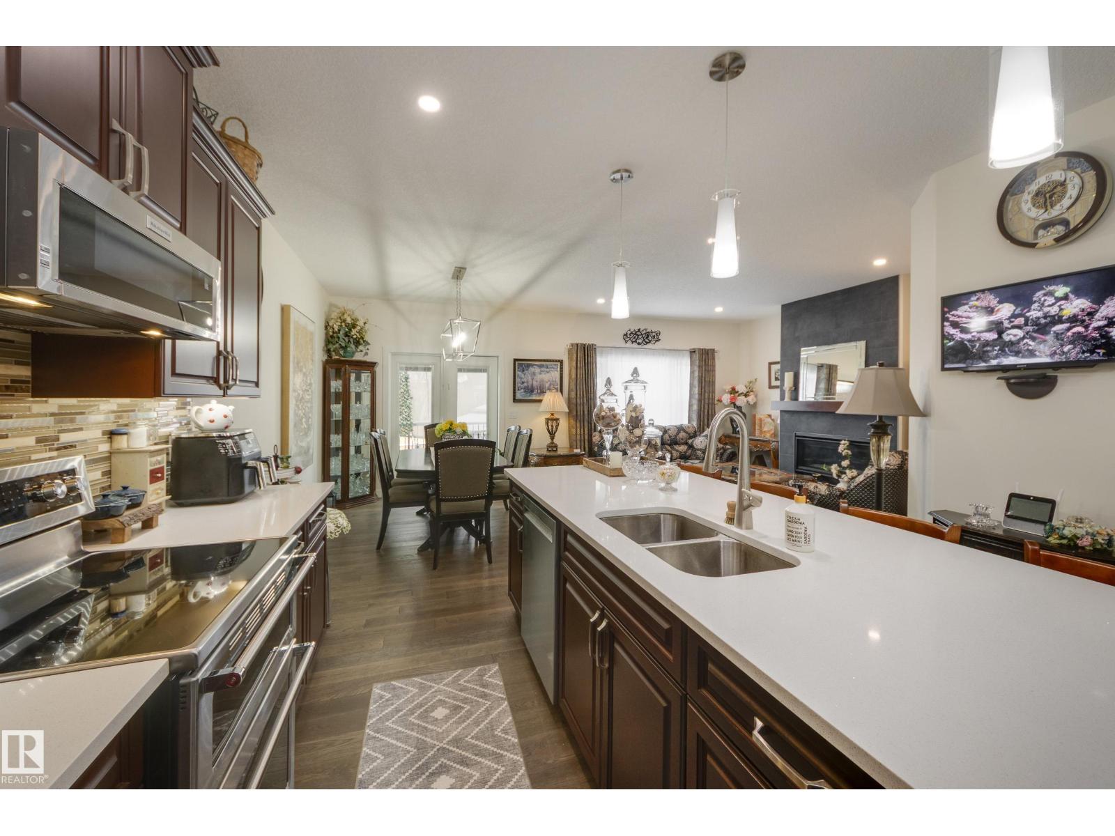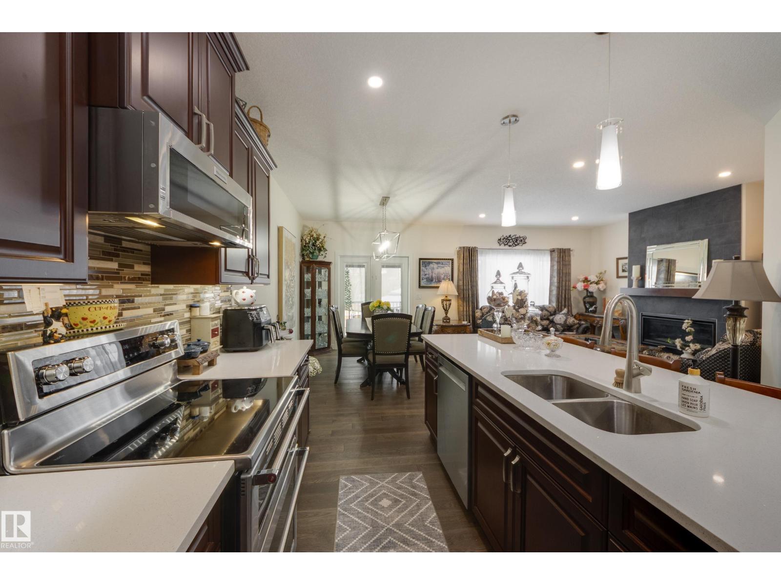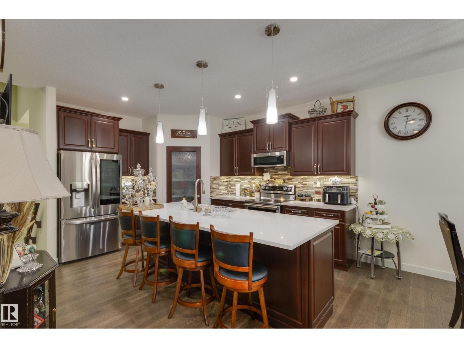 Welcome to this exceptional custom-built home in the quiet, family-friendly community of Gibbons! This thoughtfully upgraded bi-level was designed with comfort and function in mind. Enjoy an oversized heated attached garage, central A/C, 9’ ceilings, and a high-quality HVAC system that keeps the home comfortable year-round. The open-concept main floor features a bright living room and cozy gas fireplace. The designer kitchen stands out with upgraded maple cabinetry, soft-close doors and drawers, and custom finishings that elevate the entire space. Two well-sized main-floor bedrooms and a full 4-piece bath are perfect for kids, guests, or a home office. Upstairs, the private primary suite offers a quiet retreat with its own 4-piece bath. The finished basement adds a cozy family room and two large bedrooms, providing space and comfort for everyone. Outside, the fully landscaped yard includes multiple fruit trees, a gazebo for relaxing, an RV pad, and underground sprinklers. This home checks all the boxes! (id:63190)