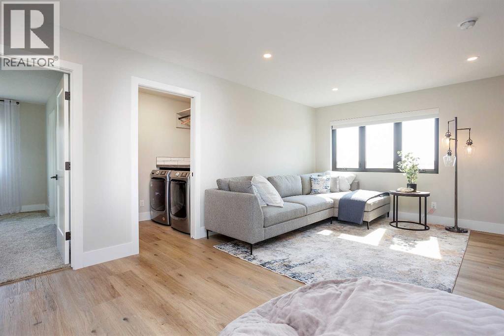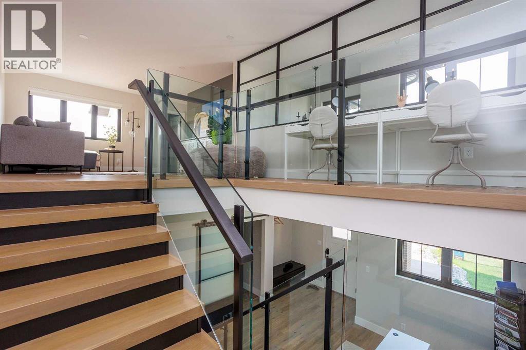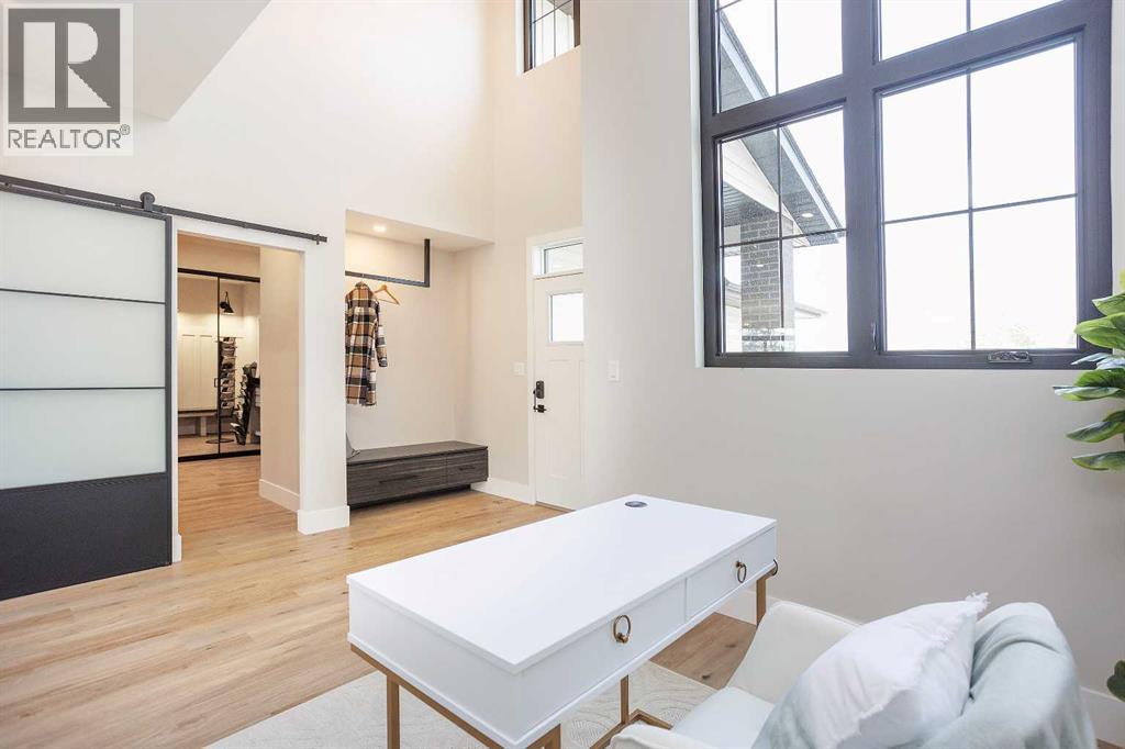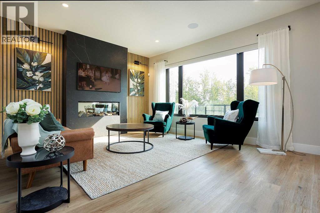 A brand new fully developed Larkaun Homes show home in desirable Evergreen. The curb appeal is accented by the aggregate front driveway & steps, the metal roof accents & vertical board & baton features. The front entryway greets you with towering 18' ceilings in the foyer & main floor office that overlooks the custom staircase with solid wood treads, two tone risers & custom glass guard rails. Ceiling height, soft close kitchen cabinets are accented by a massive island with an eating bar, full chevron tile backsplash, a Franke peak undermount granite bowl sink, a built in fridge/freezer combo, a gas stove with a pot filler, wine storage, a pantry style cabinet with pullouts, a custom wood hood fan & quartz countertops. Walk through the butler's pantry with a prep sink & beverage centre to the back entryway that has mirrored sliding closet doors, a bench seat & built in cabinetry for storage. The powder room has decorative wallpaper, a furniture style vanity accented by a hammered stainless steel under mount sink. The eating area has patio doors to the 14'x8' + 16'x14' composite rear deck. Relax in the living room next to the british fires forest 48" electric fireplace featuring matte black quartz slab surround. Follow the stunning custom staircase up to the bonus room that adjoins to the desk stations with a custom welded wall with glass inserts that overlook the main floor. The king sized primary bedroom has a large window that overlooks the back path & trees, a fan, reading lights on each side of the bed & an oversized walk in custom closet. The gorgeous 5 piece ensuite features heated tiled floors, a 60"x36" curbless walk in tile shower with a built in storage niche, dual heads including a rain head & a sliding hand shower, a freestanding tub below the picture window, double sinks, a makeup counter with an LED mirror, and a water closet with a window. There are two additional bedrooms, a 4 piece bathroom & a laundry room (smart drain under the washing machine) wi th builtins including baskets & a folding counter. The fully finished basement has operational in floor heat with a family room featuring a sports bar (includes a built-in ice maker & beverage centre), a 4th bedroom, an exercise room with full glass wall and a 4 pc bathroom. The fully landscaped yard backs onto a walking path & treed area. The oversized garage has premium flake epoxy floors, a gas heater, floor drains, a smart car plug in & a rear garage shed with backyard access through the 7'x7' overhead door. Features of the home include: Central air conditioning, basement & ensuite has in floor heat, window blinds, luxury vinyl plank flooring, high quality carpet with an 8lb underlay, solar panel ready, Lutron smart home system connects to the power blinds, pot lights and Sonos system, video doorbell and security cameras, Sonos speaker in the kitchen, living room and sun deck, central vac with floor sweeps & more! Evergreen is an HOA and the fees are $100/year at this time. (id:63190)