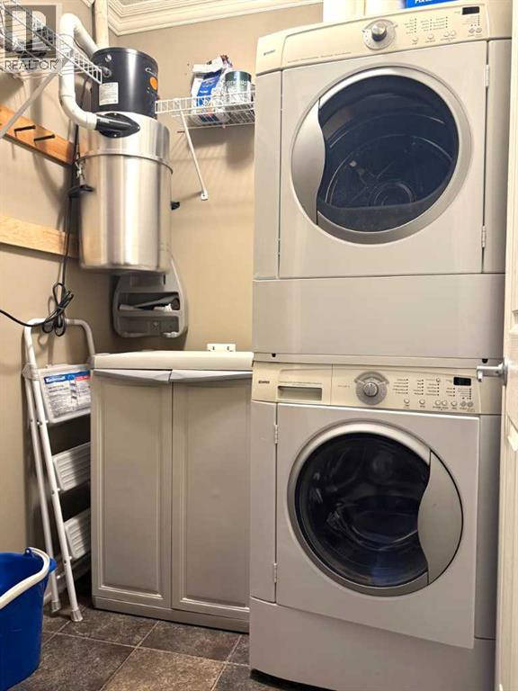 Affectionately nicknamed "The Castle" , the Royal Village is the grande dame of condominiums in Fort McMurray. Located steps from Snye Point park and Haxton pond, this garden unit penthouse has everything one could dream of in a home. Entering this corner unit you are greeted by a large front entrance and the vastness of just how large these condos are. There's ceramic tiles and new hardwood flooring. Open concept kitchen features a sit up peninsula, stainless steel appliances and real wood custom cabinetry. Large dining area with patio doors to deck, massive turret living room with a stone fireplace, 5 windows and a cutout to the den which could also be used as a breakfast nook. The primary suite will make you think you are in your own private honeymoon hotel suite. Room for a king size bed and dresser, your eyes can't help notice the 2 person jetted tub in the middle of the room. There's also a large closet with mirrored doors, spacious dressing area, stand up shower and a private room for the lavatory. The 2ed bedroom is large with 2 closets and access to the main 3 pce bath though a pocket door. There is also a laundry room with a stackable washer/dryer and central vac. Ten foot ceilings with crown moldings, in floor heat and double drywall for sound make these a truly unique condo living experience. This unit is owned by the original owners and is not uncommon to meet people who have lived in the Royal Village for 10-15 and 20 years. If you're young and want to impress, if you're downsizing from a large home and don't want to loose the grandeur or if you just like to be truly comfortable, this unit will not disappoint. Close to biking and walking trails, steps to Mac island and golf, shopping and nightlife. (id:63190)
