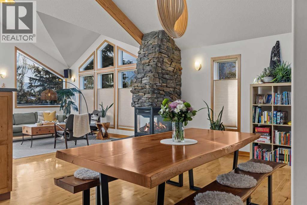 A rare detached home in the heart of Lions Park, one of Canmore’s most walkable and sought-after neighbourhoods. Steps from Main Street, the Bow River, shops, cafés, restaurants, and pathway systems, this location offers true in-town living with privacy.The five-bedroom home features vaulted ceilings, exposed wood beams, a stone fireplace, and large windows that flood the main level with natural light and mountain views. The open layout connects seamlessly to the kitchen and dining area, perfect for everyday living and entertaining. A unique lofted space accessed by ladder offers flexibility as a yoga retreat, office, or quiet escape. The main level also includes a primary bedroom with ensuite and private balcony, plus two additional bedrooms and a full bathroom.The lower level offers excellent space for a growing family, featuring two additional bedrooms, a renovated bathroom, a rec room, and its own laundry area, along with a private walkout entrance. The home also includes solar panels for improved efficiency, a double car garage, and a dedicated workshop at the back of the garage. Out front, the deck overlooks Lions Park and provides immediate access to tennis courts and scenic walking pathsA rare combination of location, privacy and mountain views in the heart of Canmore. (id:63190)