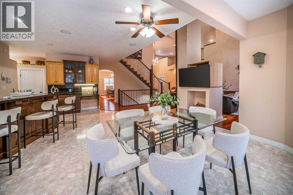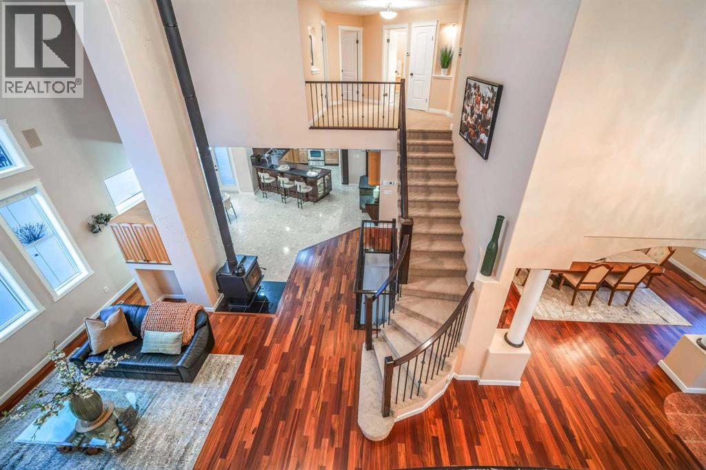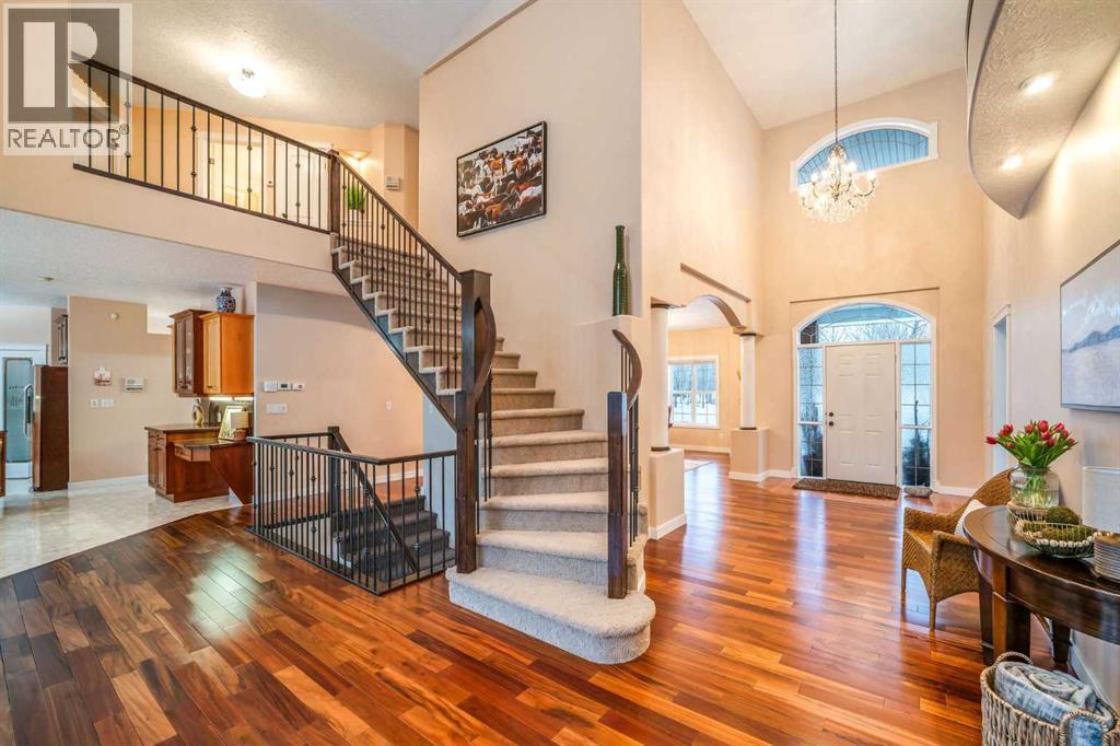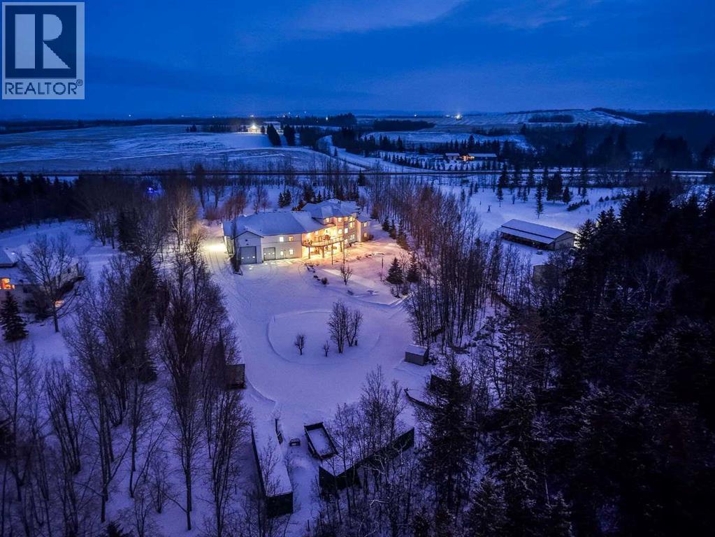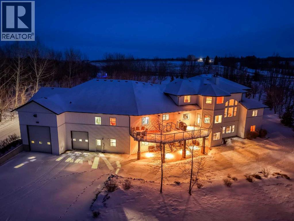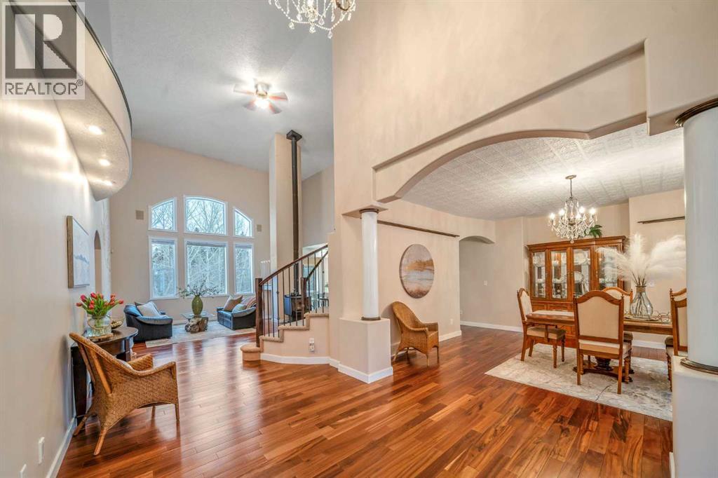 Perched high above the Red Deer River in the prestigious enclave of Olinda Meadows, this remarkable estate acreage offers a lifestyle rooted in space, privacy, and everyday ease - just ten minutes from Red Deer shopping, dining, and services, Canyon Ski Lodge and Parkland Nurseries only moments away. Set on 3.01 beautifully treed acres, the property is introduced by a gated, meandering driveway that winds through mature trees and opens to a home that feels both commanding and welcoming. Elevated topography delivers sweeping views, dramatic skies and constant connection to nature, with birdlife and wildlife as part of the daily rhythm. With over 10,000 square feet of developed living space, this residence was purpose built for families who value room to gather, entertain and grow. Soaring ceilings, beautiful hardwood flooring and expansive windows create an open and airy feel throughout. A formal dining room sets the stage for special occasions, while the bright dining nook offers a relaxed space for everyday meals and opens directly onto a sprawling deck that spans the width of the home, perfect for summer gatherings, dining al fresco or enjoying a quiet morning coffee surrounded by treetops. The kitchen is designed for function and flow with a walk in corner pantry, generous cabinetry and seamless connection to the main living areas. A main floor home office, dedicated laundry and sewing room, and thoughtfully designed storage including multiple storage rooms add to the home’s exceptional livability. The flex loft overlooking the main level provides additional space for work, play or retreat. Two wood burning stoves anchor the home with warmth and comfort, creating cozy gathering spaces year round. The walkout lower level mirrors the lifestyle above with expansive recreation areas, custom bar and theatre room, while offering shaded outdoor enjoyment on warm days, allowing you to choose how and where you take in the surrounding beauty. A gym area in the mezzanine o f the impressive shop adds yet another layer of versatility. A true standout, the massive attached shop with soaring ceilings accommodates a motorhome, multiple vehicles, workshops, storage and hobbies with ease, ideal for enthusiasts and business owners alike. RV parking and services further enhance the lifestyle. Built with pride and exceptional care, upgrades include newer exterior siding, shingles, 2x8 wall construction with staggered studs, forced air and hot water heating with dual boilers and fan coils, two air conditioning units, paved circular drive, security gate and camera system. Unique artistic wall engravings reflect the craftsmanship and character found throughout, reinforcing that this is a home meant to be experienced in person. Lovingly maintained by the original owners who built it from the ground up, this is a rare opportunity to secure a legacy acreage and forever home. (id:63190)