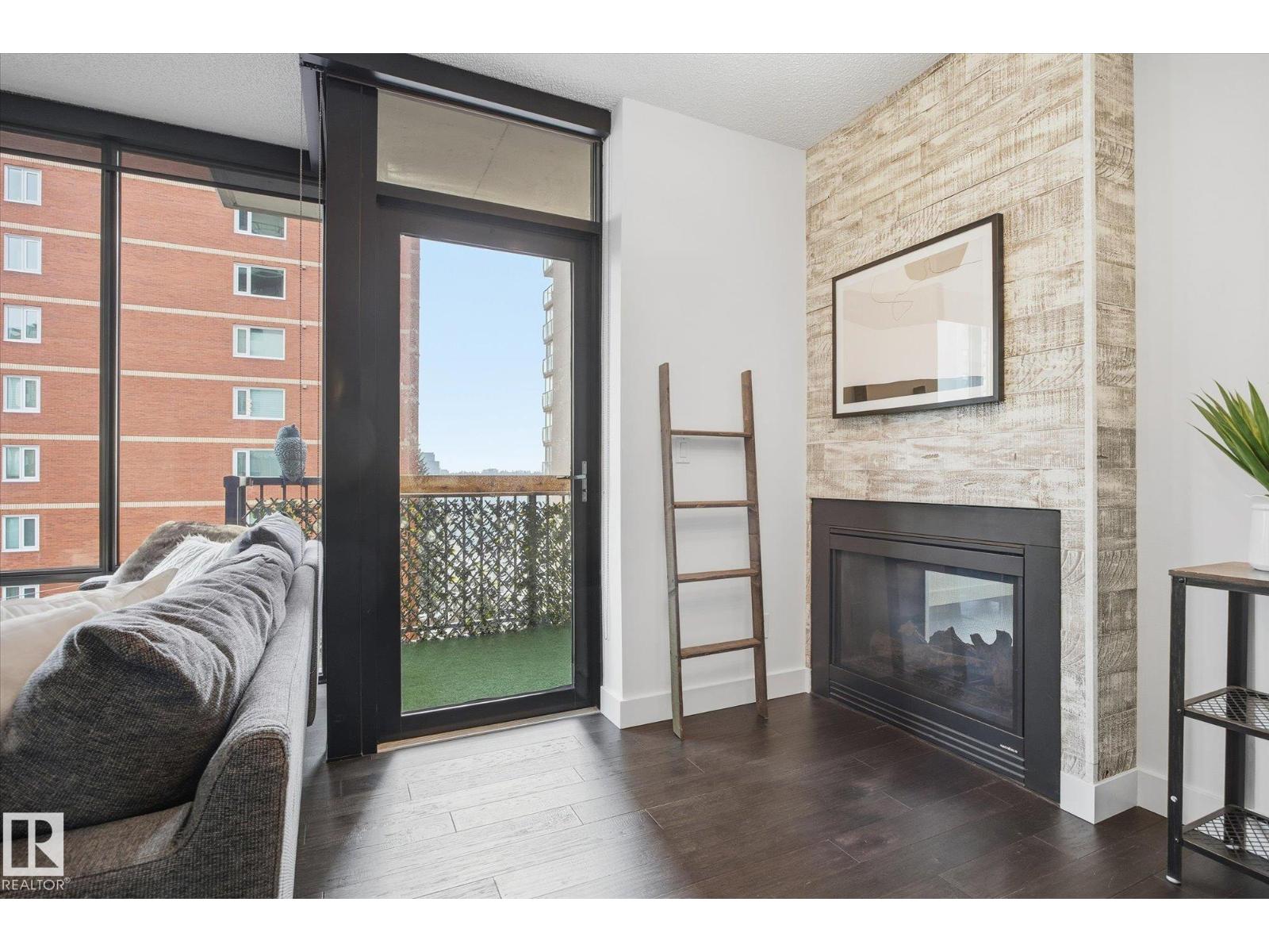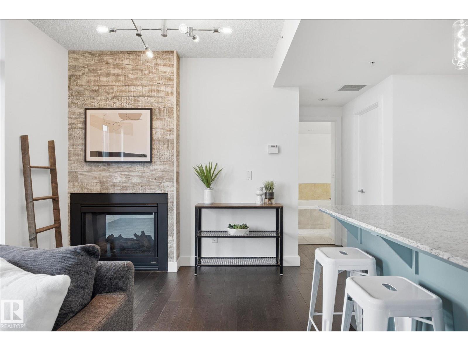 This stunning condo offers a bright and spacious living room featuring floor-to-ceiling windows and a cozy fireplace—perfect for relaxing. The renovated modern kitchen is both stylish and functional, with an island for extra prep space and warm pops of color in the BRAND NEW cabinetry. The bedroom also includes its own fireplace, creating a comfortable and inviting retreat. The bathroom features a luxurious soaker tub. Step outside to enjoy your private balcony. Located just steps from tons of restaurants, shopping, and entertainment. Includes one stall in a heated garage. A perfect blend of comfort, style, and convenience! (id:63190)