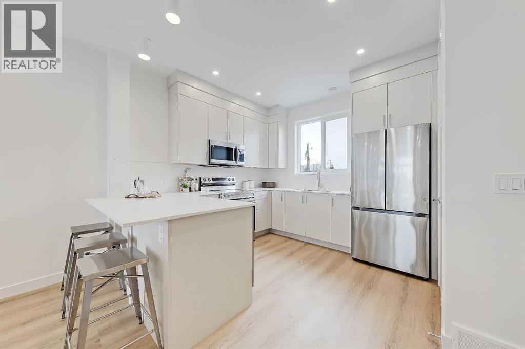 Incredible opportunity for a BRAND NEW, MOVE-IN READY TOWNHOME in Glenbrook! This townhome project is AIRBNB FRIENDLY, plus first-time home buyers could qualify for up to a 100% GST REBATE* on their purchase! This listing includes TWO titled units: one upper-level 2-storey unit (#109) featuring nearly 1,100 sq ft, with 2 beds, 2.5 baths, and a single detached garage, PLUS one lower-level unit directly below (#102) boasting a sunny main floor plus a FULLY FINISHED BASEMENT totalling nearly 1,000 sq ft of developed living space, with 2 beds & 2.5 baths. Live in one and rent the other, or combine both for personal use and have a 4-bedroom townhome with over 2,000 sq ft of living space! Both units feature a sunny and bright open-concept living space, with sleek, low-maintenance luxury vinyl plank (LVP) flooring and large windows. The fully equipped modern kitchens boast dual-tone slab-style cabinetry, quartz countertops, and Samsung stainless steel appliances, including a French-door refrigerator and ceramic-top stove. Completing the main floor of both units is a spacious dining area perfect for family meals and entertaining, a living room with large windows for ample natural light and a stylish 2-piece powder room. The upper-unit level (#109) features a lacquered spindled railing leading to the sunny upper floor, where 2 bedrooms and 2 full bathrooms await. The primary bedroom boasts a 3pc ensuite and a private balcony. Down the hall is a well-sized 2nd bedroom boasting easy access to the main 4pc bathroom. Each bathroom features custom cabinetry, quartz countertops, undermount sinks, and fully tiled showers. The lower-level unit (#102) fully developed basement features 2 bedrooms and 2 full bathrooms. Each bathroom boasts custom cabinetry, quartz counters, undermount sinks, and tiled tub/showers. Plus, both units feature a convenient in-suite laundry closet with a stacked washer/dryer. Durable and stylish, the exterior features Hardie Board and Smart Board detailing, and brushed concrete steps and walks. Located in the heart of the sought-after SW inner-city community of Glenbrook, these brand-new townhomes boast a fantastic location right across the street from Glenbrook School and the Glenbrook Community Association. A number of major amenities are located within an easy 15-min walk, including Safeway, Glamorgan Bakery, and multiple restaurants including Richmond’s Pub. Plus, nearly every imaginable amenity can be found in nearby Westhills and Signal Hill Centres which are just a 6 minute drive away. Sarcee Trail and Richmond Rd are both readily accessible. *Interior photos are taken from a similar project by the same builder - details may vary. *Buyers must qualify for the GST rebate program, enquire for details. *VISIT MULTIMEDIA LINK FOR FULL DETAILS INCLUDING FLOORPLANS* (id:63190)