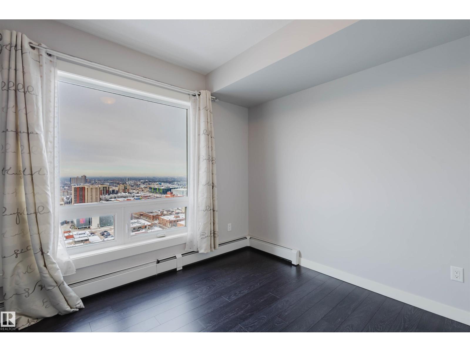 Imagine walking to an Oilers game, then unwinding on your WEST-facing balcony while reflecting on an exciting overtime win while watching the stunning night city skyline? Welcome to this 22nd-floor condo in FOX ONE, offering 2 bedrooms, 2 full baths, and underground TANDEM double parking stalls. The bright open-concept layout features rich laminate flooring throughout. The gourmet kitchen is equipped with quartz countertops, stainless steel appliances, and contemporary cabinetry—perfect for everyday living and entertaining. The primary suite provides a peaceful retreat with a 4-piece ensuite and walk-through closet. A spacious second bedroom features a large west-facing window, filling the space with natural light. Enjoy breathtaking city views from your private west-facing balcony with BBQ gas line. Unbeatable downtown location—steps to Rogers Place, MacEwan University, LRT, restaurants, and shopping. Experience vibrant downtown living at its best! (id:63190)