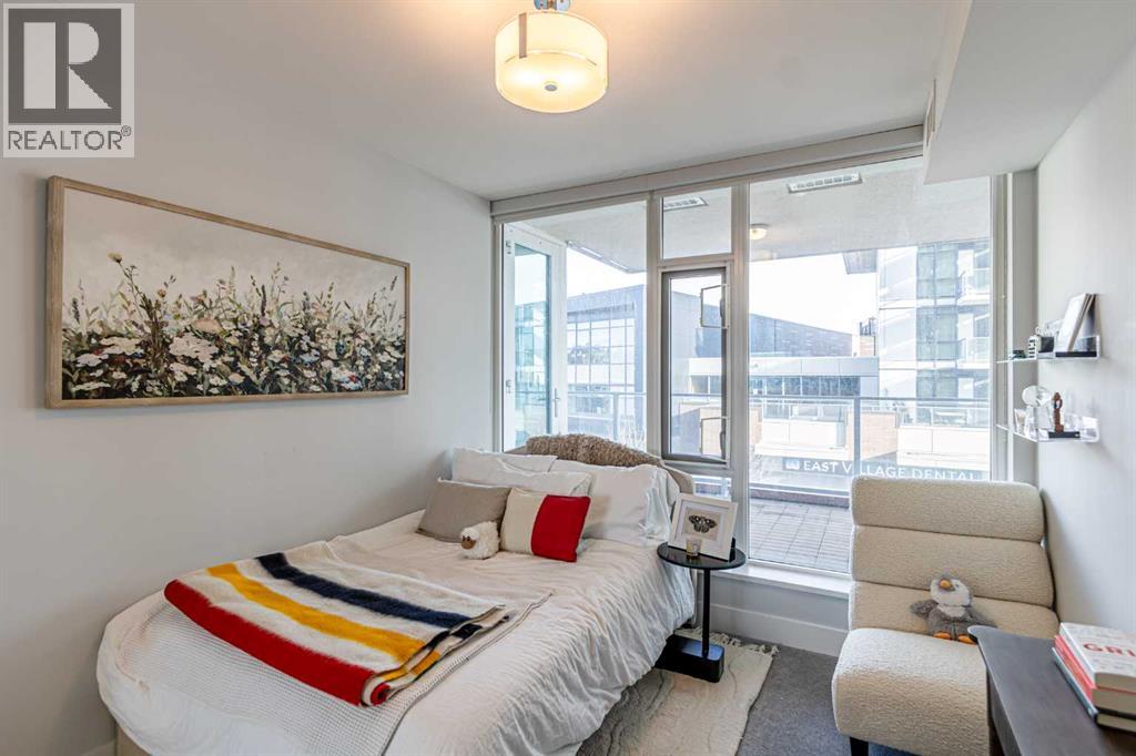 Discover the ultimate condo living experience in this stunning 2 bed + den unit at Evolution by Bosa Developments, nestled in the vibrant East Village of Downtown Calgary. This immaculate residence boasts an impressive and rare **500+ sq ft private patio** with sunny south exposure, a rare find in condo living—perfect for entertaining or enjoying a quiet evening outdoors. The thoughtful floor plan includes two spacious bedrooms, with the primary suite featuring an ensuite bathroom and a walk-in closet. The stylish kitchen is equipped with upgraded stainless steel appliances, including a gas range, elegant granite countertops, and a convenient breakfast bar, seamlessly flowing into the adjoining dining room and spacious living room, which provides direct access to the coveted outdoor space.Additional highlights include in-suite laundry, a den for your home office or extra storage, and parking for two vehicles in a tandem stall—eliminating the hassle of street parking and car shuffling. Residents enjoy exceptional building amenities, including concierge services, two fitness rooms, a steam room, sauna, and underground visitor parking. Located just steps away from transit, the C-train, river pathways, the zoo, and Prince's Island Park, this condo offers an unbeatable lifestyle in a thriving community. Don’t miss this wonderful opportunity to call this immaculate space home! (id:63190)