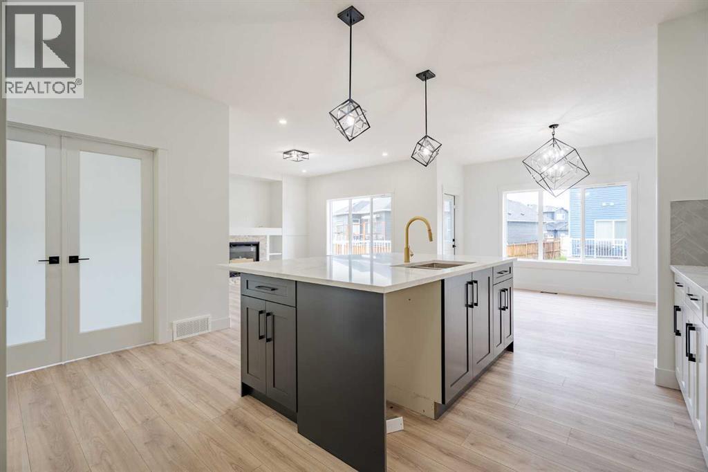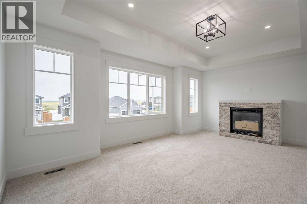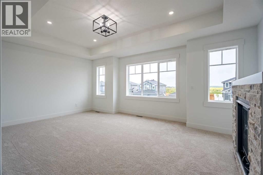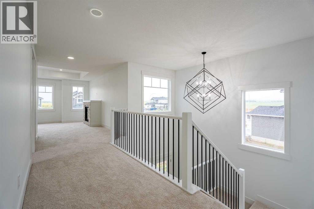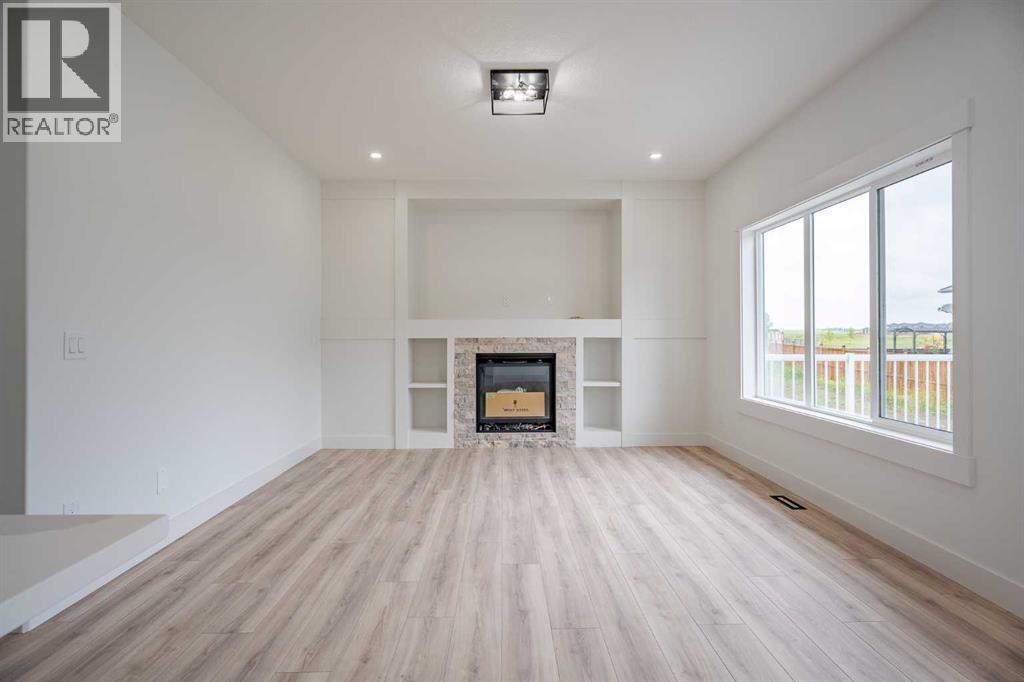 Quick Possession and Brand New with Triple Garage on a spacious lot with 51' frontage and 120' deep. Quick possession is available, and a Fall Special allows buyers to inquire about discount pricing to add a complete basement development. 2,372 sq.ft. two story with attached triple garage (28' x 23') and side access walk-up basement. Bright, open plan with spacious main level dining nook, kitchen with island and walk-through pantry (wood shelving) to spacious mud room (wood bench + shelves), family room with built-in shelves and fireplace, private Work From Home Office, two piece bath and spacious open cathedral front entry. Three bedrooms on the upper level including 15'9" x 14' Primary suite with raised tray ceiling and large walk-in closet (wood shelving), 5 piece Ensuite, bonus room with raised tray ceiling and fireplace, laundry room and 4 piece main bath. Bright undeveloped side access basement has high efficiency mechanical, roughed-in bath plumbing, and large windows for lots of natural light. Will be nicely appointed with ceiling height cabinets, quartz counter tops, upgraded lighting, vinyl plank, tile + carpet flooring, wood shelving in all closets, upgraded exterior and stonework. Includes GST (rebate to builder), new home warranty, rear deck with vinyl cover, front sod + tree, and $5,000 appliance allowance. Great family community with school, park and pond nearby, recreation facilities, and a quick commute to Airdrie, Balzac Mall, Calgary, or hospital nearby at Didsbury. A little drive, a lot of savings! (id:63190)