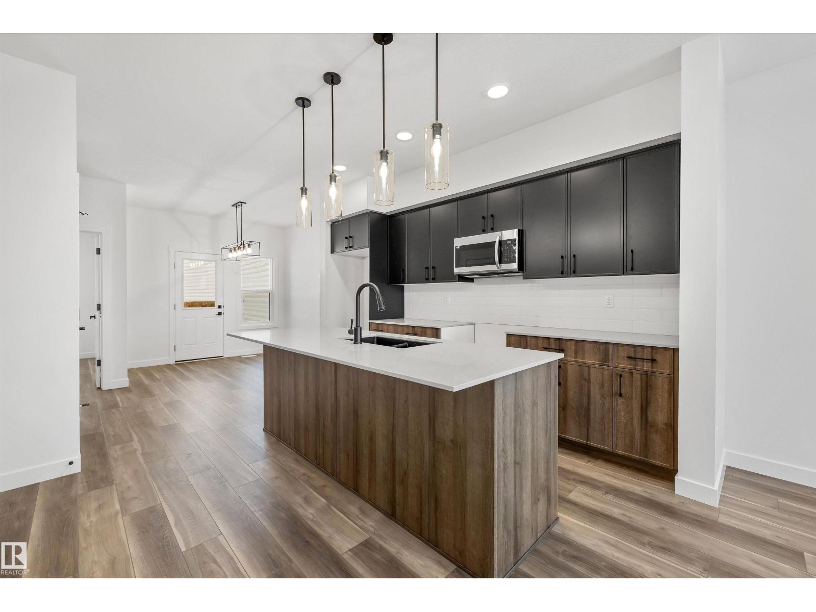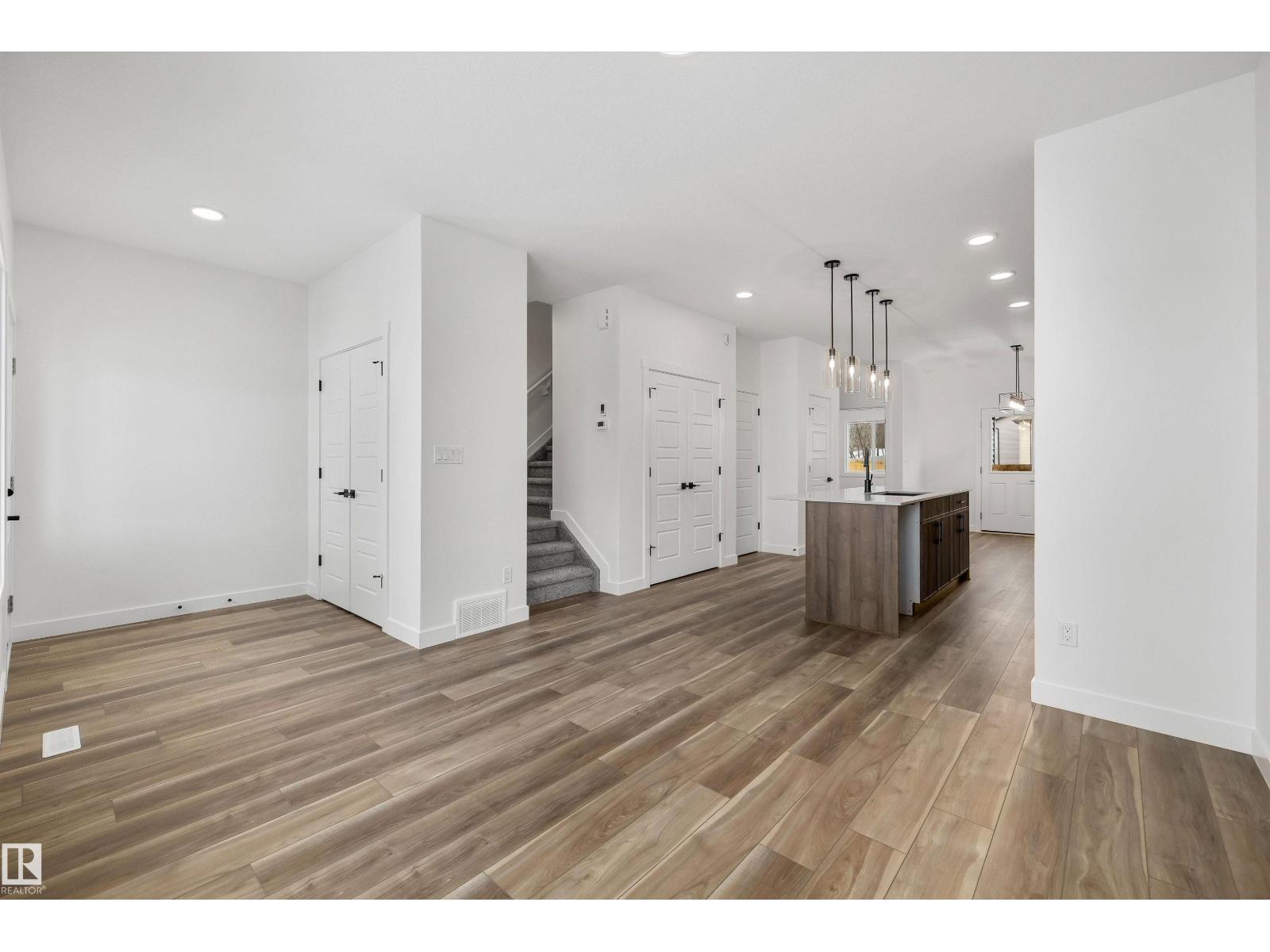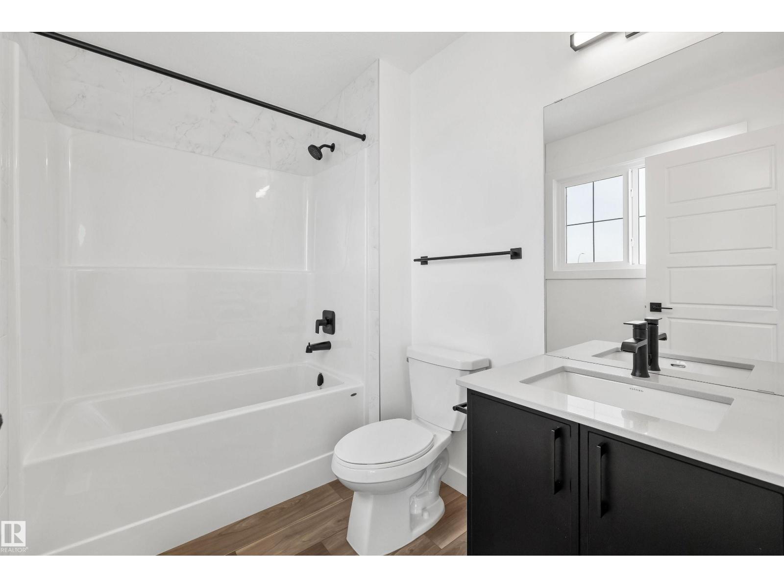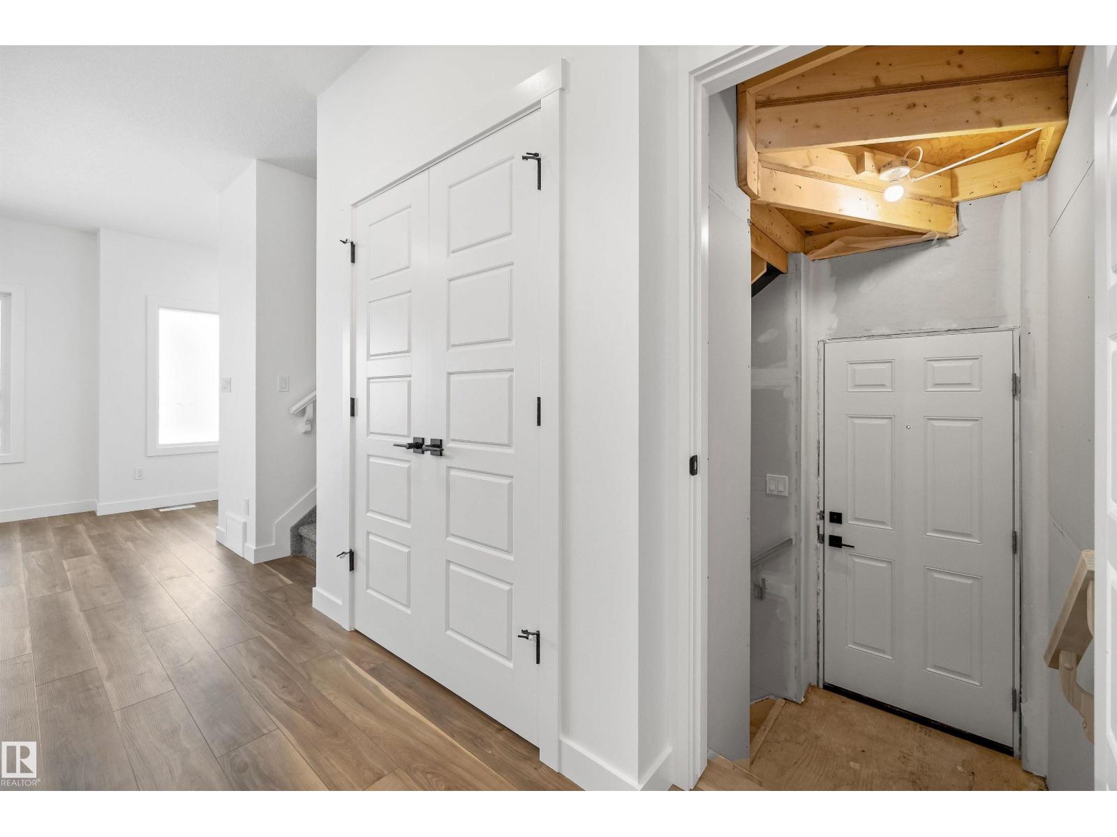 The Sylvan showcases elite craftsmanship, featuring 9’ ceilings and Luxury Vinyl Plank flooring that spans from the welcoming foyer to a sun-drenched front great room. The central kitchen serves as a high-end hub with stone surfaces, a flush-ledge island, and premium soft-close cabinetry. A unique highlight is the main-floor fourth bedroom and adjacent full three-piece bath, offering a private space for guests or a home office near the rear nook and garden door. The second level balances privacy and utility, hosting a primary suite with a walk-in closet and ensuite, plus two additional bedrooms and a dedicated laundry closet. Finished with bold black hardware, a separate side entrance, and a basement rough-in, this layout offers versatile living on every level. Outside, a rear parking pad provides space for an optional double garage. (id:63190)
