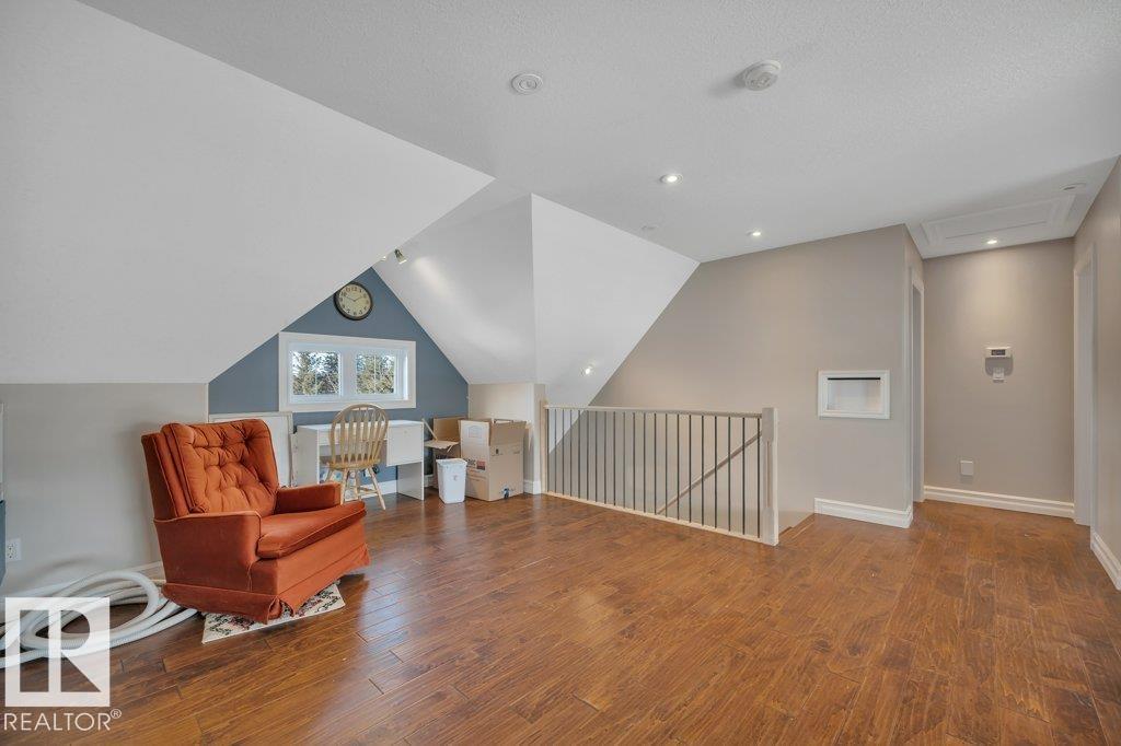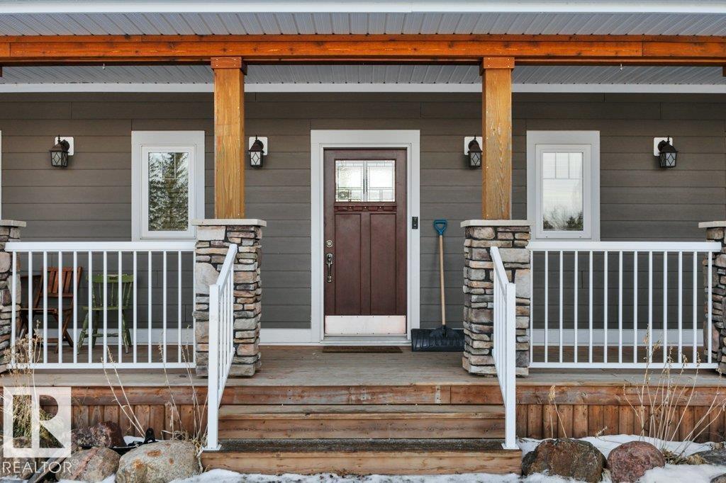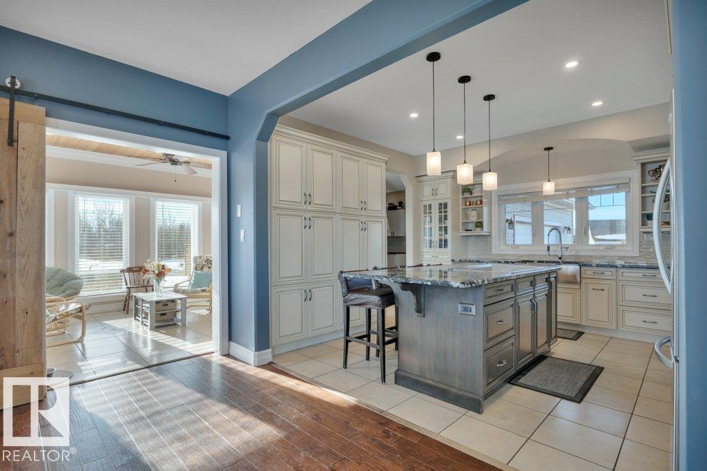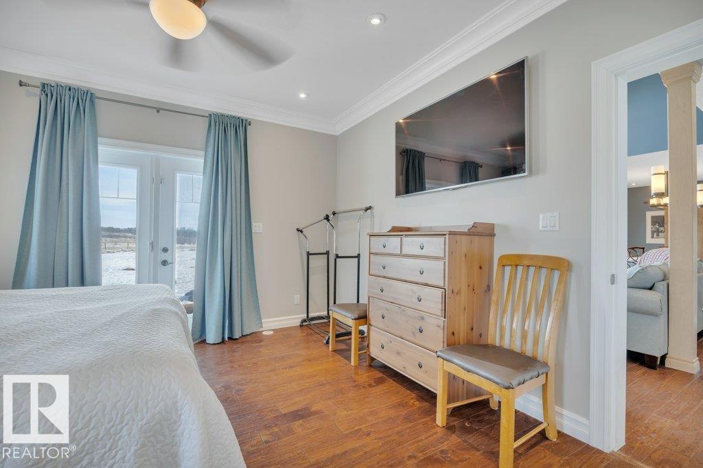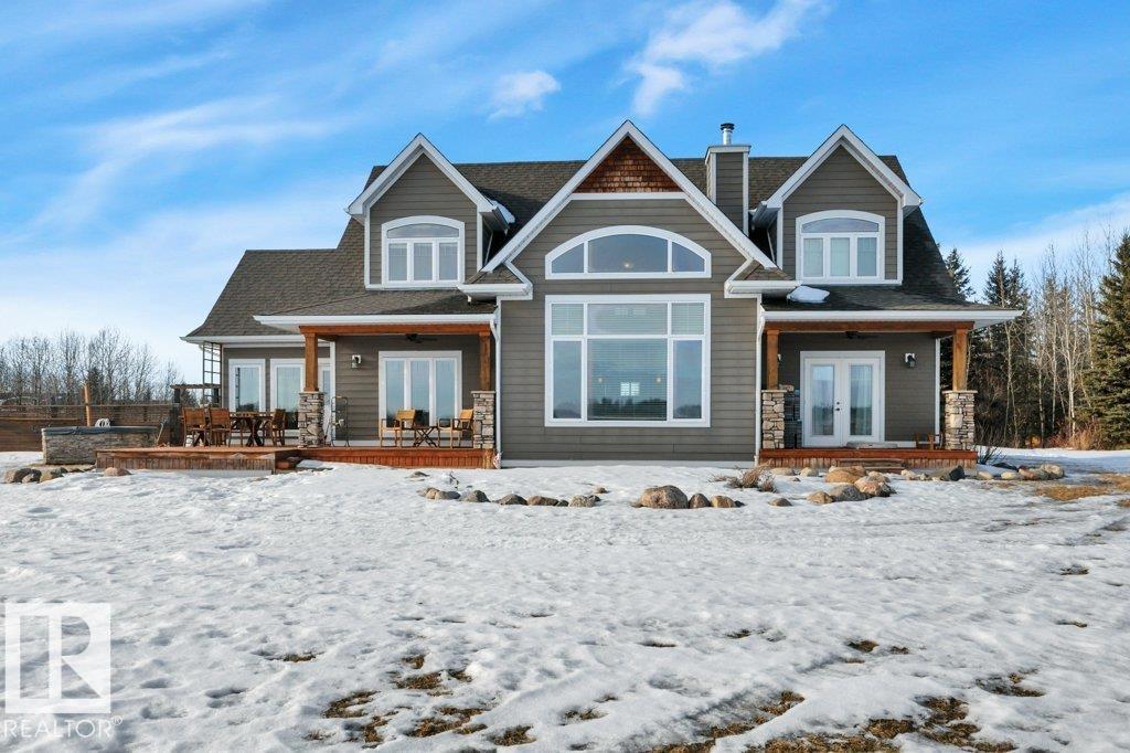 Perfect family living on 4.37 acres. This 6-bed, 1.5-story home features durable Hardie Plank siding and a secure electronic gate. The 1,700+ sq. ft. main floor boasts a master retreat with ensuite, a bright sunroom, and a custom kitchen with a walk-in pantry. Vaulted ceilings in the living area feature a gas fireplace and an open view to the upper floor, which includes a convenient laundry chute for busy families. The property is highly versatile with a private guest suite above the double attached garage. The finished basement is built for fun with custom built-ins for a media center, a wet bar, and a pool table. Outside, the fully fenced yard backs onto farmer’s pasture, featuring an above-ground pool with deck, hot tub, fire pit, play center, storage shed, and greenhouse. Located in a quiet subdivision just 20 mins to the Edmonton International Airport. Space, privacy, and function for the whole family. (id:63190)