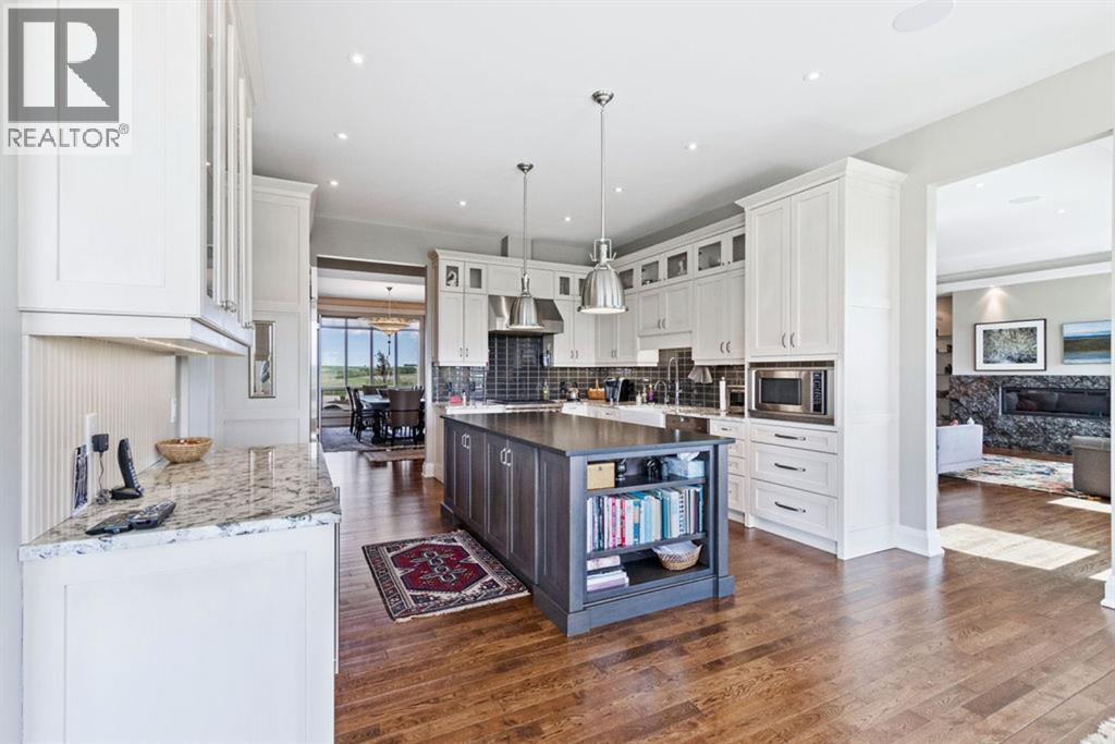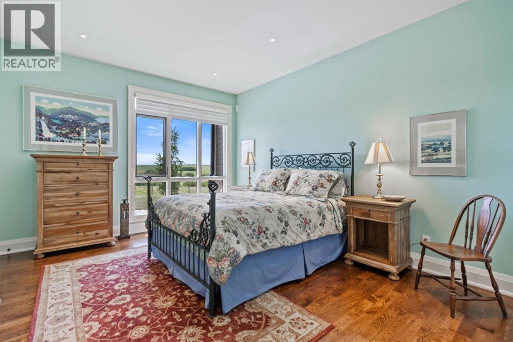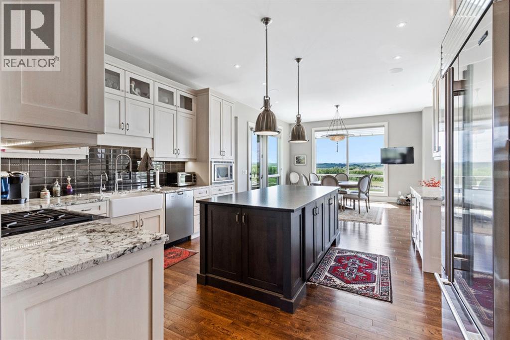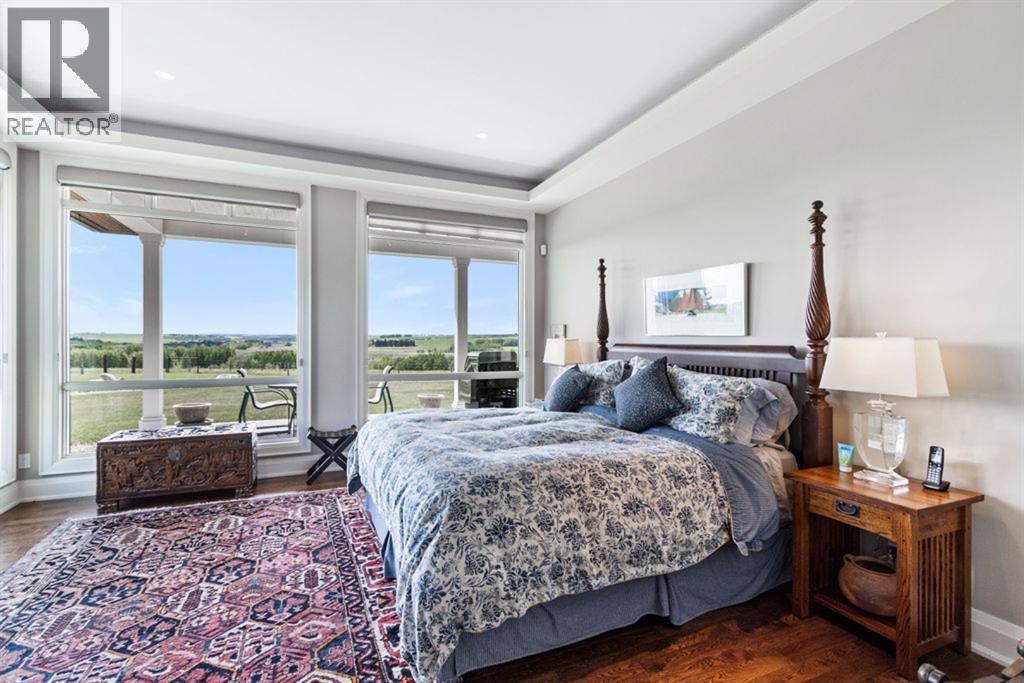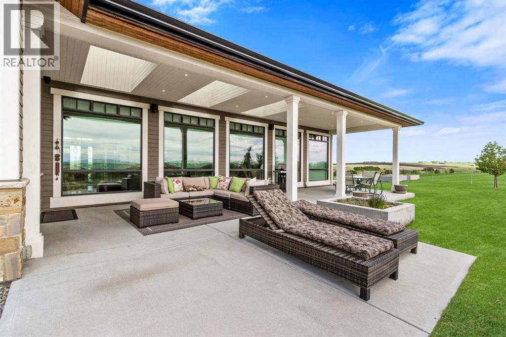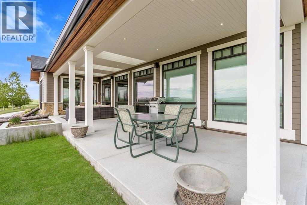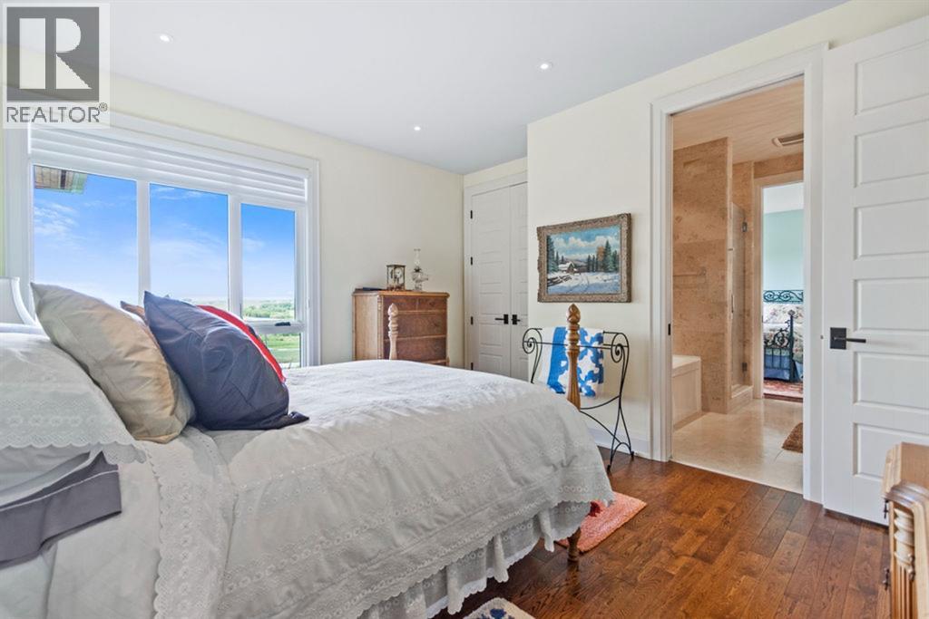 Stunning Custom Built Bungalow sitting atop the biggest hill on 122 acres with breathtaking views in all directions. Unobstructed mountain views to the west, golf course to the north, the friendly hamlet of madden east and south for miles! Enter from your gated private paved lane-way and find this architectural thing of beauty at the peak. This home is just shy of 4000 sq/ft on the main level and boasts another 2700sq/ft of developed space in the basement. The main floor has gleaming hardwood flooring throughout along with slate entry and heated tile flooring in all the bathrooms. Oversized low UV transmission windows with Hunter Douglas blinds throughout helps capture the most amazing landscapes. The executive chefs kitchen has stainless steel appliances including a Wolff gas stove, Sub Zero fridge, Dacor wall oven and microwave. All cabinetry milled by Legacy with soft close and upgraded shelving and storage. Huge center island with Cambrian Black satin granite is a classic focal point in this exquisite home. There are two dining areas for all sizes of gatherings and a huge living room with descending TV from the ceiling and natural gas fireplace. The large master bedroom comes with a 4 piece en-suite with modern tiled shower, his/her sinks in Bianco Rhino marble and a walk in California closet. Main floor is completed with two other bedrooms with California closets and Jack n Jill 4 piece bathrooms, an office, and den adjacent dining room. The second fireplace is found in the library or study for those that like to kick back with a glass of wine and enjoy a good book. Basement is finished with a huge family/ games room and tons of storage. The attached triple garage measures 38x22 it has a separate entry and big bright windows and upgraded wood doors. The west facing concrete patio is covered with skylights so you can enjoy it in all weather! The property is professionally landscaped with mature trees and raised garden boxes for the green thumb. Extra features i nclude 2 independent furnaces and AC systems, in-floor heating, water softening system, instant hot water, in-wall Vacu flo, Sonos sound, Security system and more! Combination of pasture and grade A crop land with good perimeter fencing. Rare opportunity to own a beautiful parcel of land this size commutable to Calgary with an equally magnificent home to match! (id:63190)