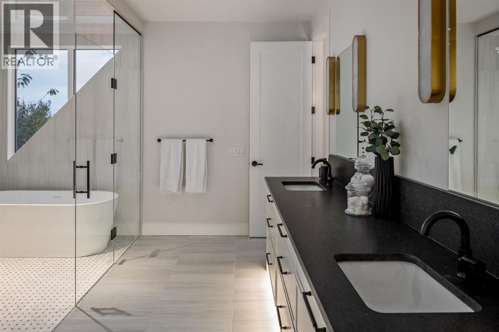 Open Houses Saturday April 25th 12:30-3:30PM & Sunday April 26th 2-4PM! Homes on this exclusive ridge rarely come to market, and this breathtaking two-storey estate is a shining example of elevated inner-city living. With 5,545.89 sq.ft. of exquisitely developed space, this 6 bedroom, 5.5 bath residence blends refined craftsmanship with functional luxury; set against a backdrop of sweeping valley and park views. Step inside to soaring ceilings, pristine engineered hardwood floors, and custom archway details that frame each thoughtfully designed space. The heart of the home begins in the sunlit dining area, perfect for hosting epic dinner parties, and highlighted by west-facing triple-glazed LUX windows. The adjacent chef’s kitchen impresses with stainless steel integrated appliances, including a Wolf gas cooktop, double wall ovens, classic white shaker cabinetry, and a hidden butler’s pantry for discreet prep and storage. The expansive great room invites relaxation with vaulted ceilings and a cozy microcement faced gas fireplace, opening directly to a sunny south-facing deck overlooking endless green space. A main floor guest suite (or executive office) with a private ensuite, a designer powder room, and a spacious mudroom with built-ins complete this level. The fully insulated triple car garage is EV-ready and lift-kit friendly, marrying form and function. Upstairs, a serene primary retreat features elegant vaulted ceilings, a custom walk-in closet, and a spa-inspired 5-piece ensuite with a soaker tub, dual vanities, and a glass shower with bench and niche. Three additional bedrooms (one with an ensuite), an upper laundry room with sink and storage, and a charming library nook provide comfort and convenience for the entire family. The fully developed basement is an entertainer’s dream: featuring a large media lounge, games area, wet bar with brick backsplash and undermount lighting, and a high calibre wine room that secretly accesses the highly systemized maintenan ce room. A versatile home gym, sixth bedroom with walk-in closet, and additional full bathroom on this level ensure guests feel at home. Noteworthy highlights include: Hydronic in-floor heat in the basement; 2 High-Efficiency furnaces & A/C units; built-in speakers throughout; and quartz countertops in all bathrooms. Located minutes from the University of Calgary, Foothills Hospital, and local shops and restaurants, this timeless home sits in a top-tier school catchment and offers quick access to major routes while maintaining a tranquil, park-like setting. A truly unique opportunity to own a well-appointed, move-in ready home in one of the city’s most prestigious enclaves. (id:63190)