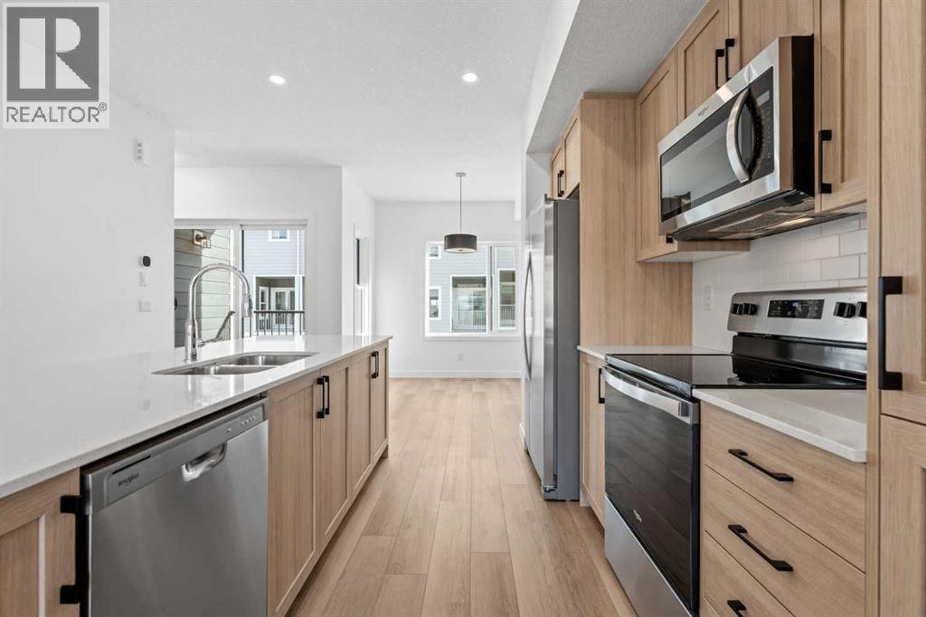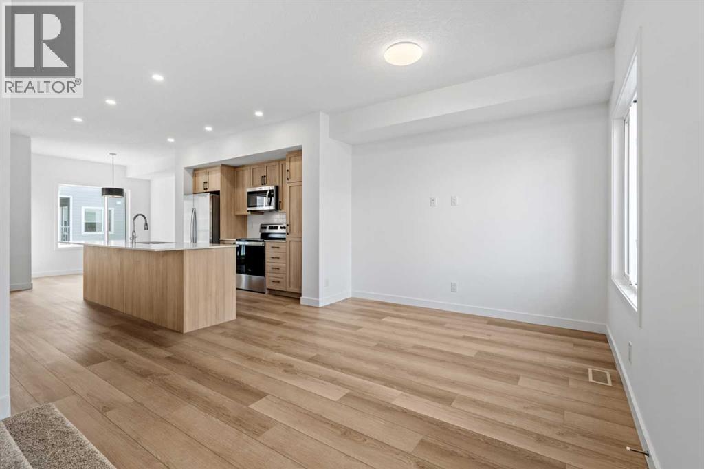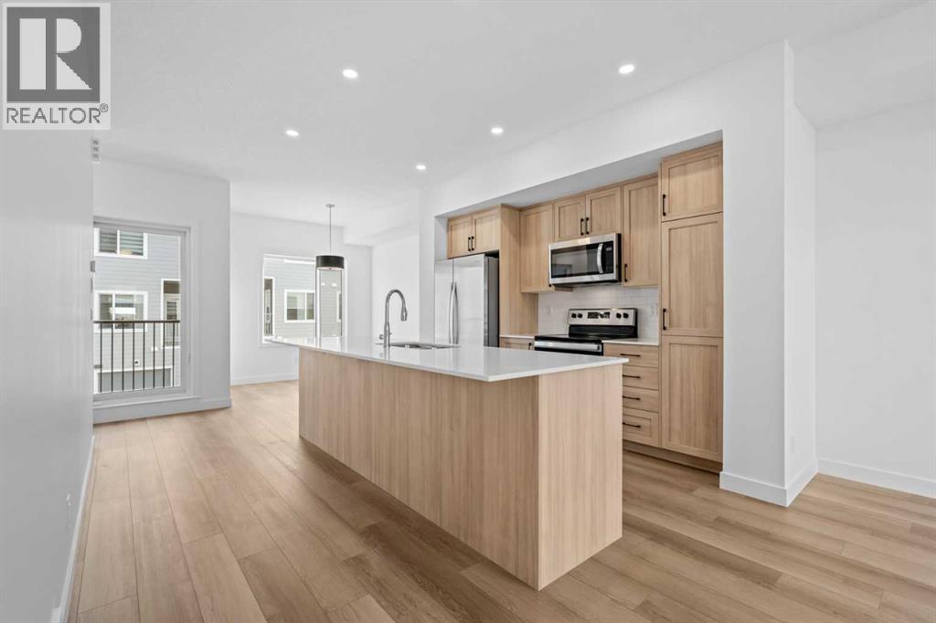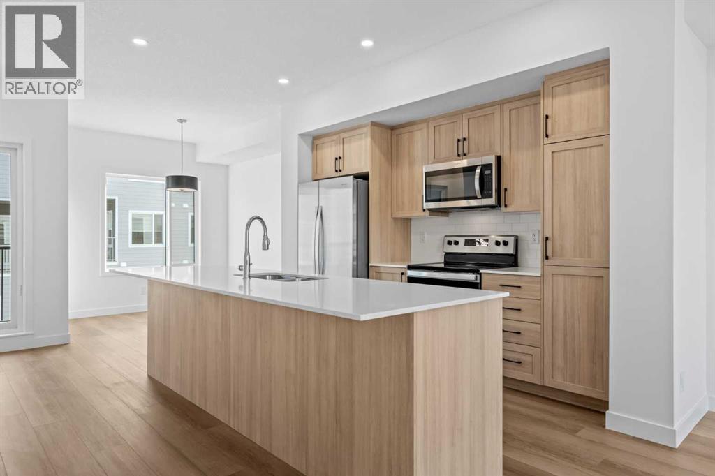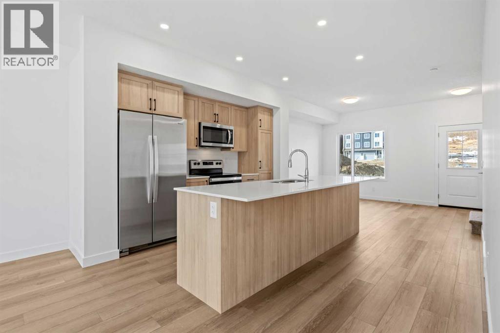 2 YEARS FREE CONDO FEES | NEW BUILD TOWNHOME | LOW CONDO FEES | 3 BED / 2.5 BATH / 1,198 SQ FT | SINGLE ATTACHED GARAGE + DRIVEWAY | IMMEDIATE POSSESSION – Welcome to the Larch 1 townhome by Minto Communities, an award-winning Canadian builder, located in Wildflower, proudly voted Best New Community in Canada. This vibrant, master-planned community in Airdrie is designed with lifestyle and connection in mind, offering a thoughtful mix of home styles in a neighbourhood built to grow with you.This brand-new townhome features a functional, modern layout ideal for today’s homeowner. The main floor offers a well-balanced design with the living room positioned at the front of the home just off the foyer, creating a welcoming and comfortable space to relax. The kitchen is centrally located and equipped with stainless steel appliances, a kitchen island, ample cabinetry, and storage, seamlessly connecting to the dining area at the rear. Just off the dining space, step out onto your private balcony—perfect for morning coffee or evening downtime.Upstairs, you’ll find a spacious primary bedroom complete with a walk-in closet and private 3-piece ensuite. Two additional bedrooms, a full 4-piece bathroom, and convenient upper-floor laundry complete this level, offering excellent functionality for families, guests, or a home office setup.The lower level includes a 2-piece bathroom, generous storage space, and direct access to the single attached garage. A full driveway provides additional parking, offering everyday convenience rarely found in townhome living.Residents of Wildflower enjoy exclusive access to The Hillside Hub, a standout amenity centre featuring Airdrie’s first outdoor pool, a hot tub, open-air sports court, and a variety of shared indoor and outdoor spaces designed for gathering, recreation, or quiet retreat. With nearby parks, pathways, amenities, and easy access to major routes, Wildflower delivers a truly well-rounded lifestyle.Combining award-winning commun ity planning, modern design, low condo fees, and immediate possession, this is an outstanding opportunity to own a stylish new build townhome in one of Canada’s most celebrated communities. Don’t miss your chance to make Wildflower home! Book your visit today! (id:63190)