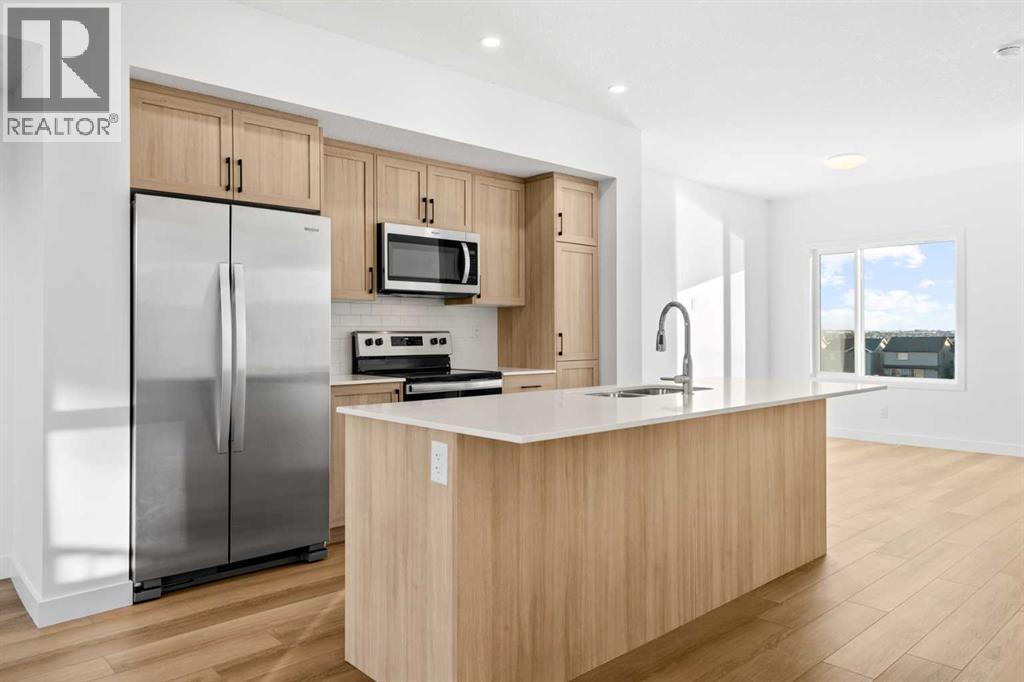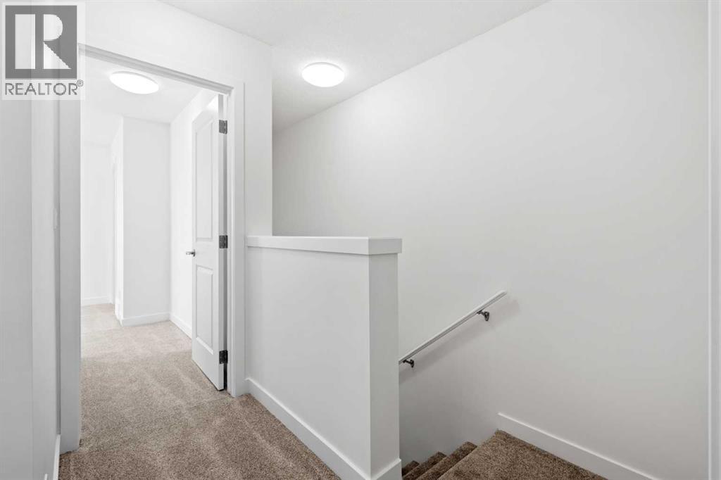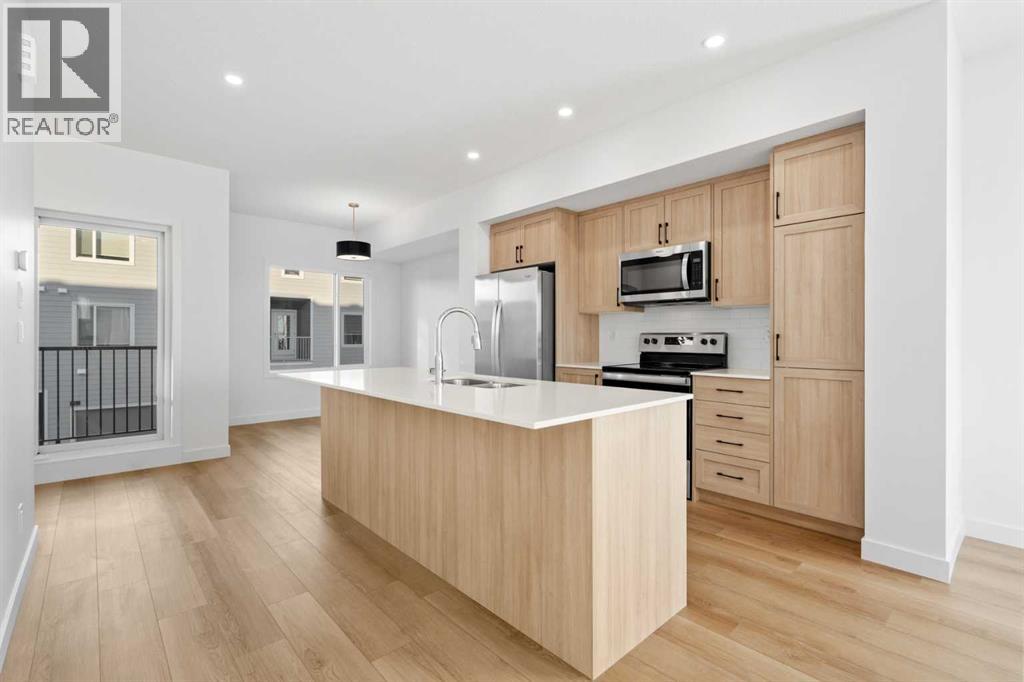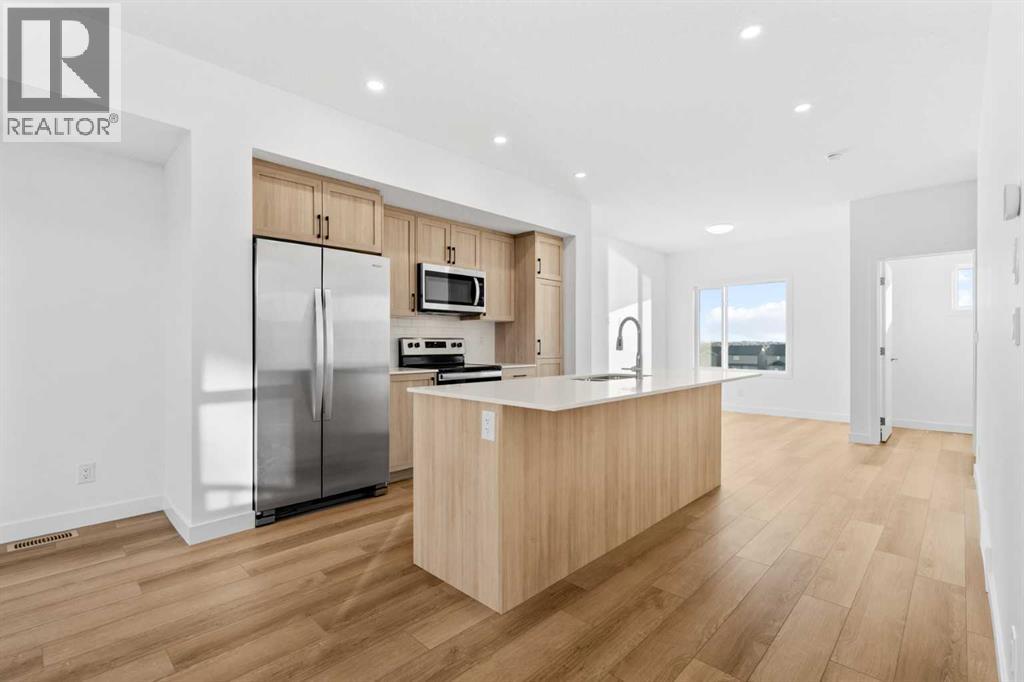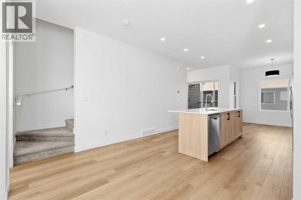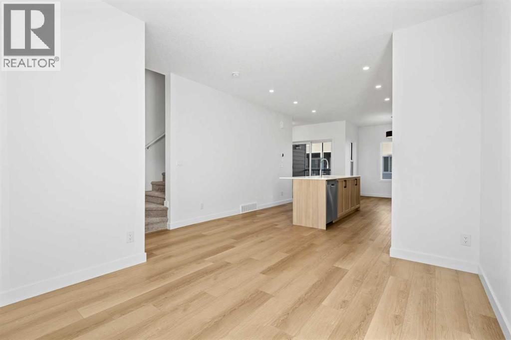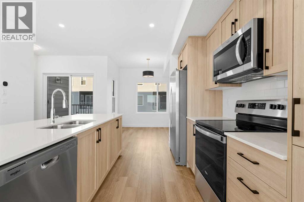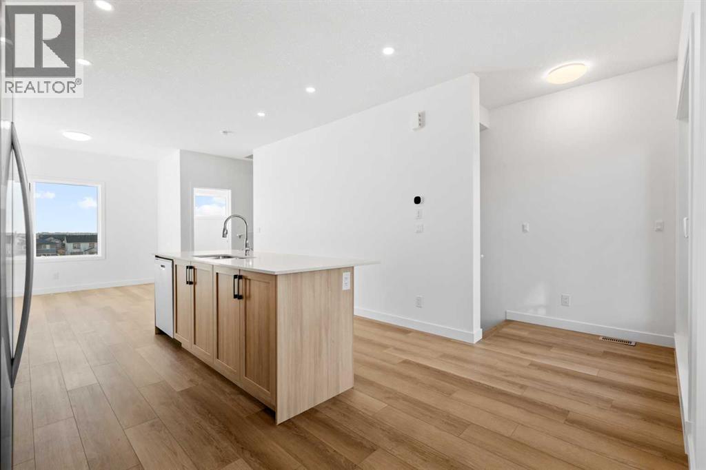 2 YEARS FREE CONDO FEES | NEW BUILD TOWNHOME | LOW CONDO FEES | 4 BED (3 UP, 1 DOWN) / 2.5 BATH / 1,462 SQ FT | OVERSIZED SINGLE ATTACHED GARAGE + DRIVEWAY | IMMEDIATE POSSESSION – Welcome to the Elm 2 townhome by Minto Communities, an award-winning Canadian builder, located in Wildflower, proudly voted Best New Community in Canada. This vibrant, master-planned community in Airdrie is designed with lifestyle and connection in mind, offering a thoughtful mix of home styles in a neighbourhood built to grow with you.This brand-new townhome features a functional and modern layout ideal for today’s homeowner. The main floor offers a well-designed living space at the front of the home, creating a welcoming area to relax or entertain. The kitchen is centrally located and showcases stainless steel appliances, a large island, modern finishes, ample cabinetry, and storage. The dining area is positioned at the rear of the home with direct access to a private balcony—perfect for morning coffee or unwinding at the end of the day. A convenient 2-piece bathroom completes this level.Upstairs, the spacious primary bedroom includes a walk-in closet and a private 3-piece ensuite. Two additional bedrooms, a full 4-piece bathroom, and conveniently tucked-away upper-floor laundry provide excellent functionality for families, guests, or home office needs.The lower level features a large foyer with direct access to the oversized single attached garage, along with a fourth bedroom—ideal for guests, a home office, or flex space. A full driveway adds valuable additional parking, offering everyday convenience rarely found in townhome living.Residents of Wildflower enjoy exclusive access to The Hillside Hub, a standout amenity centre featuring Airdrie’s first outdoor pool, a hot tub, open-air sports court, and a variety of shared indoor and outdoor spaces designed for gathering, recreation, or quiet retreat. With nearby parks, pathways, amenities, and easy access to major routes, Wildflower delivers a truly well-rounded lifestyle.Combining award-winning community planning, modern design, low condo fees, and immediate possession, this is an outstanding opportunity to own a stylish new build townhome in one of Canada’s most celebrated communities. Don’t miss your chance to make Wildflower home! Book your visit today! (id:63190)