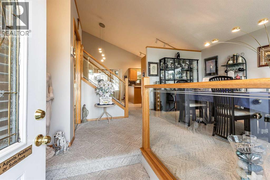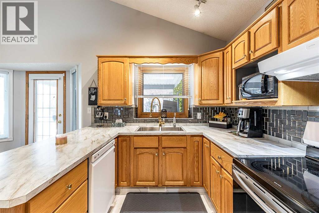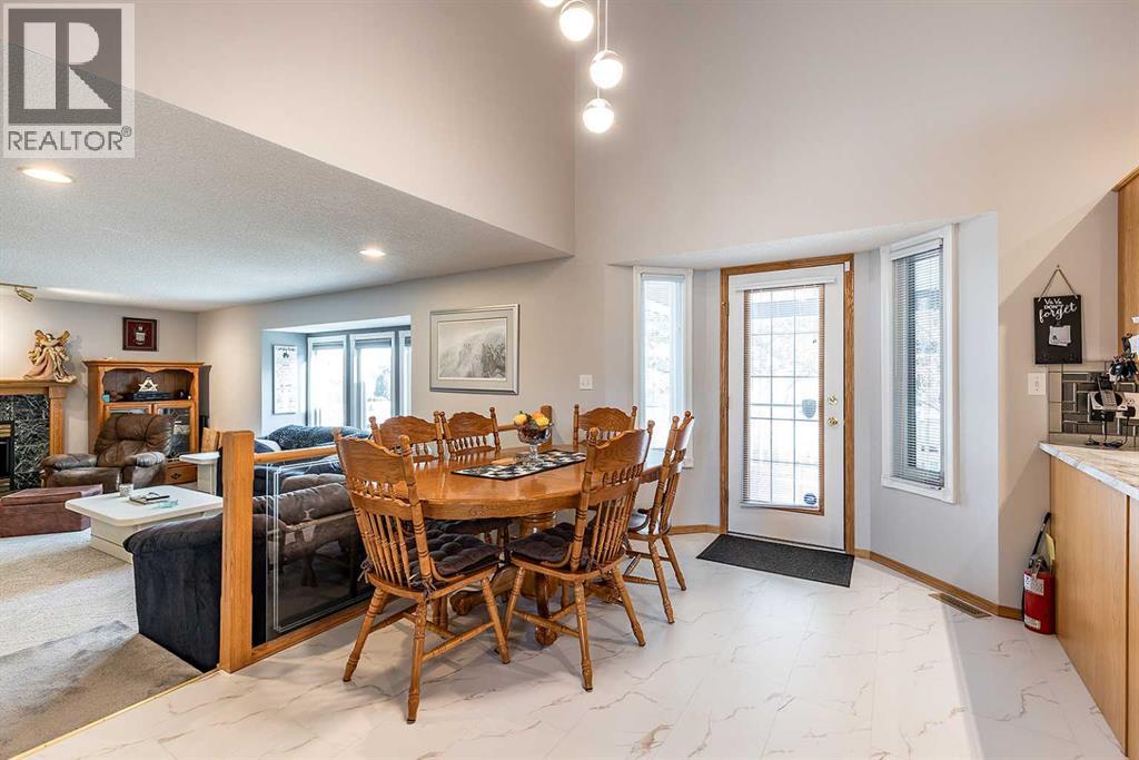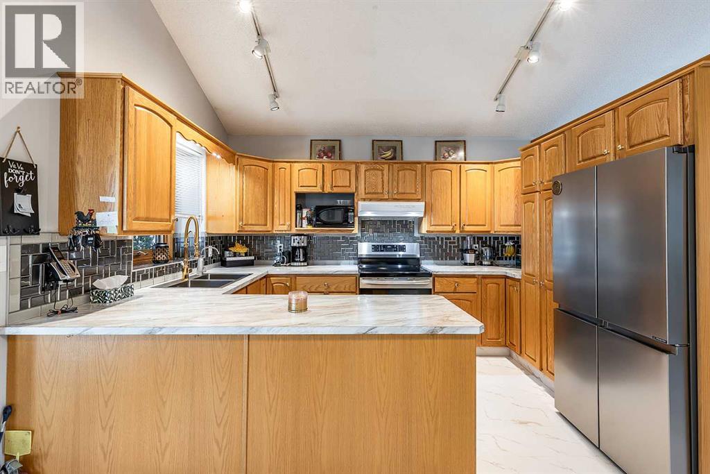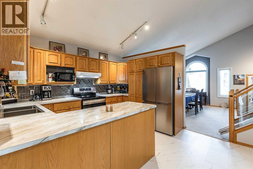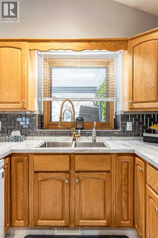 Located in the highly sought-after Parkview neighbourhood, just one minute from the Medicine Hat Golf & Country Club, this well-maintained two-storey split home offers space, flexibility, and a long list of updates. Featuring 3 bedrooms and 3.5 bathrooms, this property is ideal for families looking for a comfortable home in an established location. The main floor welcomes you with a front flex room currently used as a formal dining area, but easily suited for a living room, home office, or play space. The kitchen offers ample oak cabinetry, updated countertops and backsplash, newer stainless appliances (including fridge with ice maker), and a spacious dining area with direct access to the back deck and yard. From here, the layout flows into the large sunken living room, highlighted by a cozy gas fireplace. A convenient 2-piece powder room and main-floor laundry are located just off the attached double garage. Upstairs, you’ll find three bedrooms, including the primary suite featuring a walk-in closet and a private updated 3-piece ensuite with a newer air-jetted tub. A full updated 3-piece bathroom with a newer large spa-style shower completes the upper level. The lower level provides a generous family room, an updated 3-piece bathroom, and a huge storage room, offering plenty of space for recreation and organization. Outside, the fully fenced (Metal) and landscaped backyard is a standout feature. Enjoy the new, oversized two-tier covered deck, underground sprinklers, RV parking, and an abundance of mature fruit including plum and apple trees, raspberry and blueberry bushes. Two sheds ( 16' x 6' and 10' x 9.5') provide additional storage. Notable updates include a new roof (4–5 years), windows (6 years), A/C and furnace (6 years), hot water tank (2024), updated kitchen finishes and appliances, renovated bathrooms, and the new deck. A wonderful opportunity to own a move-in ready home in one of Medicine Hat’s most desirable neighbourhoods. Garage will be reverted back to a fully finished heated garage for possession. (id:63190)