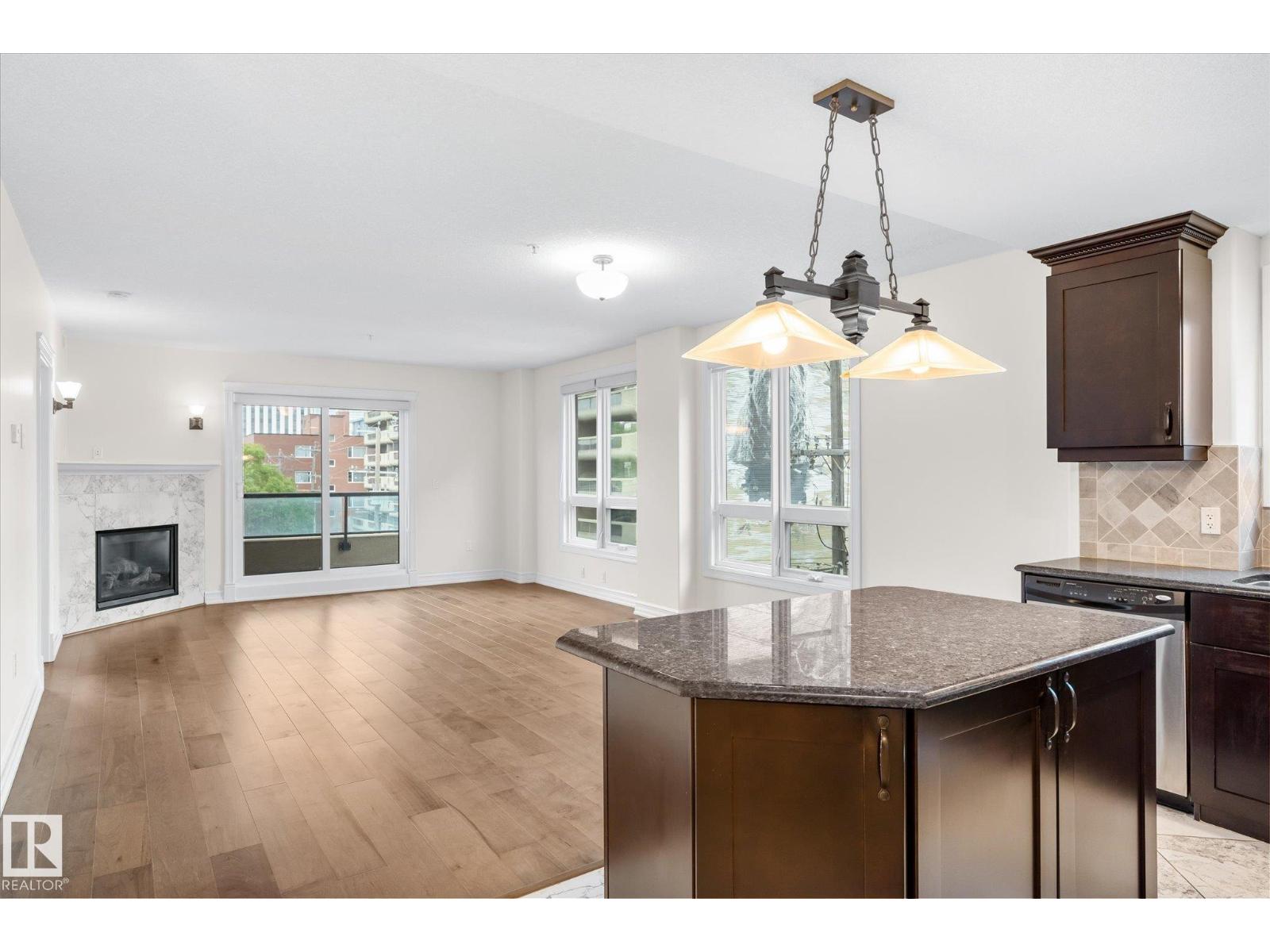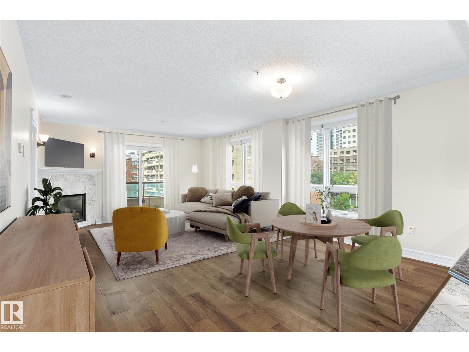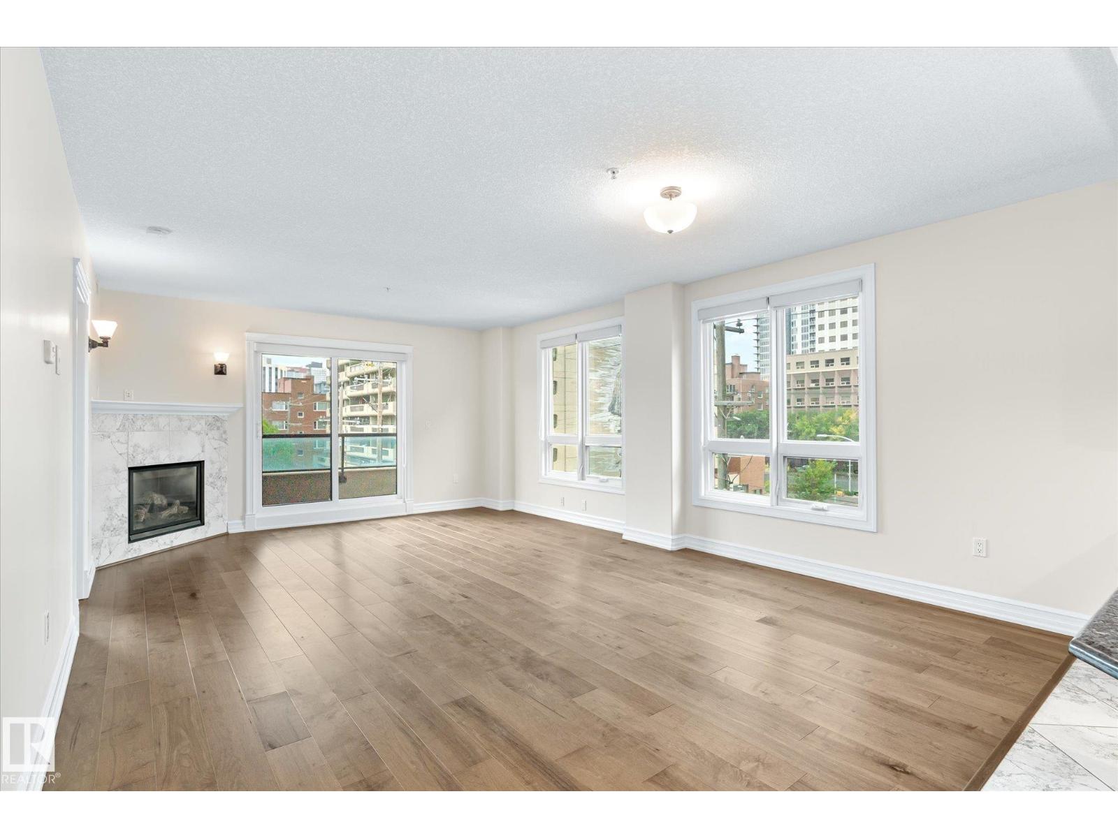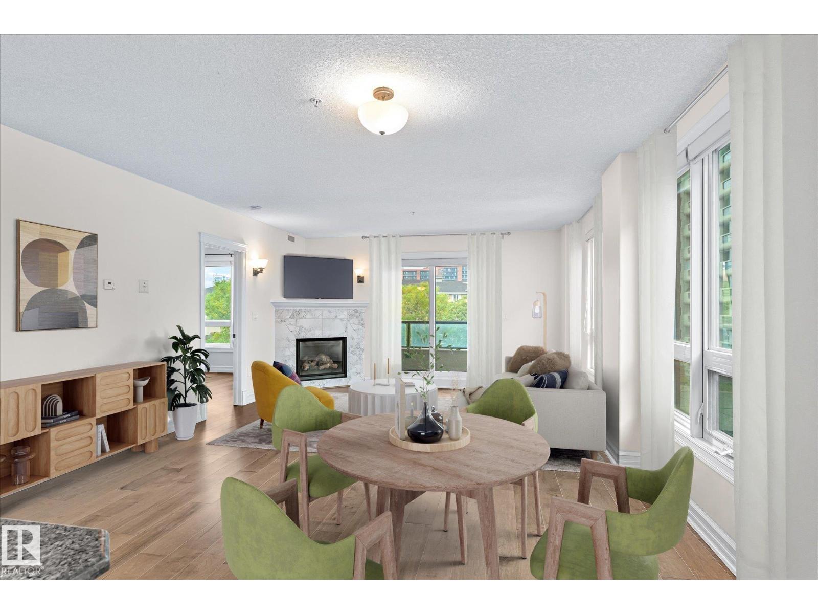 Experience refined urban living in this 3rd floor CORNER UNIT at the spectacular MERIDIAN PLAZA. Designed for entertaining, the open-concept layout showcases hardwood floors, 9' ceilings, a cozy gas fireplace, and an elegant living and dining area bathed in NATURAL LIGHT from south-facing windows & patio doors to the balcony. The well-appointed kitchen features granite countertops, stainless steel appliances, and a stylish breakfast bar. The primary suite offers a spa-inspired 5pc ensuite with dual vanities, soaker tub, glass shower, and a spacious walk-in closet. A second generous bedroom and full bath are privately situated on the opposite side of the suite. Additional highlights include in-suite laundry with storage, TITLED UNDERGOUND PARKING, and access to PREMIUM AMENITIES: a Mediterranean-style atrium, fitness centre, owners' lounge, event space with a full kitchen, & bike storage. Just one block to Jasper Ave and steps from restaurants, trails, shopping conveniences, & the Ice District. (id:63190)