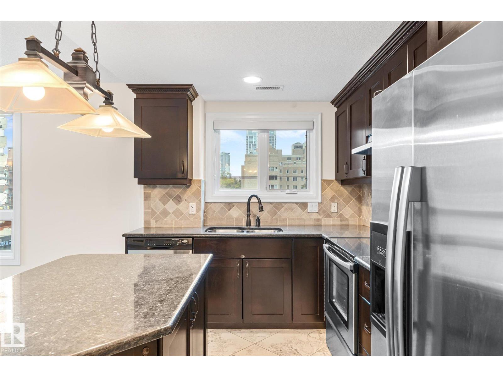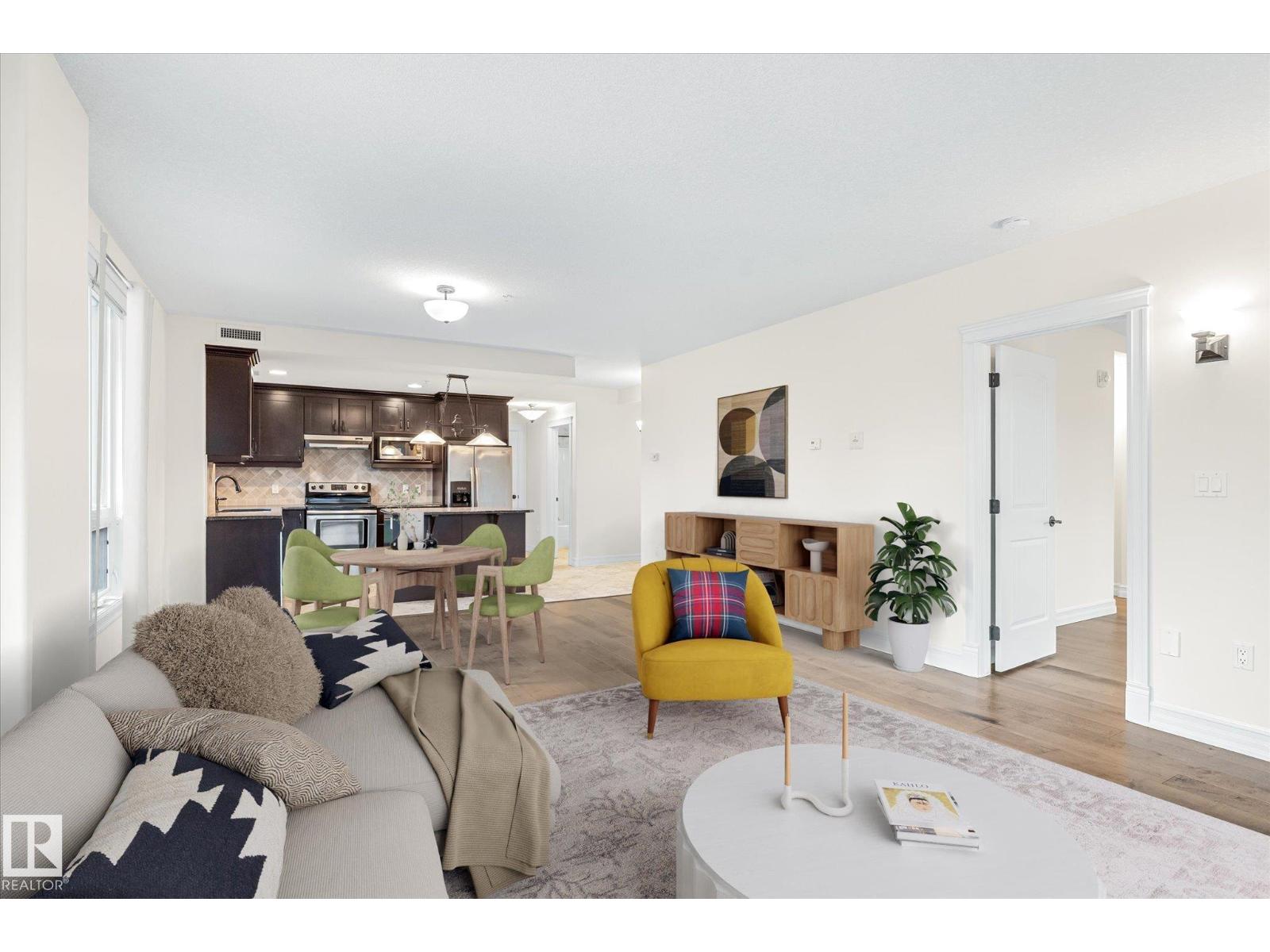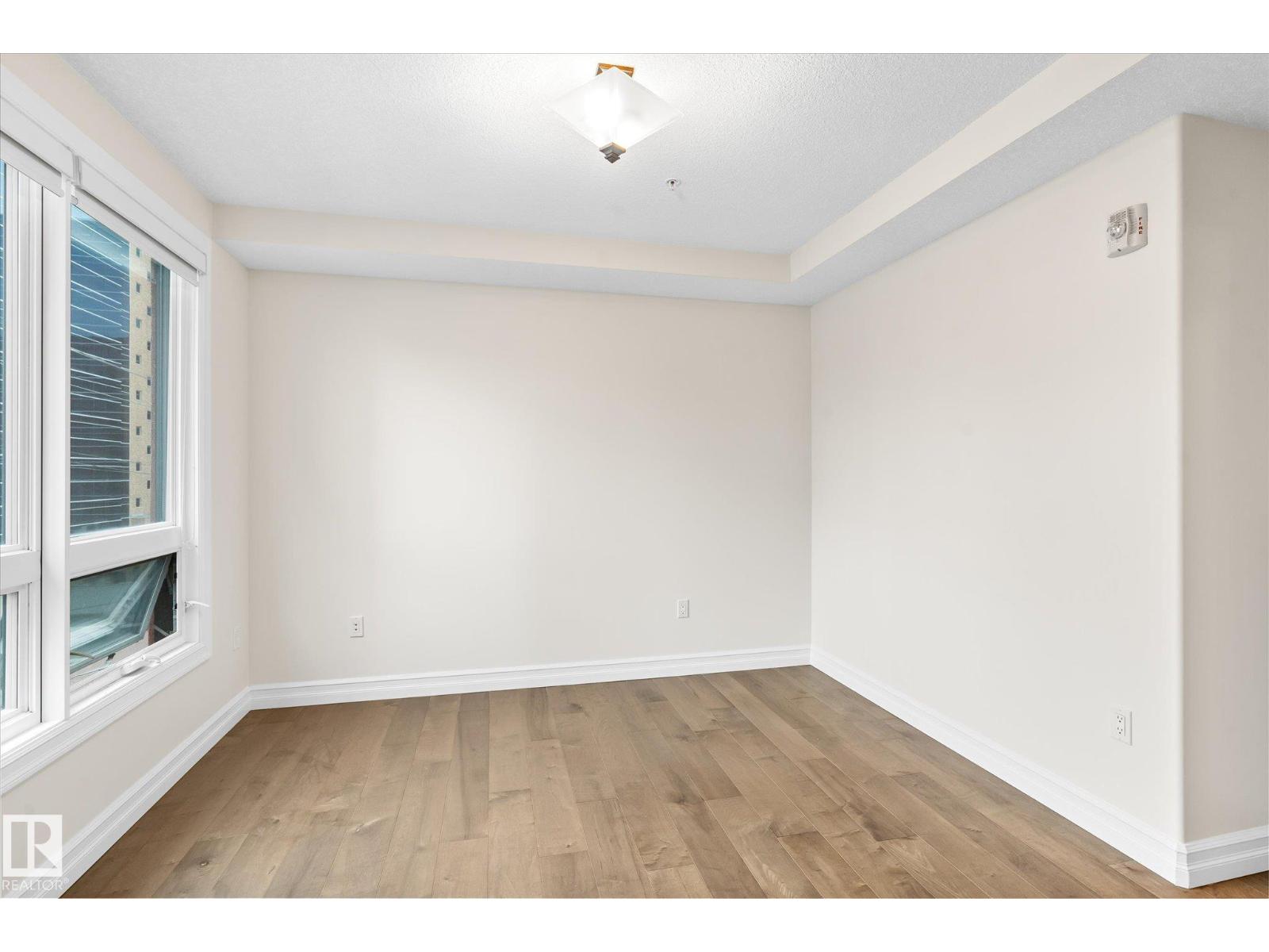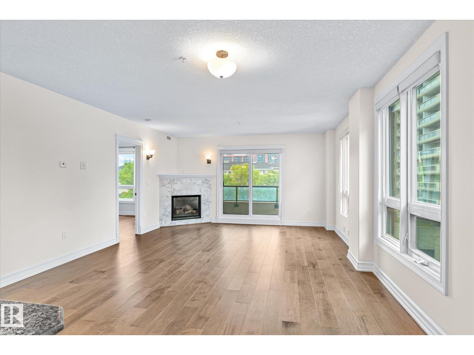 Experience refined urban living in this 3rd floor CORNER UNIT at the spectacular MERIDIAN PLAZA. Designed for entertaining, the open-concept layout showcases hardwood floors, 9' ceilings, a cozy gas fireplace, and an elegant living and dining area bathed in NATURAL LIGHT from south-facing windows & patio doors to the balcony. The well-appointed kitchen features granite countertops, stainless steel appliances, and a stylish breakfast bar. The primary suite offers a spa-inspired 5pc ensuite with dual vanities, soaker tub, glass shower, and a spacious walk-in closet. A second generous bedroom and full bath are privately situated on the opposite side of the suite. Additional highlights include in-suite laundry with storage, TITLED UNDERGOUND PARKING, and access to PREMIUM AMENITIES: a Mediterranean-style atrium, fitness centre, owners' lounge, event space with a full kitchen, & bike storage. Just one block to Jasper Ave and steps from restaurants, trails, shopping conveniences, & the Ice District. (id:63190)