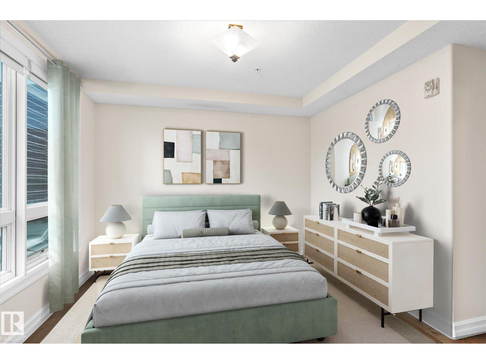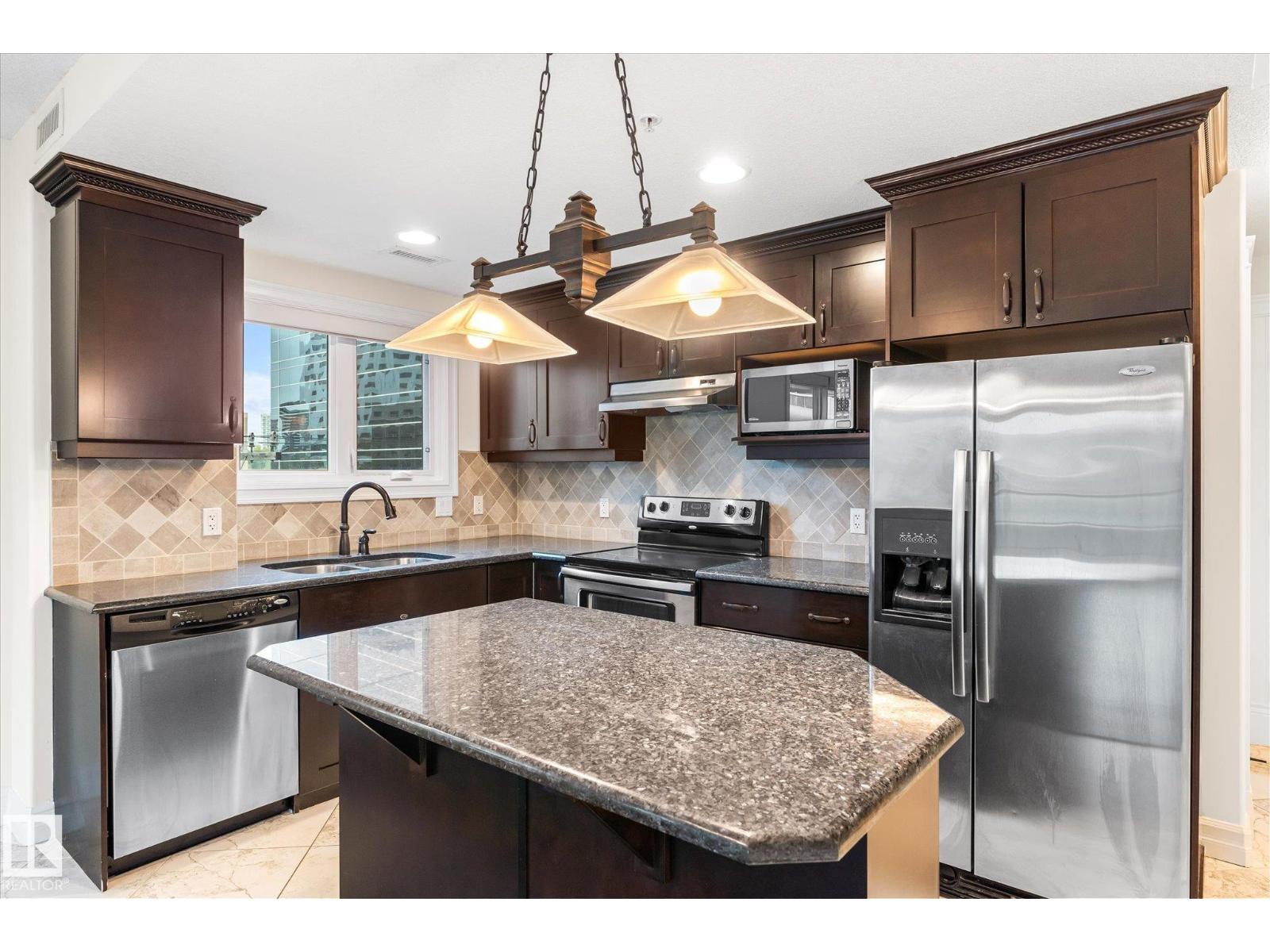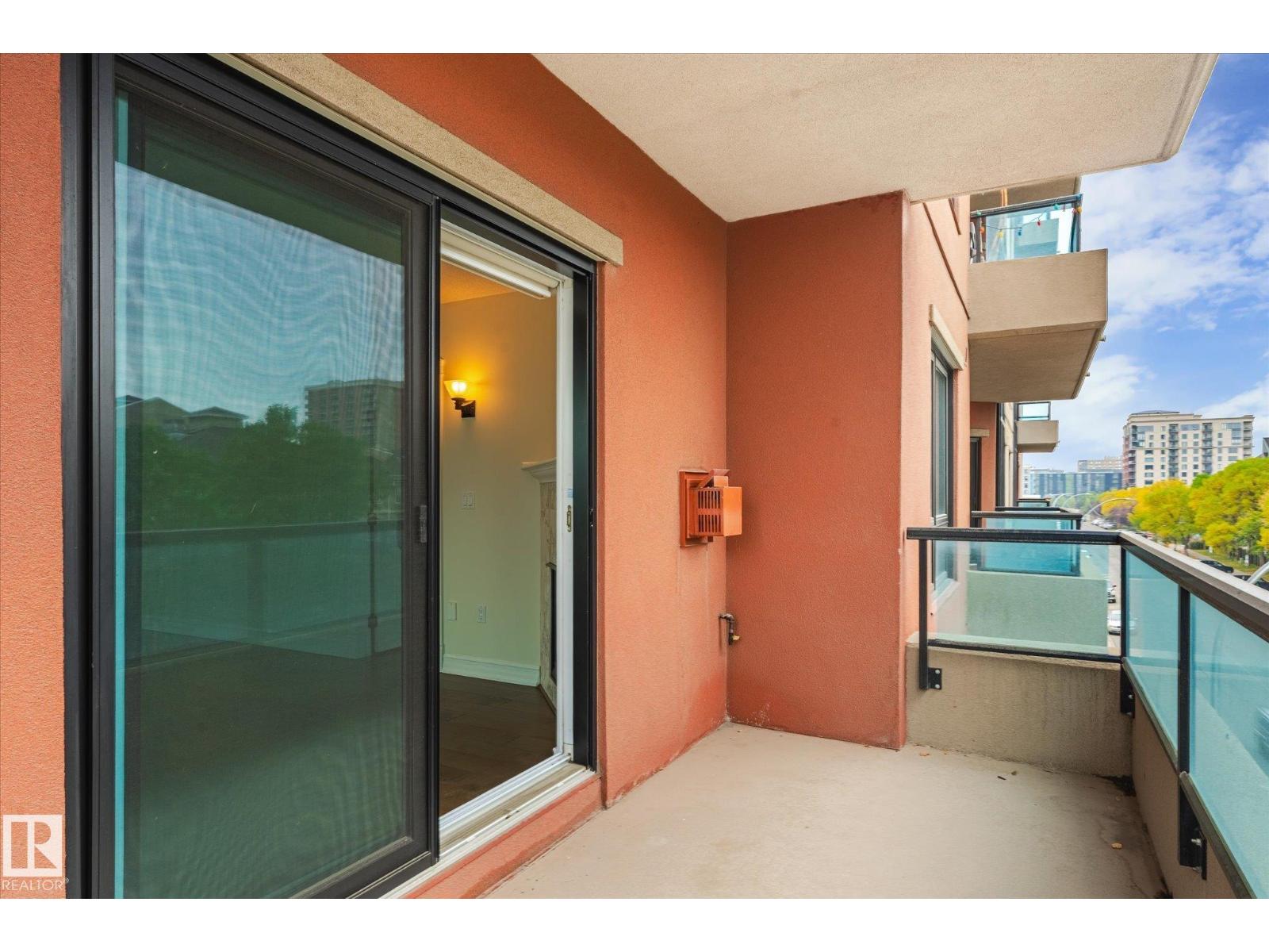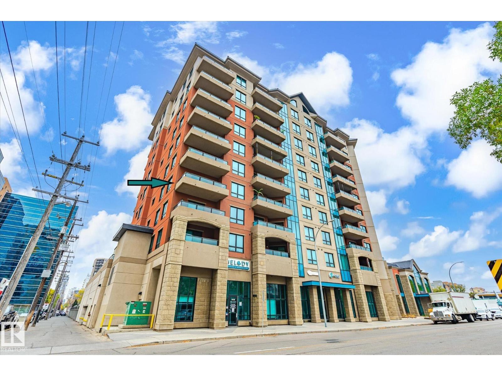 Experience refined urban living in this 3rd floor CORNER UNIT at the spectacular MERIDIAN PLAZA. Designed for entertaining, the open-concept layout showcases hardwood floors, 9' ceilings, a cozy gas fireplace, and an elegant living and dining area bathed in NATURAL LIGHT from south-facing windows & patio doors to the balcony. The well-appointed kitchen features granite countertops, stainless steel appliances, and a stylish breakfast bar. The primary suite offers a spa-inspired 5pc ensuite with dual vanities, soaker tub, glass shower, and a spacious walk-in closet. A second generous bedroom and full bath are privately situated on the opposite side of the suite. Additional highlights include in-suite laundry with storage, TITLED UNDERGOUND PARKING, and access to PREMIUM AMENITIES: a Mediterranean-style atrium, fitness centre, owners' lounge, event space with a full kitchen, & bike storage. Just one block to Jasper Ave and steps from restaurants, trails, shopping conveniences, & the Ice District. (id:63190)