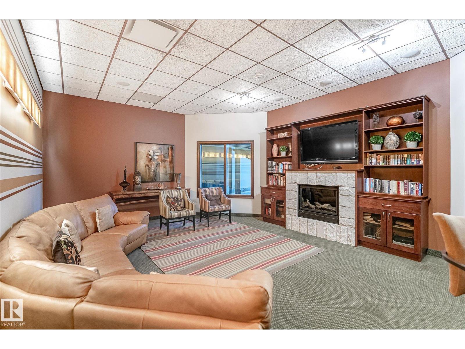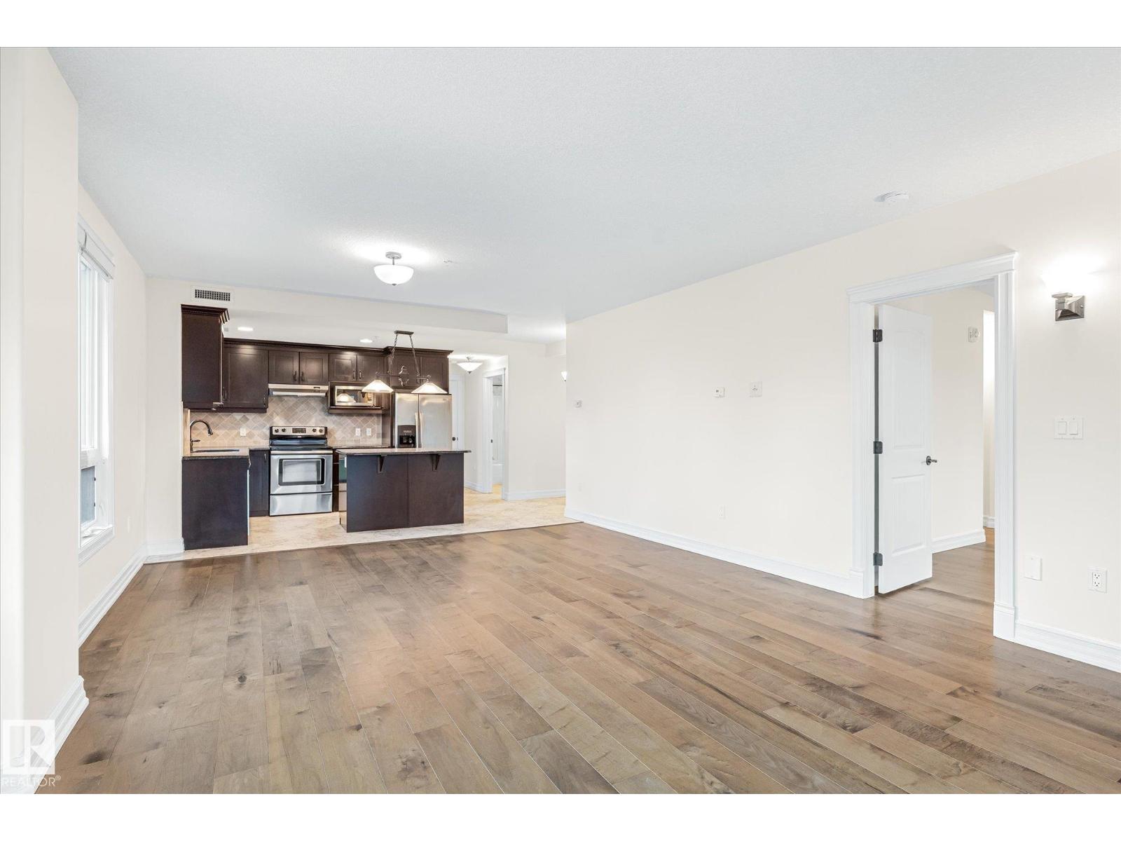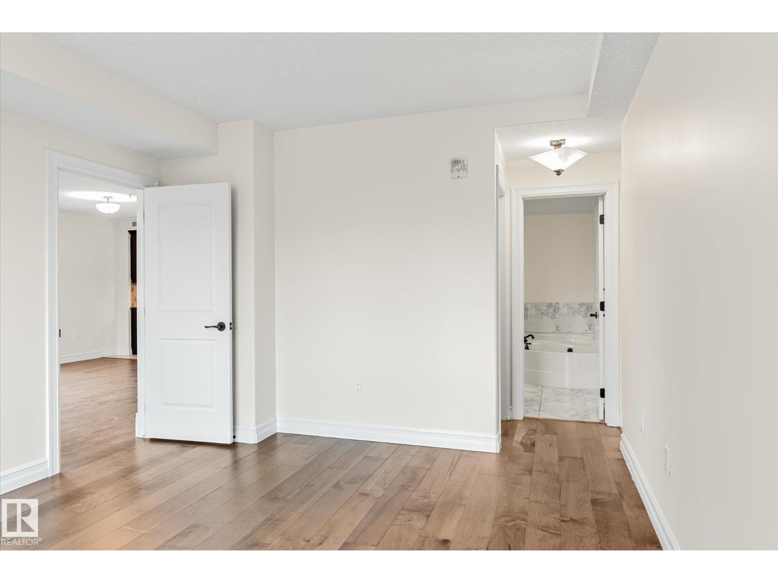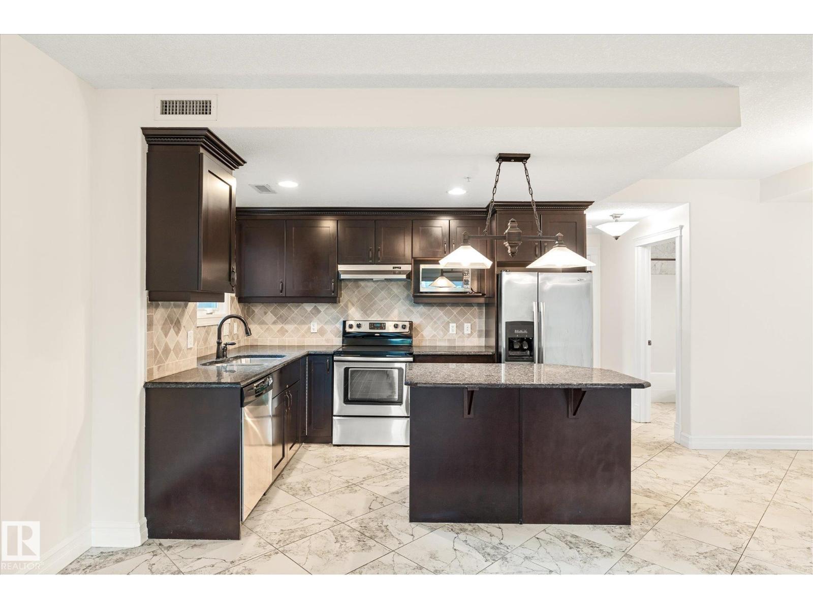 Experience refined urban living in this 3rd floor CORNER UNIT at the spectacular MERIDIAN PLAZA. Designed for entertaining, the open-concept layout showcases hardwood floors, 9' ceilings, a cozy gas fireplace, and an elegant living and dining area bathed in NATURAL LIGHT from south-facing windows & patio doors to the balcony. The well-appointed kitchen features granite countertops, stainless steel appliances, and a stylish breakfast bar. The primary suite offers a spa-inspired 5pc ensuite with dual vanities, soaker tub, glass shower, and a spacious walk-in closet. A second generous bedroom and full bath are privately situated on the opposite side of the suite. Additional highlights include in-suite laundry with storage, TITLED UNDERGOUND PARKING, and access to PREMIUM AMENITIES: a Mediterranean-style atrium, fitness centre, owners' lounge, event space with a full kitchen, & bike storage. Just one block to Jasper Ave and steps from restaurants, trails, shopping conveniences, & the Ice District. (id:63190)