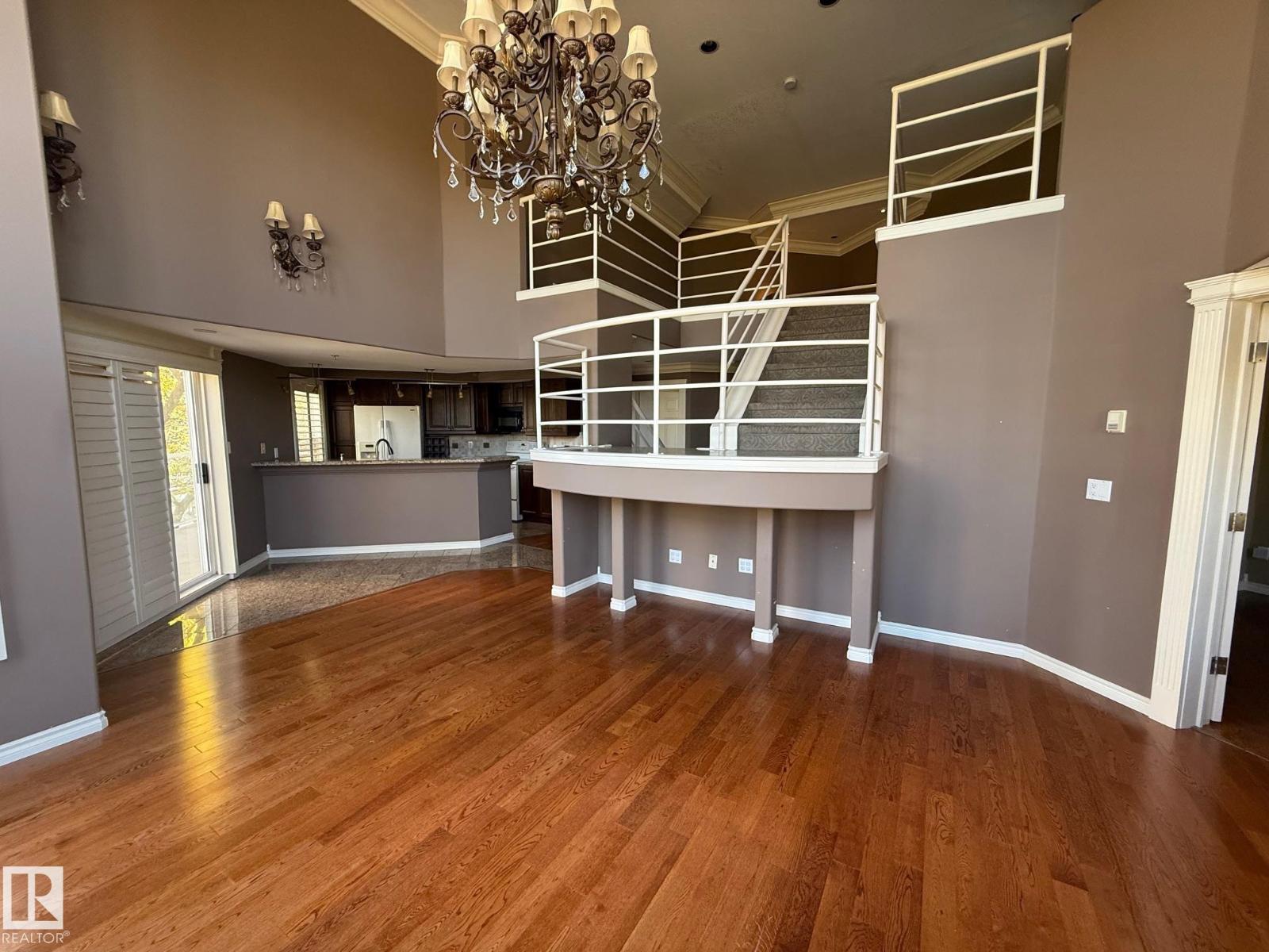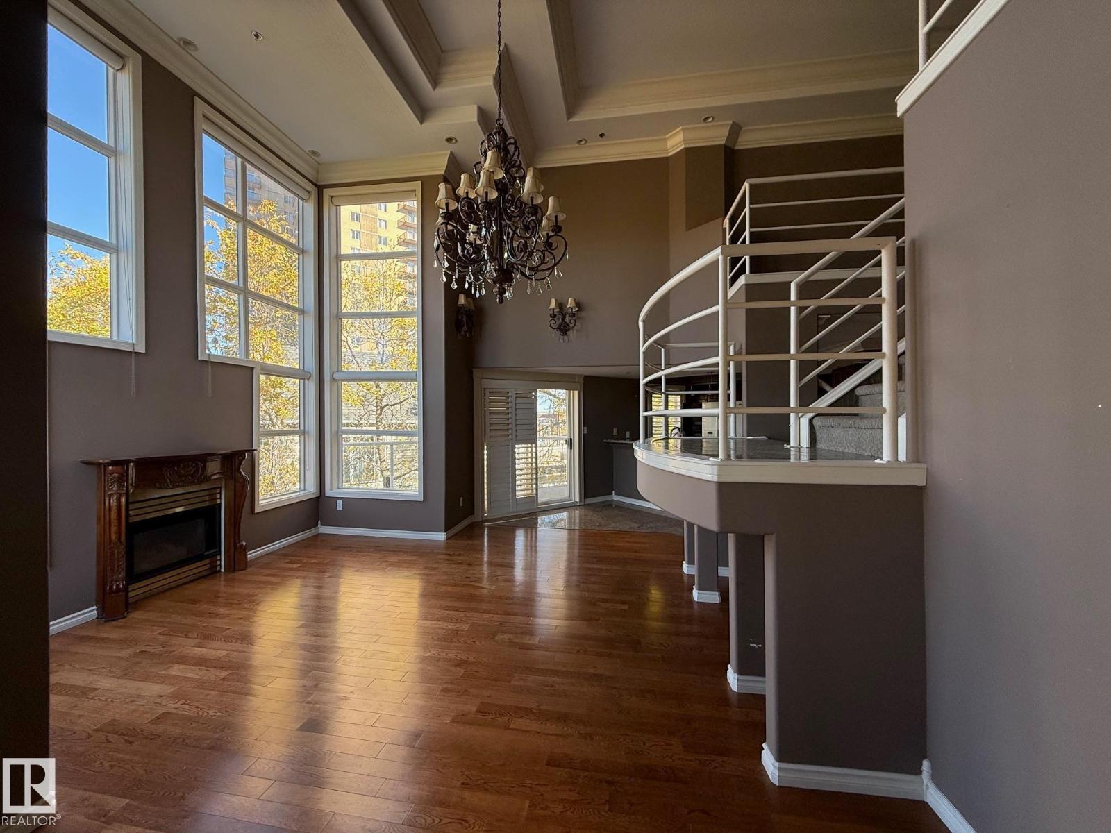 Top floor PENTHOUSE. Inside feature soaring 17' high ceilings with floor to ceiling windows in the living room with a cozy fireplace and west facing views. The kitchen has granite, farm sink, sit up island and lots of cabinets. Beautiful hardwood floors, crown mouldings, 3 piece bathroom with custome tiled shower on the main floor. Laundry closet, patio doors off the kitchen to a large deck. Main floor primary has a 3 piece ensuite featuring a big tub. Stairs lead to the bonus loft area with door leading to rooftop patio with aweome views. Underground heated parking and located on a beautiful tree lined street. (id:63190)