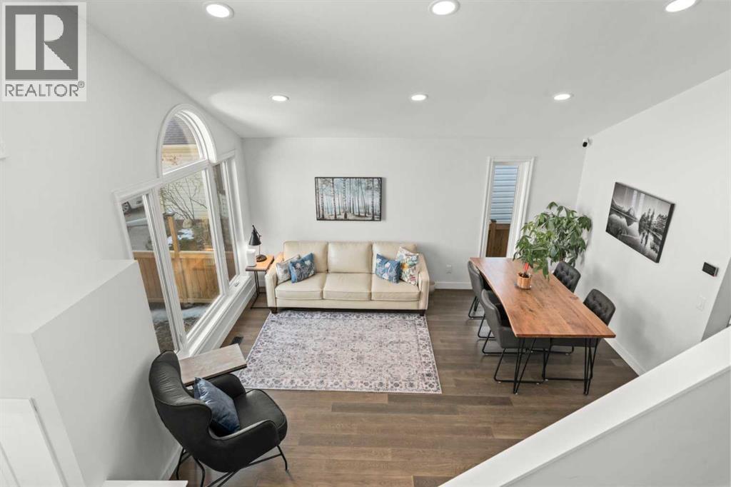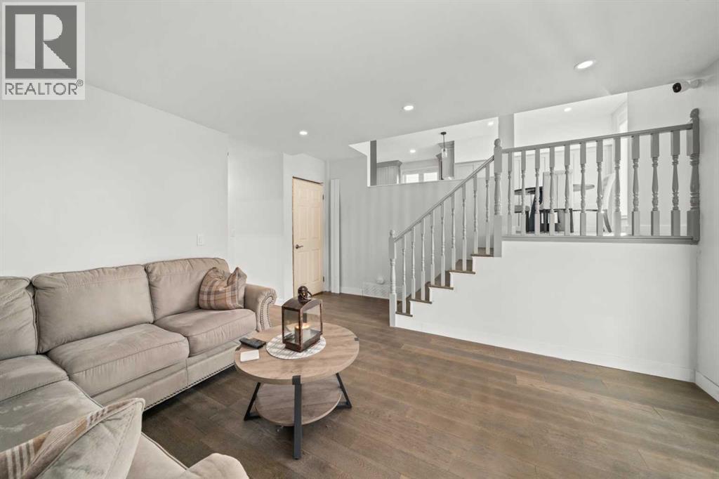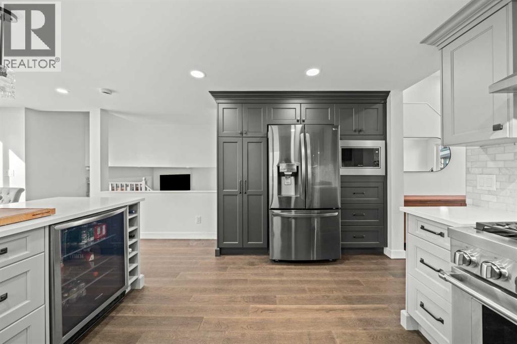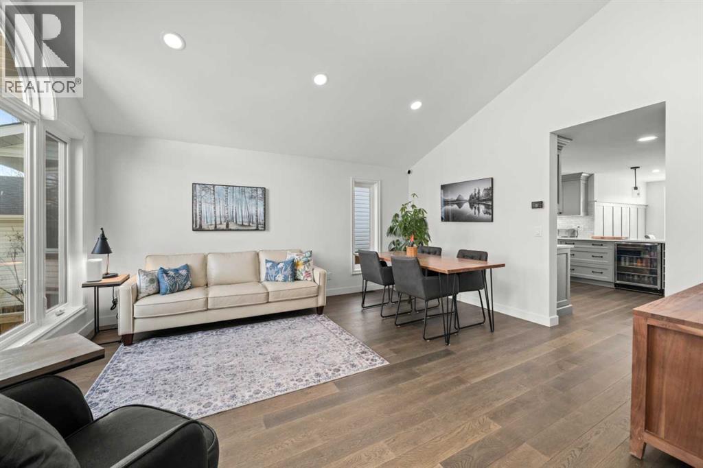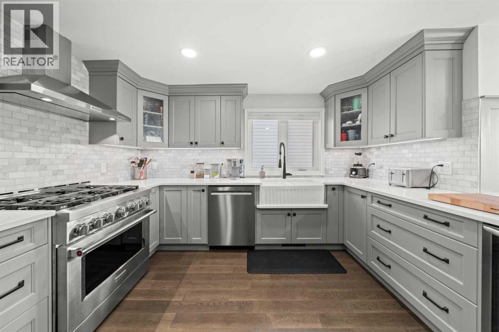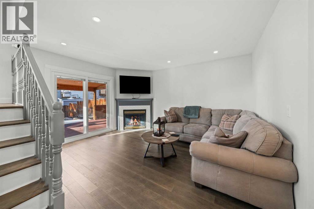 Welcome to this extensively upgraded home in a highly desirable location just steps from the Sheep River and its scenic walking paths, with schools, shopping, and parks nearby. Offering peace of mind and exceptional quality, this home has benefited from over $140,000 in recent renovations, including all-new wiring, PEX plumbing (no Poly B), triple-glazed windows, solid-core doors, new flooring, and updated trim throughout. The custom kitchen is the heart of the home, featuring a $45,000 upgrade with quartz countertops, farmhouse sink, soft-close cabinetry, pull-out pantry drawers, built-in microwave, beverage fridge, and a smart KitchenAid 6-burner gas range with designer hood fan. Under-cabinet lighting, pot lights, flat ceilings, and a breakfast bar create a bright, functional space that flows into a sunny nook. The family/dining room showcases vaulted ceilings, engineered hardwood flooring, and abundant natural light. The walkout living room offers a cozy gas fireplace and access to outdoor living. Enjoy a huge covered deck and generous west facing yard with planter boxes, Saskatoon bushes, and raspberries—ideal for relaxing or entertaining. This level also includes a tiled laundry room with half bath (front-load washer and dryer included) and a mudroom with built-in lockers. Upstairs, the primary suite features a walk-in closet with custom built-ins and a spa-inspired ensuite with heated tile floors, curbless oversized shower, rain head plus dual shower heads, and black accents. Two additional bedrooms feature wainscoting, including one with a window seat, along with a 4-piece bathroom with LVP flooring and quartz countertops. The fully developed lower level offers a spacious games/family room. Additional features include hardwood stairs, all-new blinds, high-efficiency furnace, tankless hot water system, crawl-space storage, camera system, and oversized single garage with side man door. A beautifully updated home offering exceptional location and lifestyle. Vie w Multi Media/3D/Virtual Tour. (id:63190)