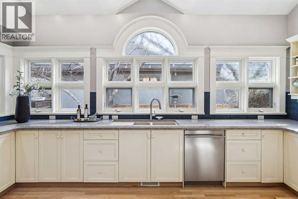 Perfectly positioned in the heart of Elbow Park just steps from the Glencoe Club, this distinguished Queen Anne–style residence offers a rare opportunity to plant roots in one of Calgary’s most cherished family neighbourhoods. Set on an exceptional oversized lot with coveted 75’ frontage and a sun-drenched west-facing backyard, this is a home where children can walk to social activities, swimming, skating, or tennis lessons at the Club. This is a home for generations to gather for the holidays, celebrations, and everyday living. Rich in warmth and architectural authenticity, the home was masterfully built in 1993 to reflect and respect the historic charm of Elbow Park, showcasing timeless design through its classic center hall plan, gabled rooflines, wrap-around veranda, and signature hexagonal tower feature. Inside you’ll find extensive wainscotting, crown moulding, decorative tile-work, and elegant 9’ ceilings. The main floor unfolds beautifully for both entertaining and daily life, with a living room anchored by a wood-burning fireplace and charming bay window, and a gracious dining room across the entry. The kitchen presents remarkable opportunity with its stunning wall of south-facing arched windows, premium Wolf double oven range, Sub-Zero refrigerator, and generous cabinetry, all offering exceptional space and flow for future personalization. A sun-filled breakfast nook wrapped in windows within the tower opens to a cozy family room with built-in bookcases and brick fireplace, creating a natural gathering space. A generous, quiet office with clerestory window, a powder room, and practical mudroom complete the level. Upstairs, a flexible lounge or homework area supports busy family life, while the expansive primary retreat offers a private sanctuary with a fireplace, dual walk-in closets, and a breathtaking turret sitting area with south and west views beneath a vaulted hexagonal ceiling. Three additional spacious bedrooms, full bath, and upper laundry room en hance functionality for growing families. The fully developed lower level adds approximately 1,535 square feet of versatile living space including a recreation area, media room and built in cabinets and bookcases. A fifth bedroom is an ideal room for guests, teens, or live-in support, and the bathroom has a secondary laundry. With refinished hardwood floors, new carpeting, and Poly-B plumbing already removed, this home offers the rare advantage of being move-in ready while allowing thoughtful updates over time, a far easier and faster process than building new in this premier location. Surrounded by mature trees and exceptional outdoor living spaces including a large south patio with fire-pit, lawn, side driveway, and a heated triple detached garage, this is a legacy property where lifestyle, community, and opportunity come together beautifully. (id:63190)