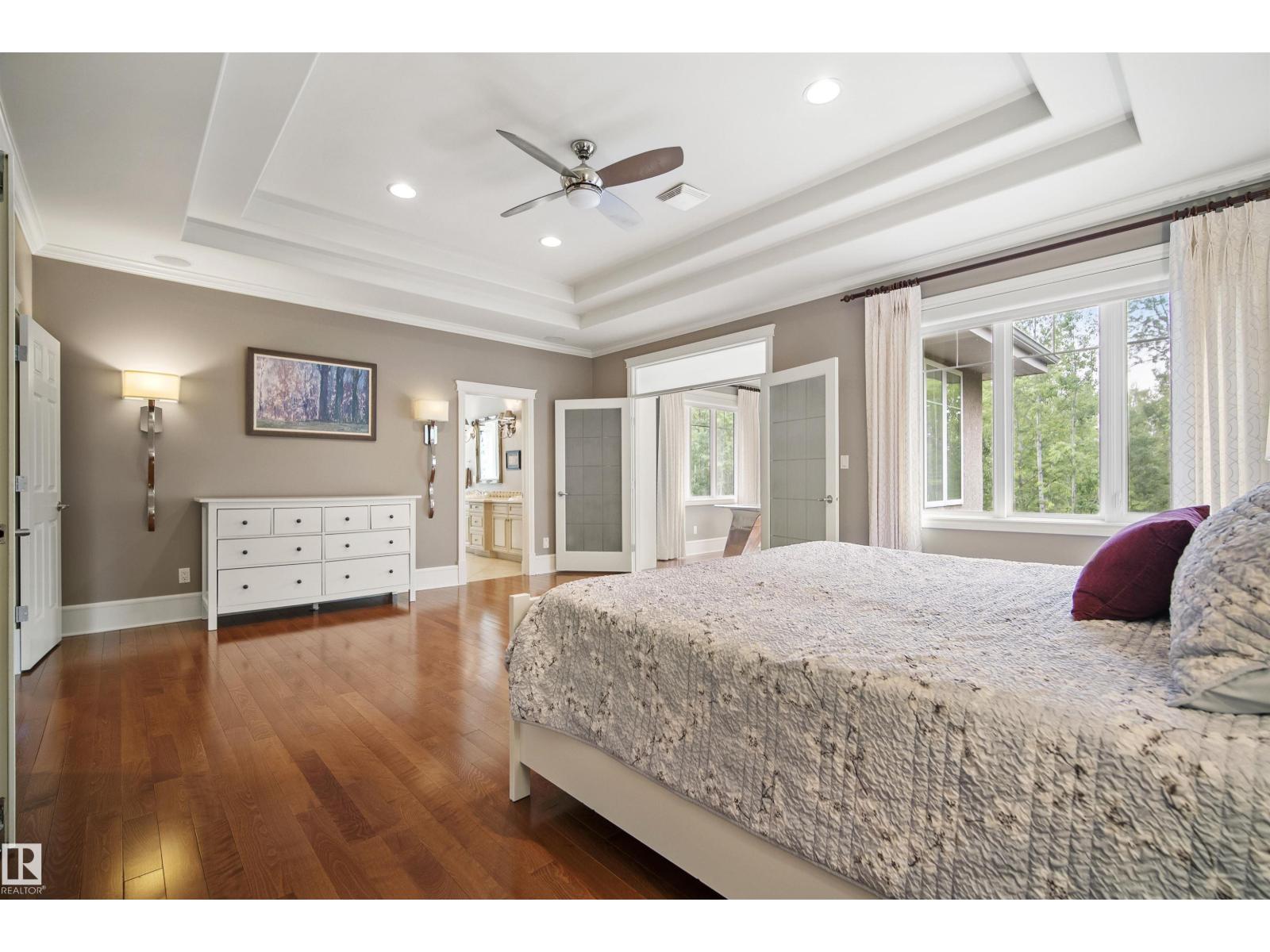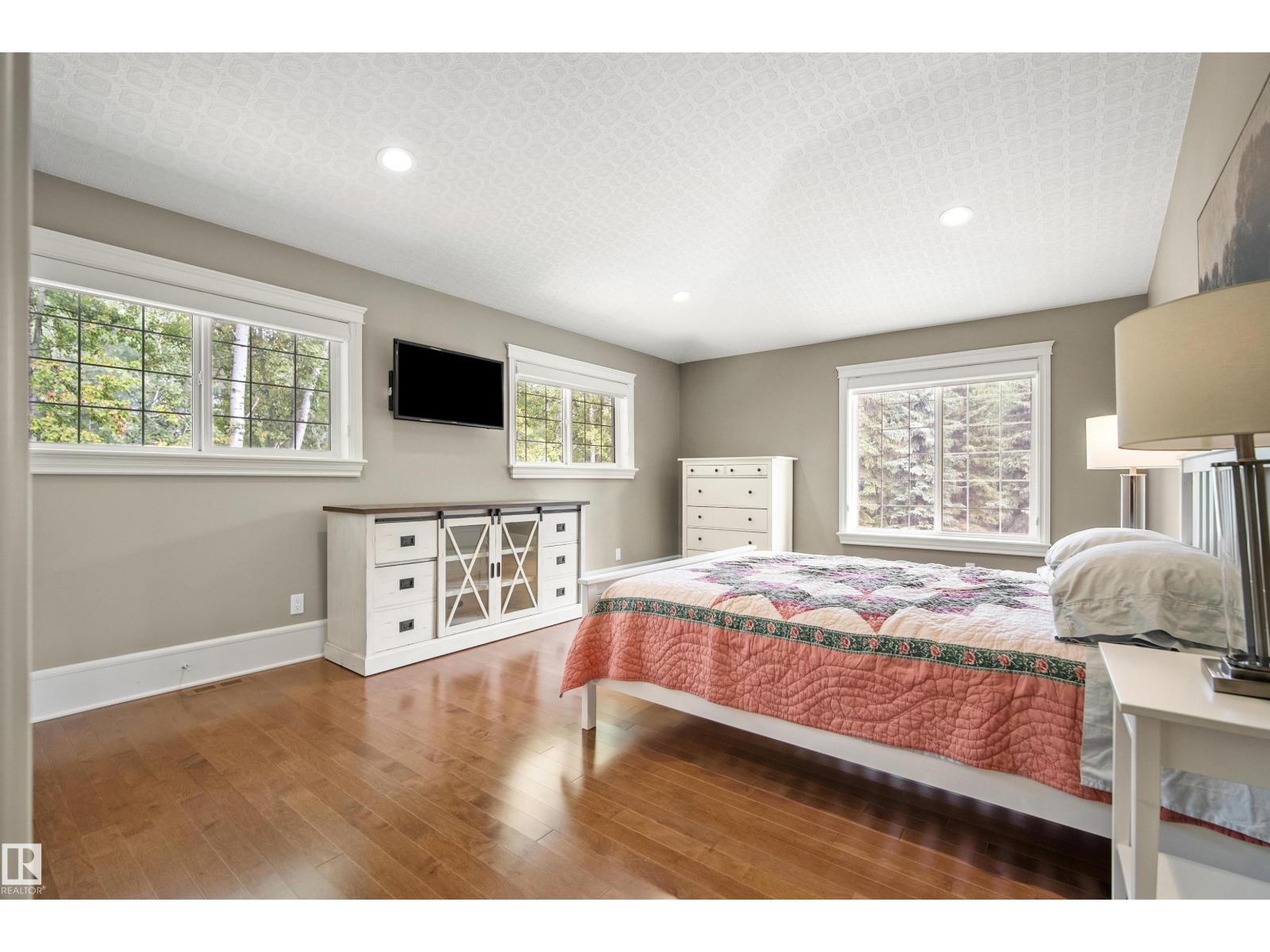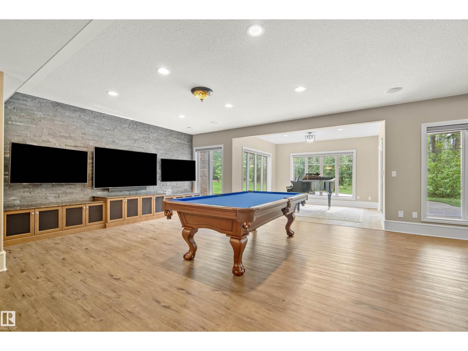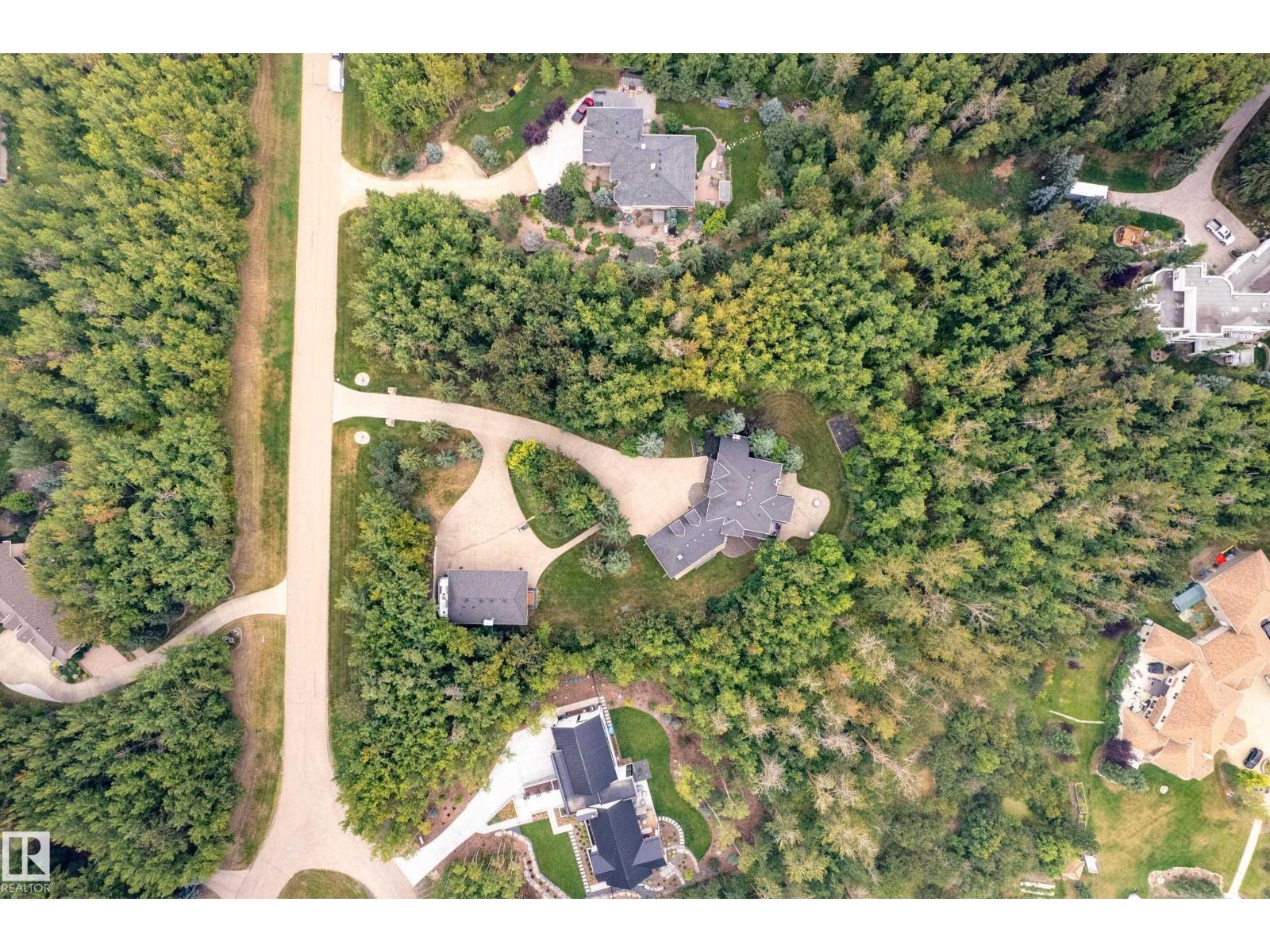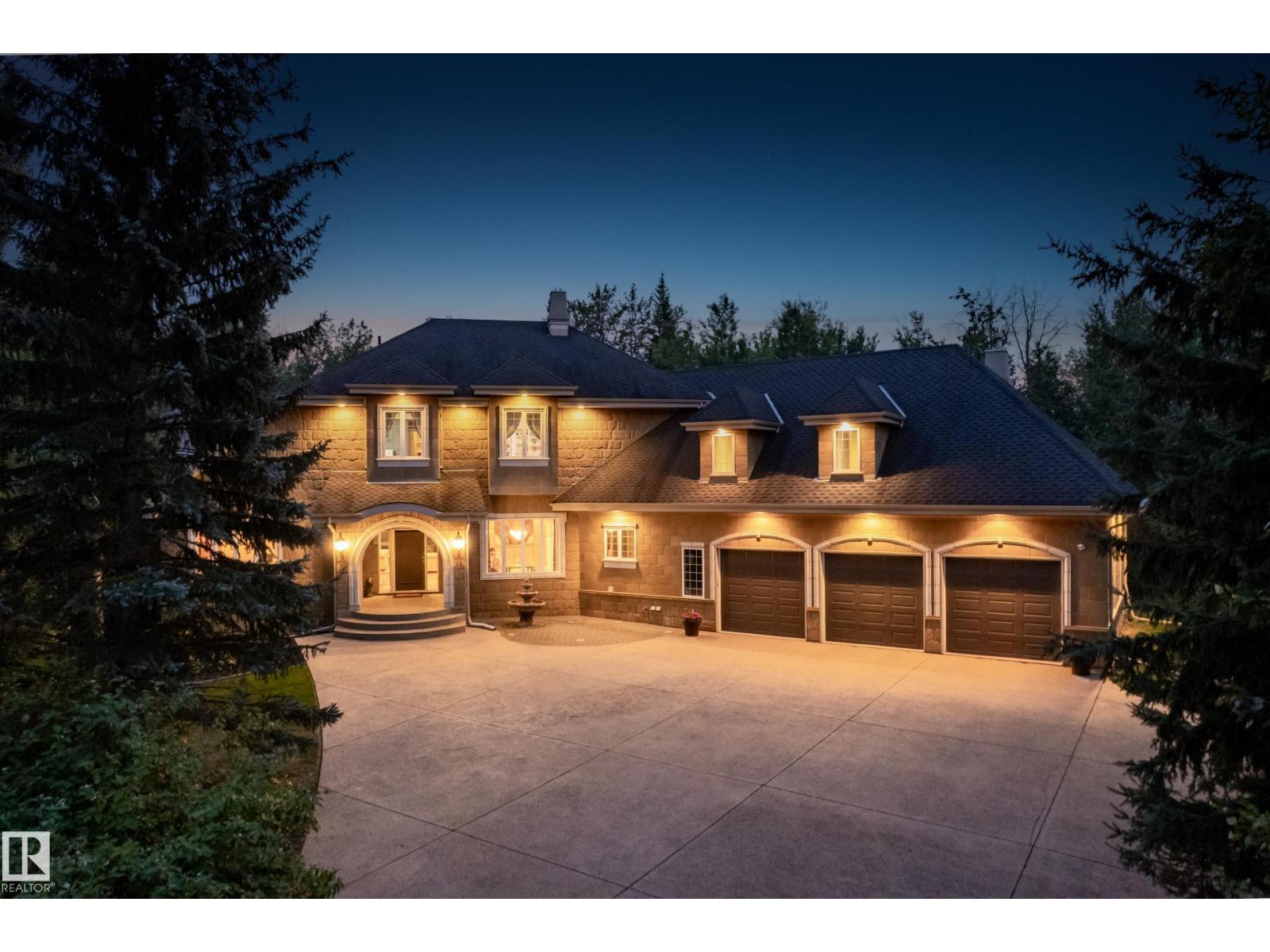 Welcome to this exceptional family estate where timeless design meets everyday luxury. Tucked away on 2 private acres in a quiet cul-de-sac, this home is a short walk to SWP Natural Area & Deermound Dog Park (via neighbourhood pathway). Offering 5860+ sf of beautifully finished living space across 3 levels, this home blends elegance & functionality. The upper level features 4 generous bedrooms, each with its own ensuite. The main floor impresses with two wood-burning fireplaces and a chef-inspired kitchen. The walkout basement is built for entertaining with a full bar, rec room, theatre, & gym. There is a complementary 1400+ sf detached carriage suite. Thoughtful extras include AC, in-floor heat, laundry chute, central vac, built-in speakers, cold storage, gas BBQ hookups, RV parking (30-amp), aggregate driveway, epoxy garage floors, dog wash, dog run, & playhouse. 2 triple garages (5 vehicles + workshop). City water. Just minutes to SWP and EDM, this is refined acreage living in Waterton Estates. (id:63190)