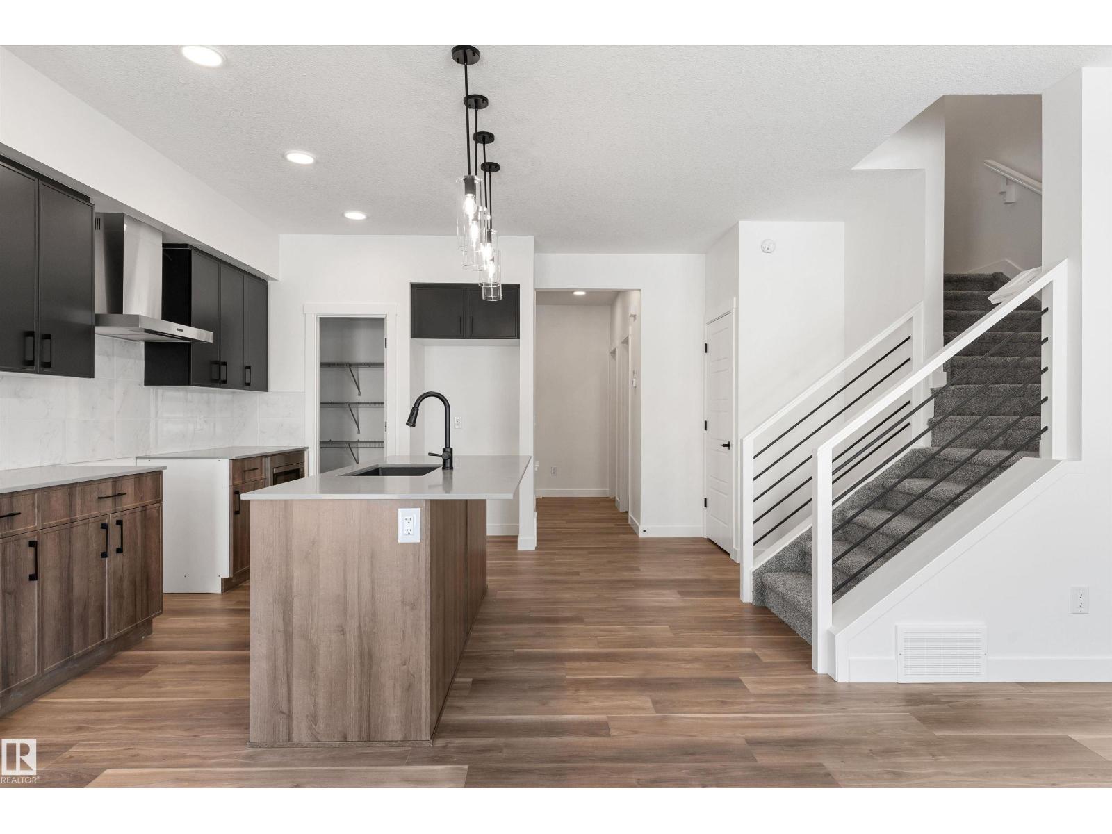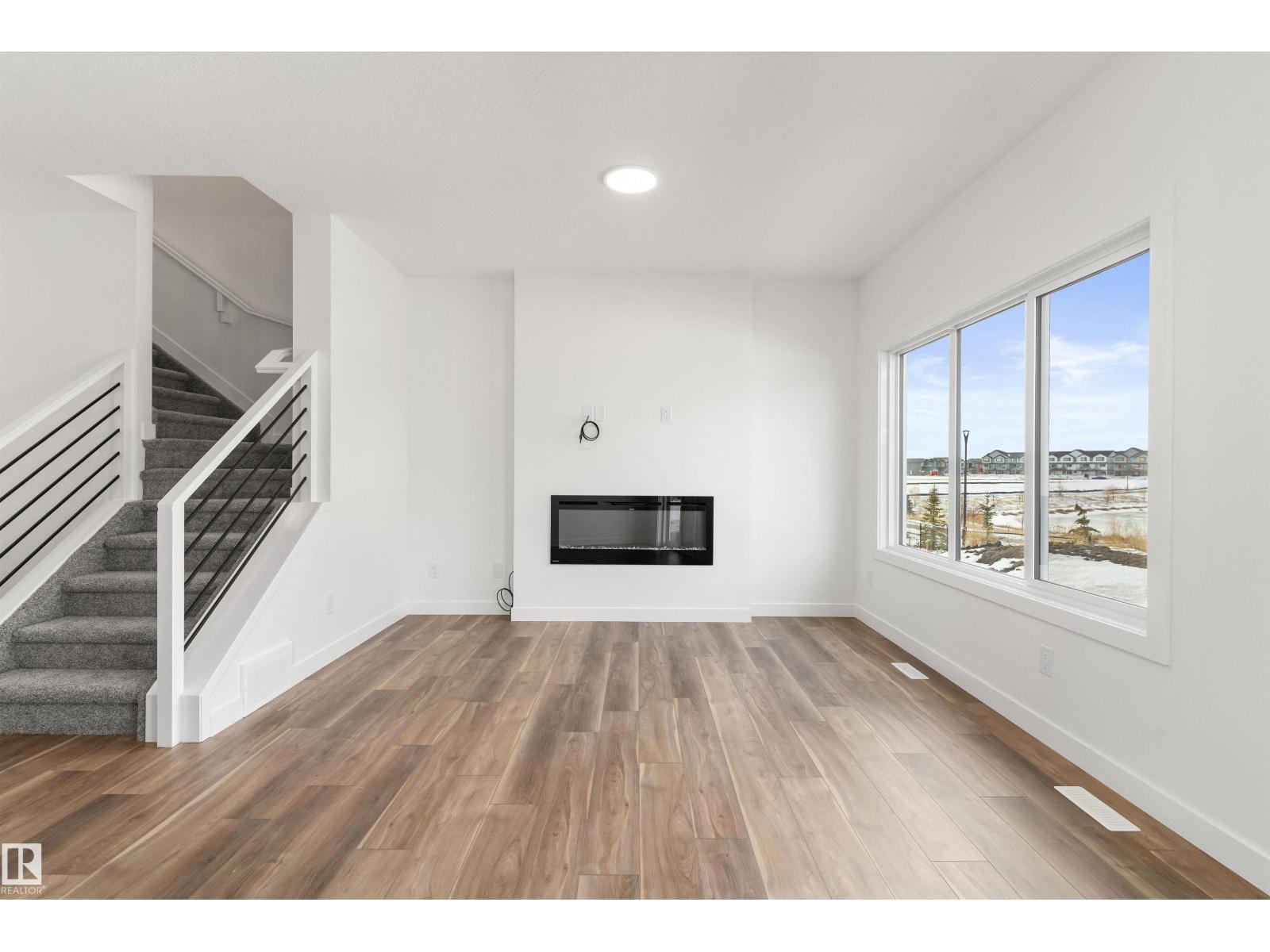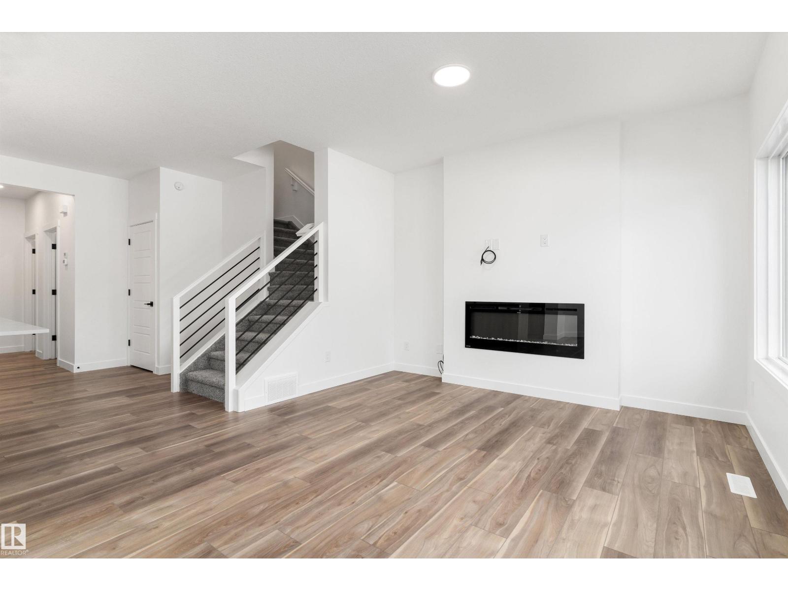 Built by Sterling Homes, this beautifully designed front-attached home in The Uplands at Riverview offers bright, modern living near trails, parks, and the river valley. Triple pane windows and 9’ ceilings create an airy main floor with a welcoming foyer, built-in bench, and walk-in closet for everyday organization. The open layout features a stylish kitchen with quartz countertops, a large island with seating, upgraded cabinetry, chimney hood fan, full-height tile backsplash, and a corner pantry. The great room feels warm with an electric fireplace and large windows, while a sliding patio door opens to the backyard. Upstairs, the primary suite includes two walk-in closets and a 4-piece ensuite with double sinks and a glass shower. A cozy loft, two bedrooms, full bath, and upper laundry complete the level. With luxury vinyl plank flooring, upgraded railings, side entrance, basement rough-ins, and an oversized double attached garage with floor drain, this home blends comfort and thoughtful design. (id:63190)