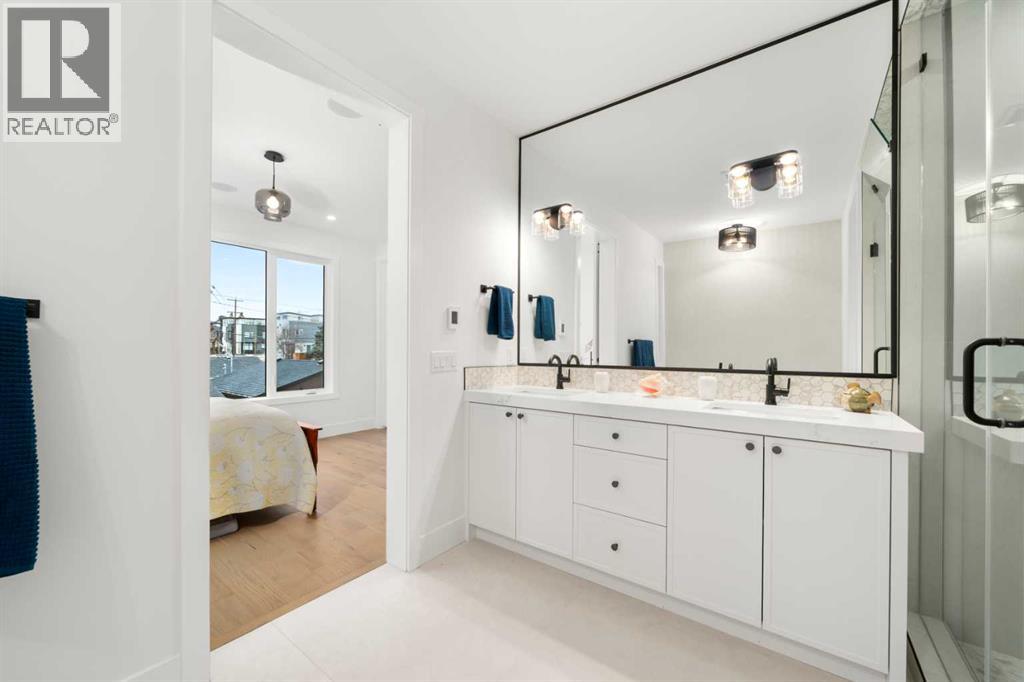 ** Open House: Sunday, April 19th 12-3pm ** Located in the highly sought after community of Altadore with exceptional access to parks, shops, coffee spots, dining, local boutiques, and more, 2006 41 Ave SW is a striking modern duplex that perfectly balances luxury, style, and functionality. This home welcomes you with a charming front porch accented by brick pony walls, leading into a bright and open concept main floor designed for both everyday living and entertaining. The spacious dining area flows seamlessly into the gourmet kitchen, featuring an oversized island, sleek quartz countertops, premium appliances, and custom ceiling height cabinetry. The cozy living room is anchored by a gas fireplace with built in shelving, while patio doors open to a private back deck, ideal for effortless indoor and outdoor living. A functional mudroom and convenient powder room complete the main level.Upstairs, the second-floor features two spacious secondary bedrooms. The first offering a gorgeous spa inspired ensuite with a walk-in shower, deep soaker tub, dual vanities, in floor heating, and a spacious walk-in closet. The second bedroom includes its own walk in closet and private bathroom access, while a charming reading nook or office area adds flexibility to the upper floor. A dedicated laundry room completes this level.The third level is dedicated to the primary master suite, creating a private top floor retreat. This luxurious space features dual walk-in closets and a spa inspired ensuite complete with a steam shower, deep soaker tub, dual vanities, heated floors, and in closet built in custom wood wardrobes, offering exceptional comfort and versatility. A bright and open bonus area with a wet bar and access to a private balcony showcasing impressive views further enhances this level, making it perfect for both relaxing and entertaining.The fully finished basement expands the living space with a large recreation room complete with a built in media center and wet bar, a n office or gym area, ample storage, a full bathroom, and an additional bedroom with a walk-in closet, ideal for guests or family. The basement also includes in floor heating rough in, offering future potential for added comfort.Additional highlights include AC rough in for future installation and a double detached garage providing secure parking and extra storage. This exceptional property delivers modern luxury, thoughtful design, and everyday practicality in one of Calgary’s most desirable inner-city neighborhoods. (id:63190)