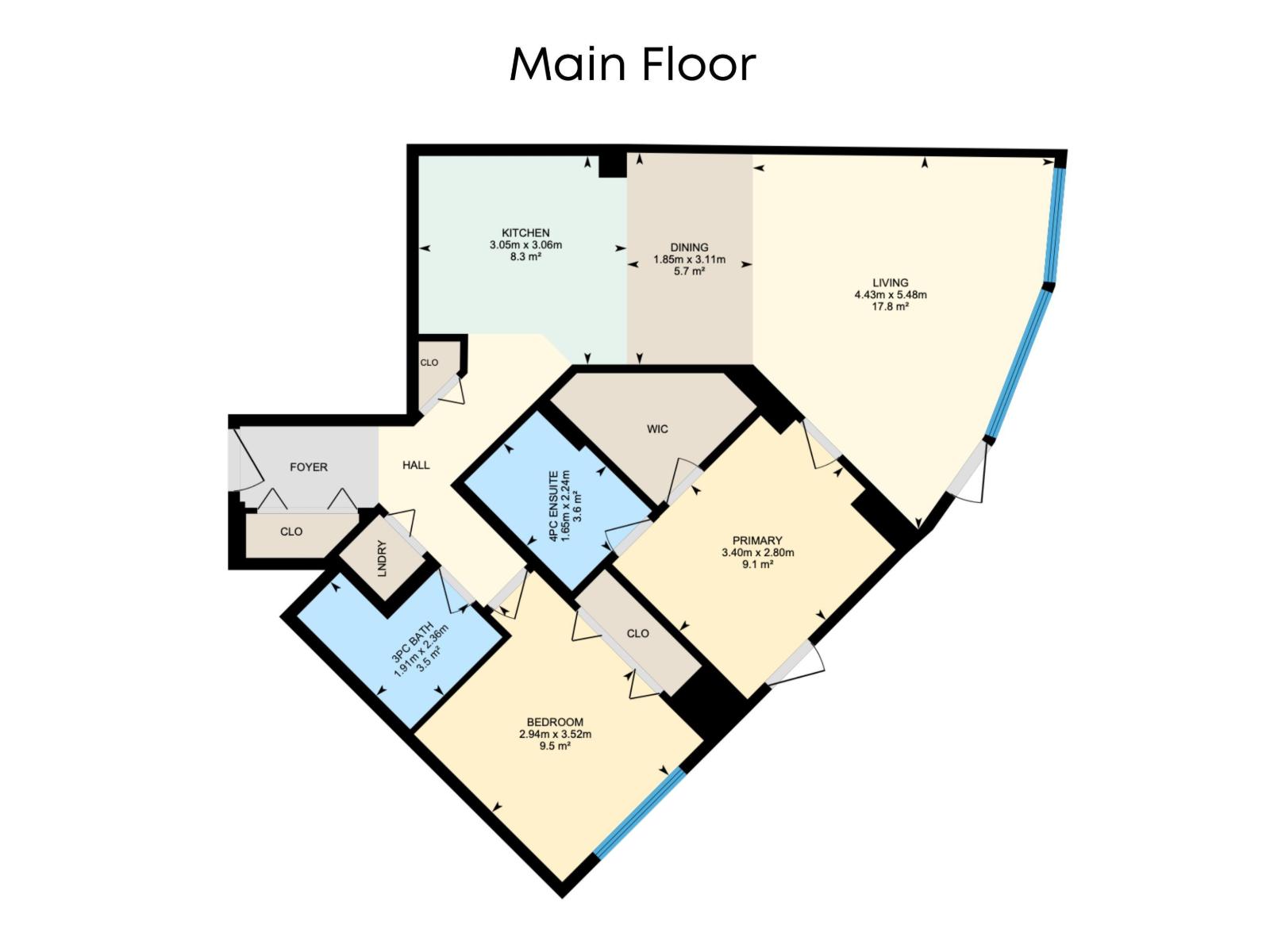 | Primary Bedroom | Main level | 3.4m x 2.8m | — |