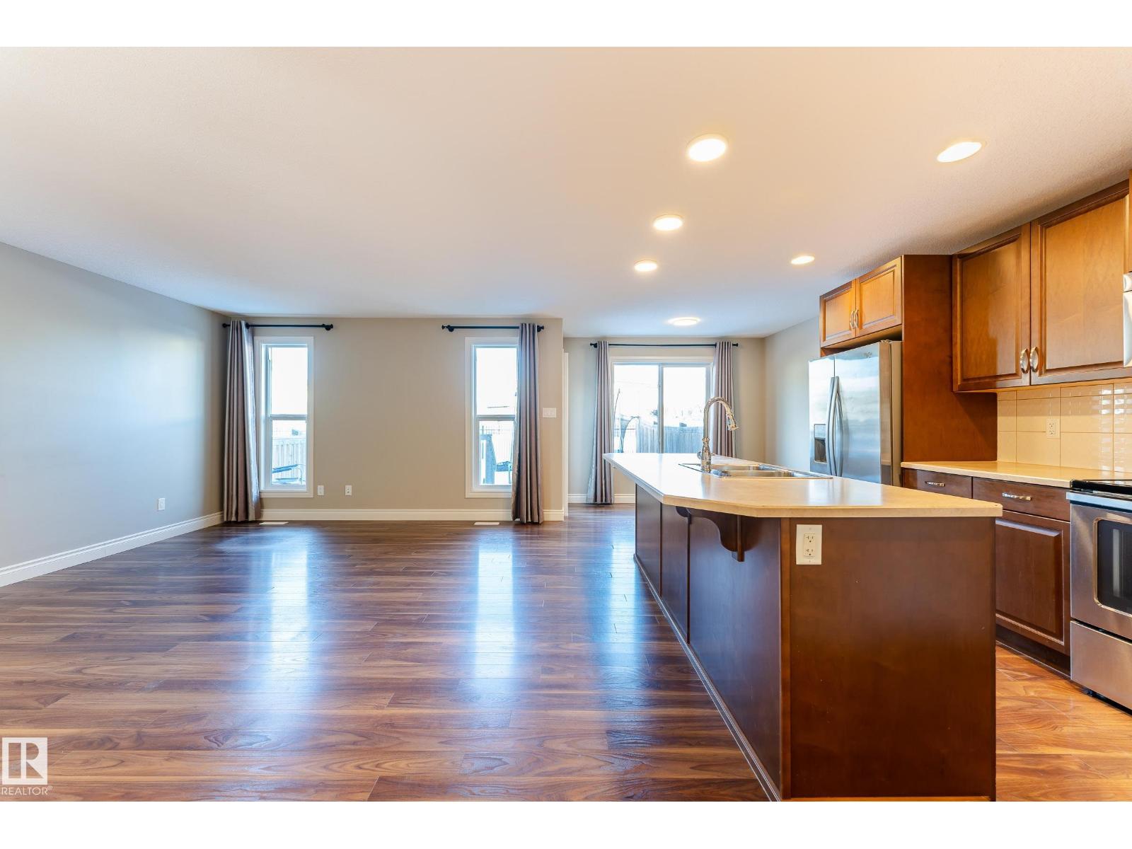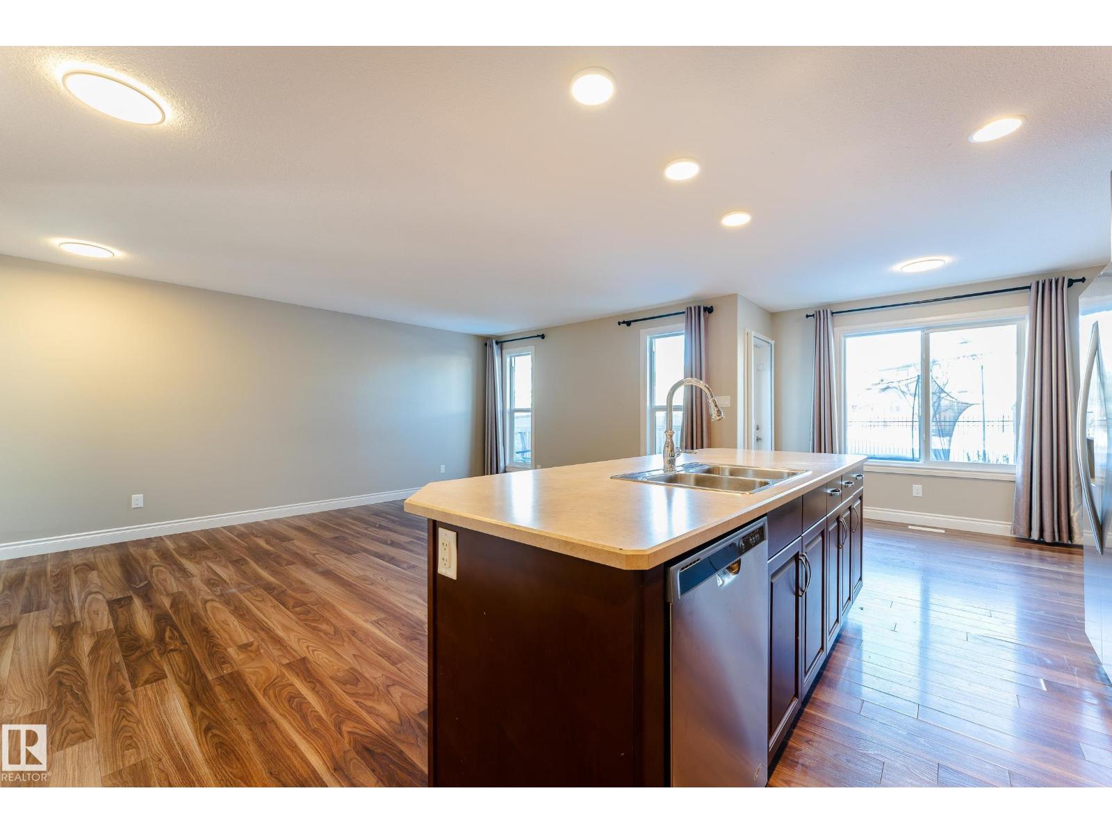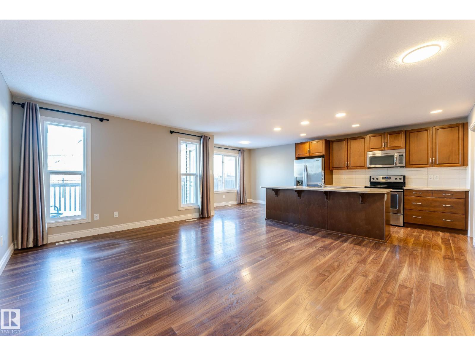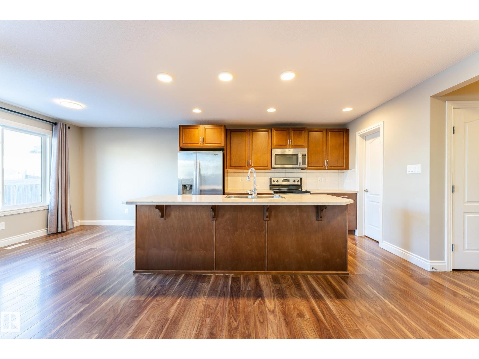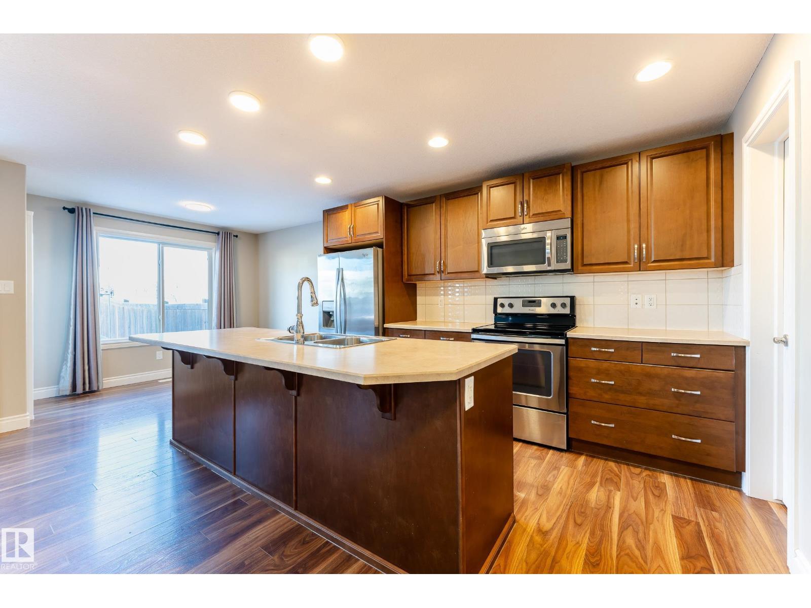 This beautiful TRAIL-BACKING DOUBLE CAR GARAGE half-duplex is located in Langdale. The OPEN CONCEPT kitchen/family/dining room features large windows allowing for plenty of natural light. Kitchen has plenty of cabinetry and walk-in pantry, loads of counter space, bar top seating & UPGRADED SS appliances! Upstairs you'll find 3 bedrooms and 2-bathrooms. The master bedroom featuring its en-suite and large WALK-IN-CLOSET. Upstairs wood railing and laundry is another bonus feature. Basement is awaiting your finishing touch. Excellent access to Henday, Windermere Shopping Center, parks and more! (id:63190)