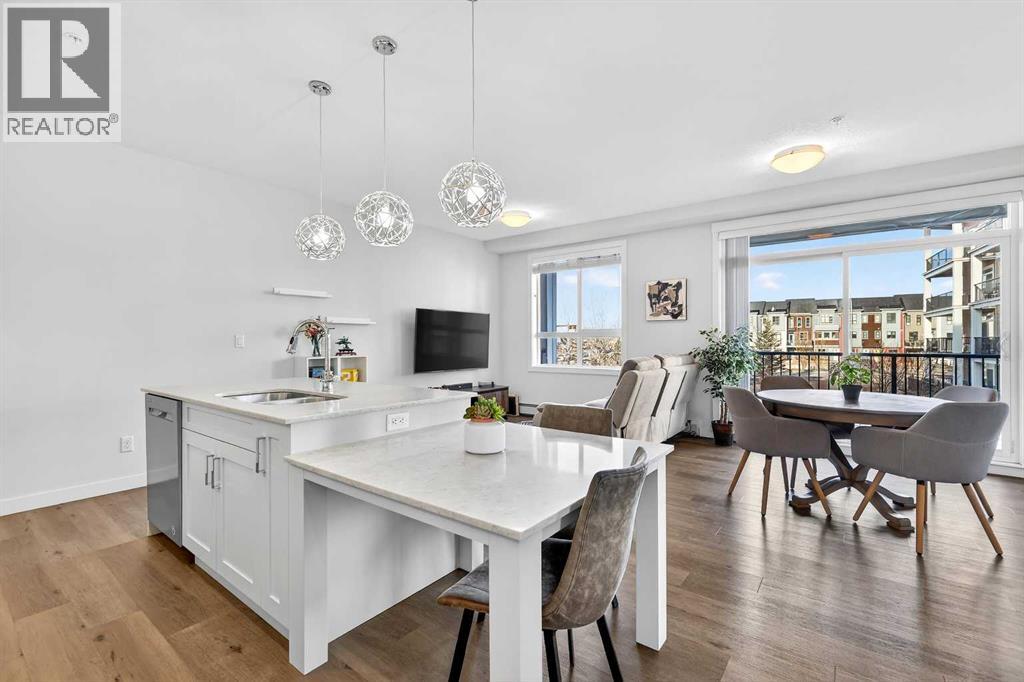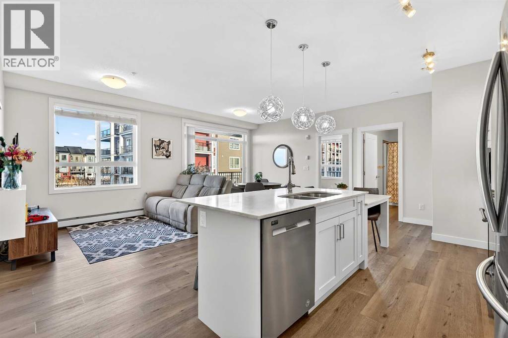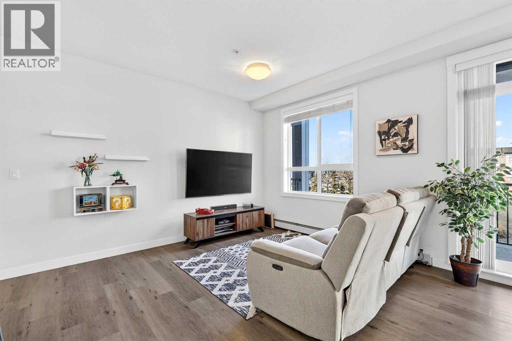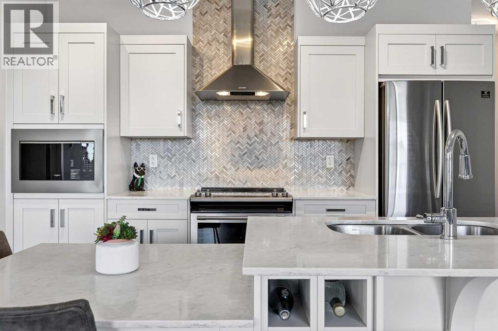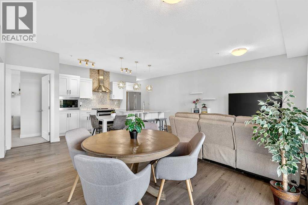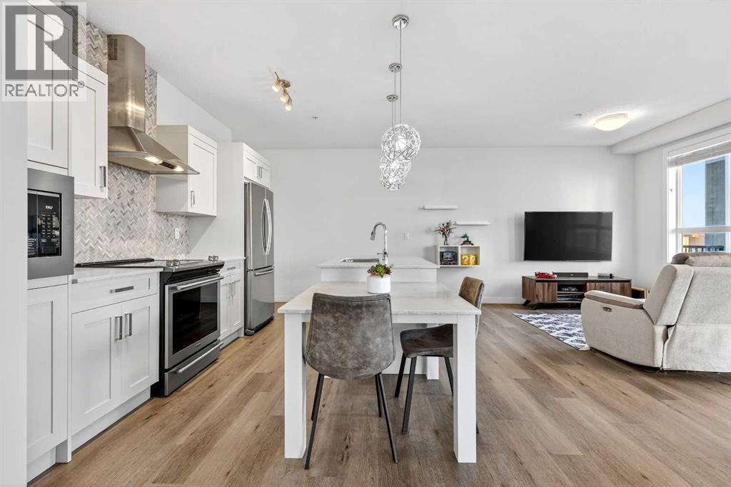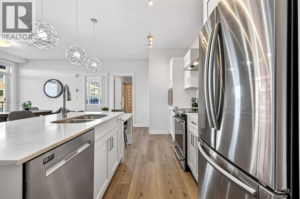 Welcome to this immaculate corner unit featuring TWO TITLED PARKING STALLS (one above ground and the other in the parkade). As you enter, you’re greeted by 9-foot ceilings, an abundance of natural light and a bright open-concept layout with durable luxury vinyl plank flooring throughout the main living space. The modern kitchen showcases modern shaker-style cabinetry with soft close drawers, quartz countertops, upgraded stainless steel appliances with a Samsung French-door refrigerator with ice maker, a sleek chimney hood fan, and a stunning marble herringbone tile backsplash. The extended island provides ample seating and is complemented by stylish pendant lighting, while a convenient pantry with built-in microwave adds extra functionality. The spacious primary bedroom features a walkthrough closet leading to a private ensuite with dual vanities. A second bedroom and full four-piece bathroom offer flexibility for guests, family, or a home office. Step outside to enjoy the generous wrap-around corner balcony complete with a BBQ gas line—perfect for entertaining or relaxing. Ideally located minutes from shopping, dining, and everyday amenities, with easy access to Macleod Trail for a quick commute. Don’t miss this exceptional opportunity—call your favourite realtor to book your private showing today. (id:63190)